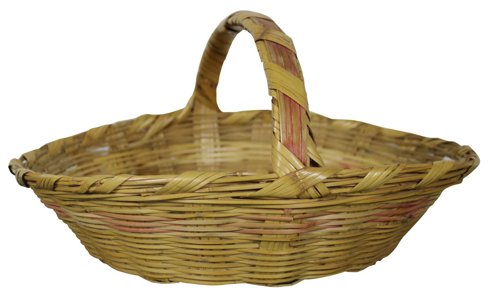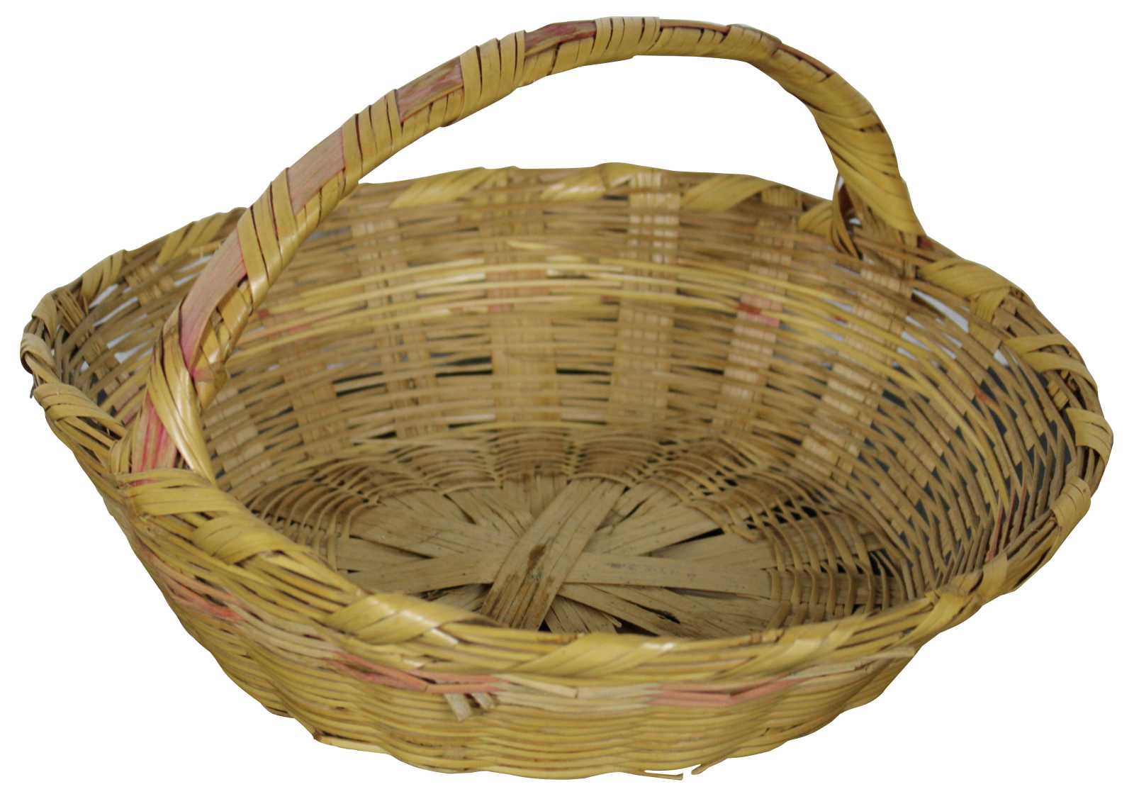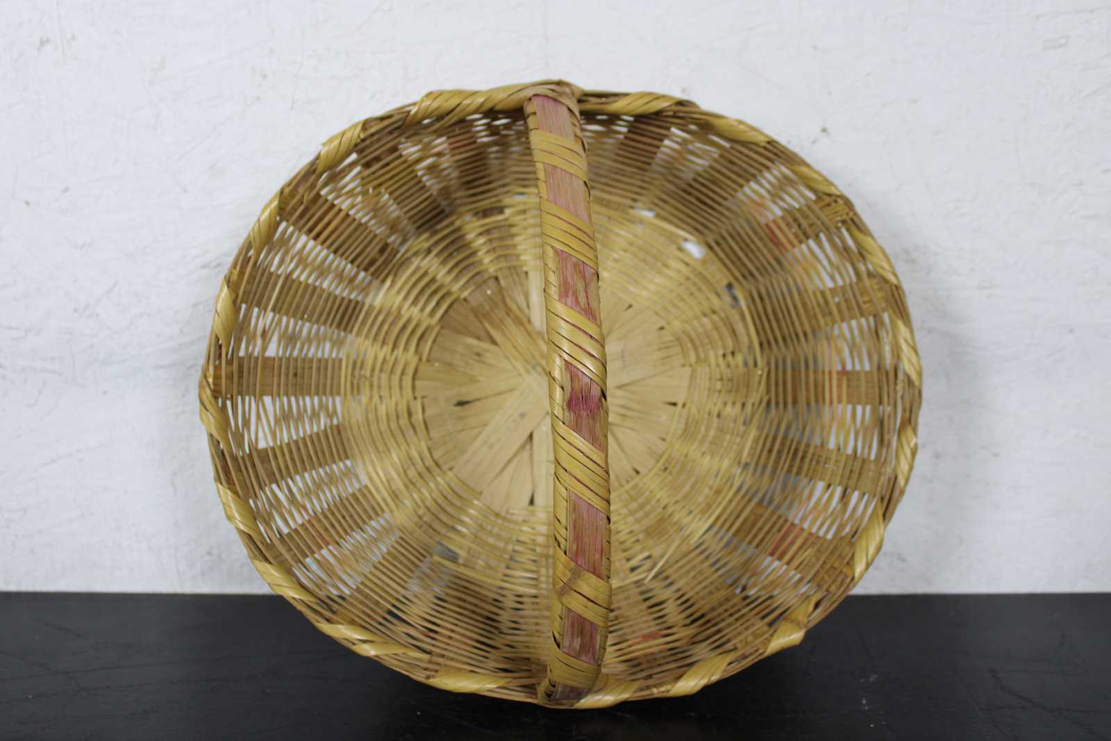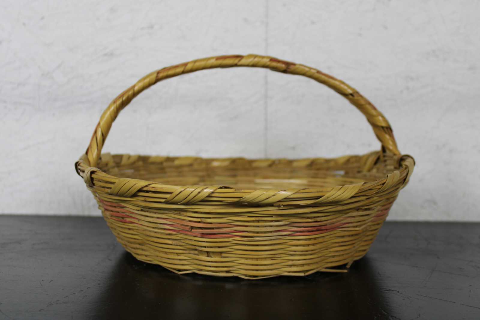 Vintage split wood wicker basket with a low oval shape and stained pink accents.