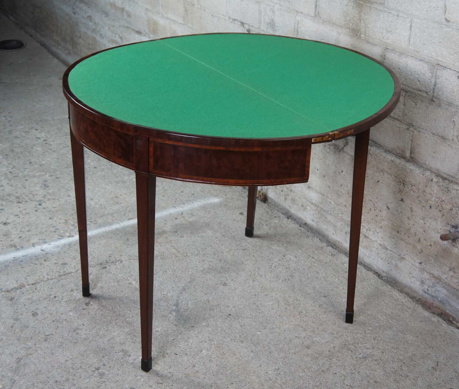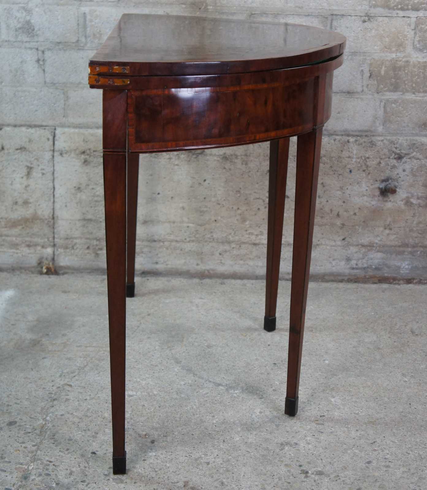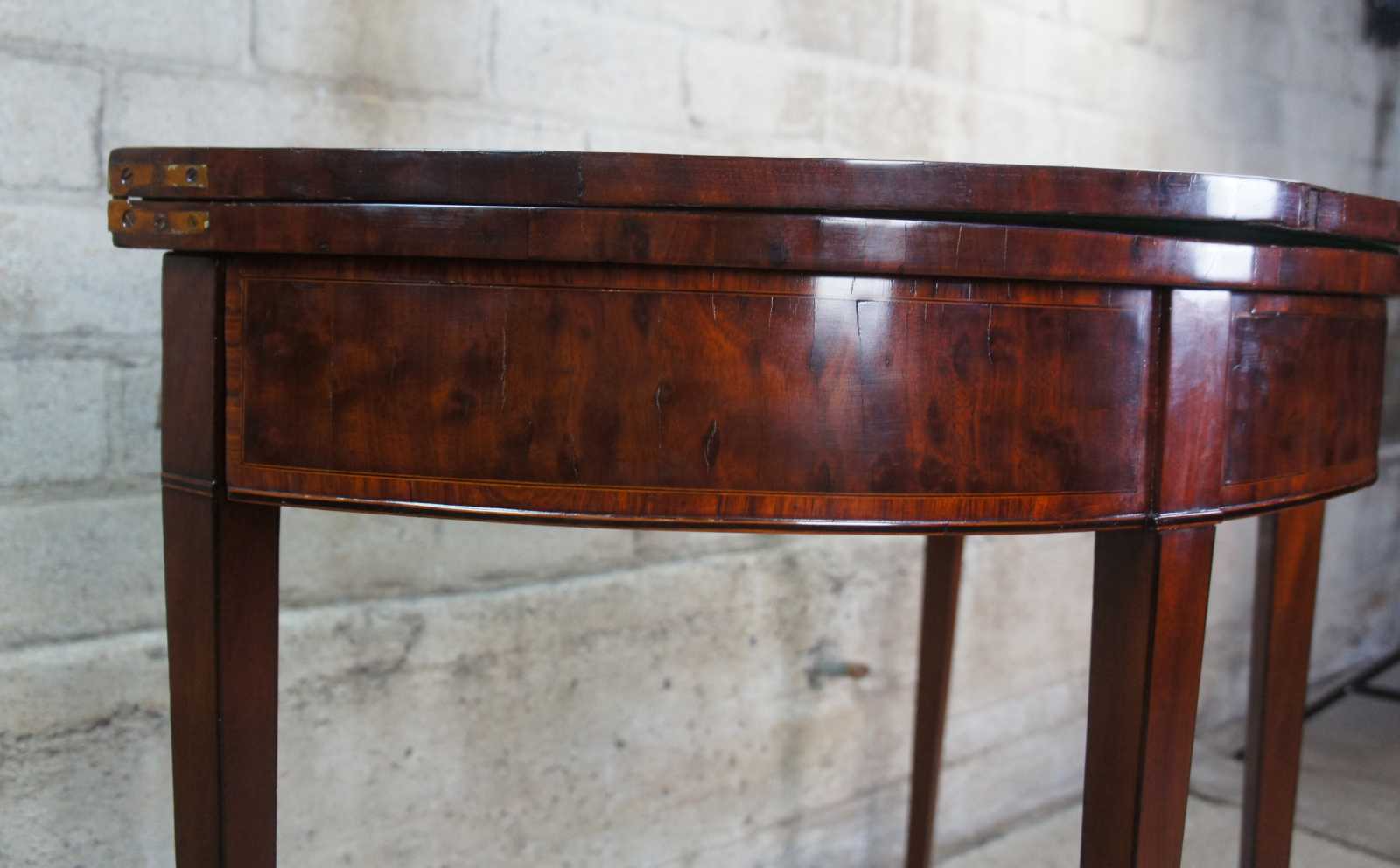 A fine and impressive authentic Hepplewhite period console table, circa 1790s. Made from "Plum Pudding" Mahogany with a demilune, crescent or half moon form. Perfect for use as an entry console table or game table. Features two gate legs along the back side that swing out from wooden hinges to support the flip top. Includes banding along the frame and a green baize game surface. The top is supported by square form tapered legs leading to spade feet.