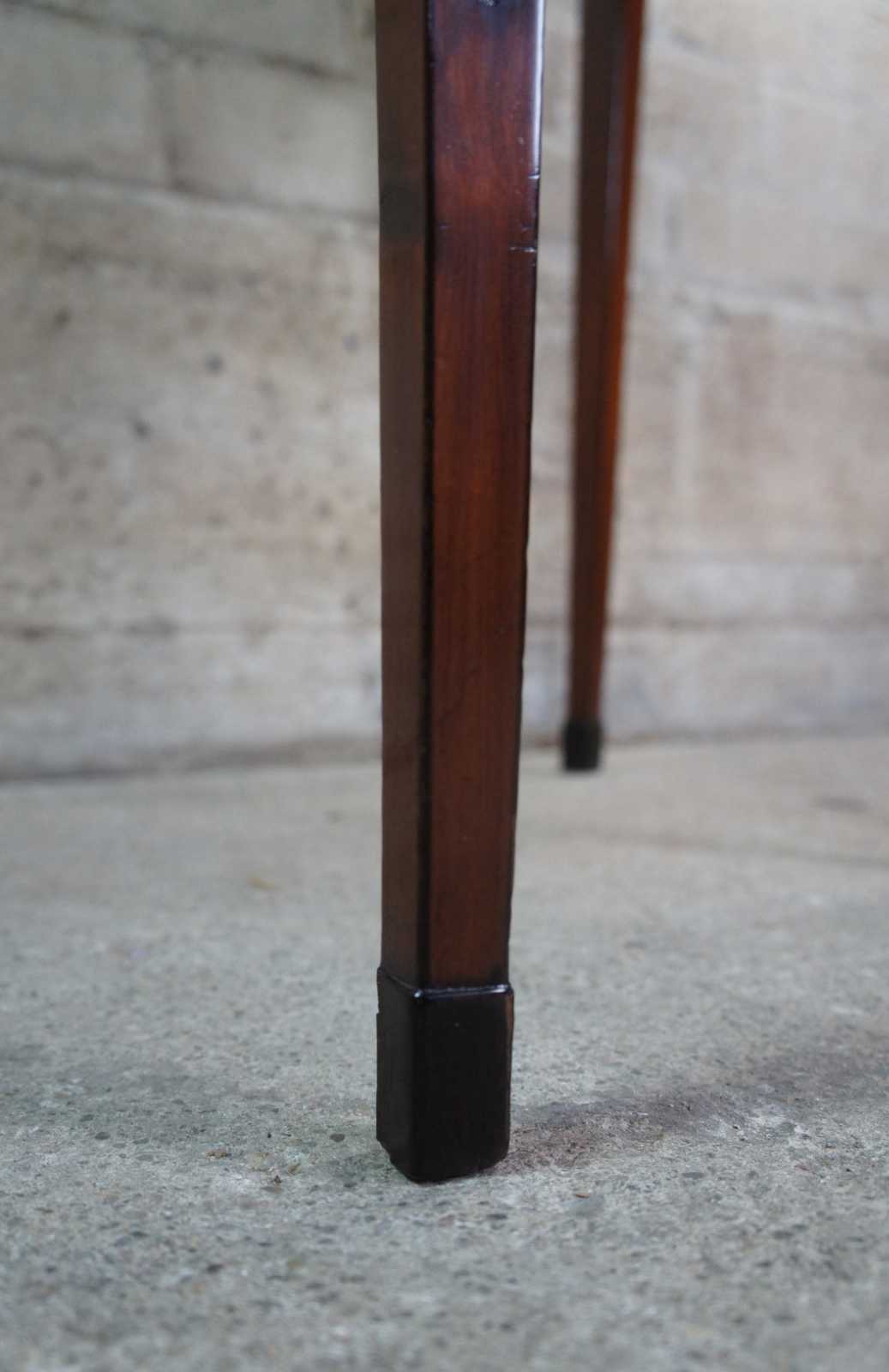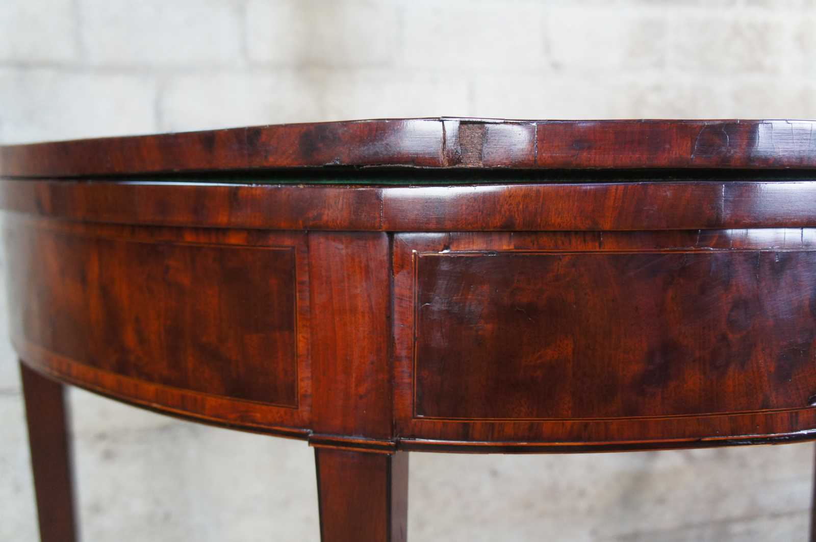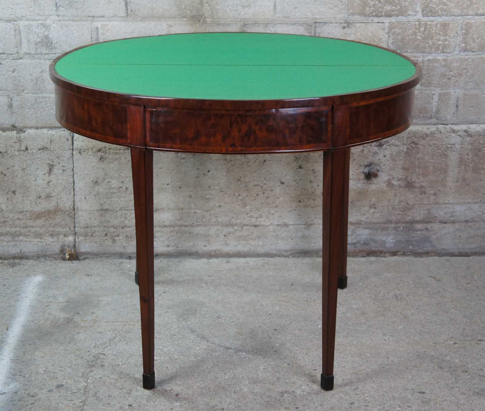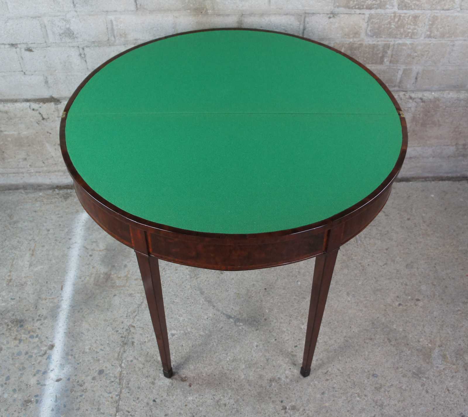 A fine and impressive authentic Hepplewhite period console table, circa 1790s. Made from "Plum Pudding" Mahogany with a demilune, crescent or half moon form. Perfect for use as an entry console table or game table. Features two gate legs along the back side that swing out from wooden hinges to support the flip top. Includes banding along the frame and a green baize game surface. The top is supported by square form tapered legs leading to spade feet.