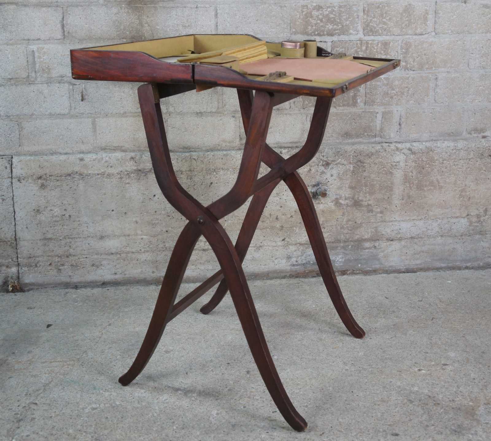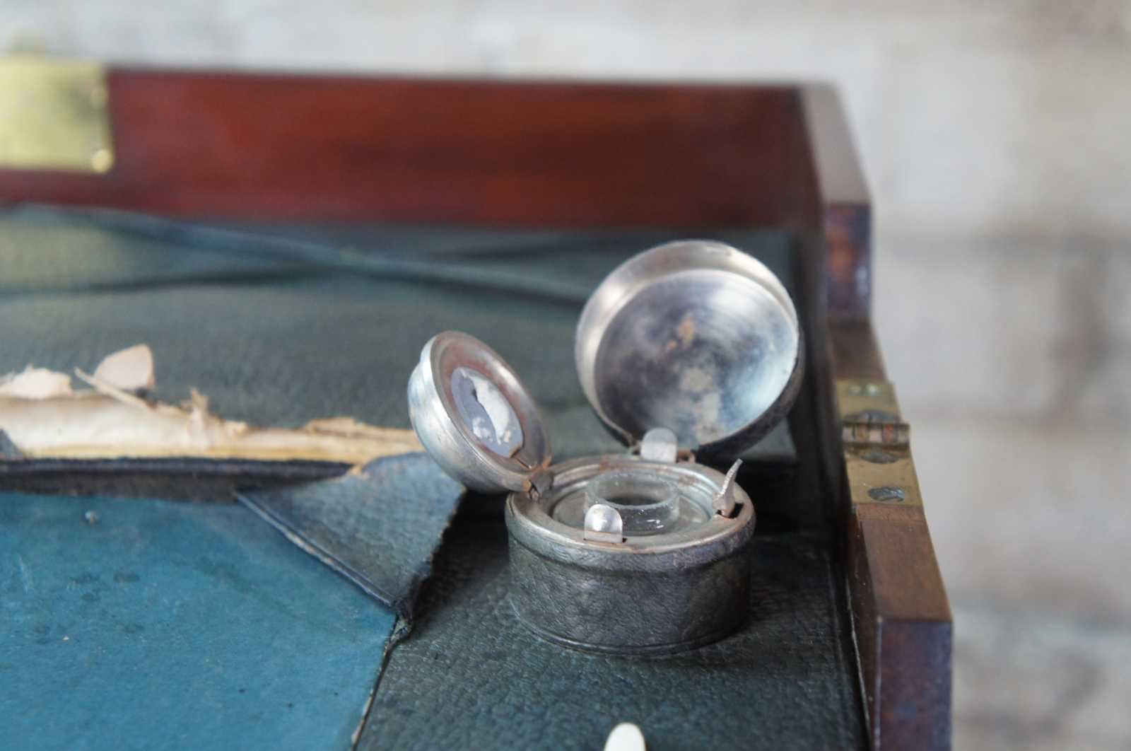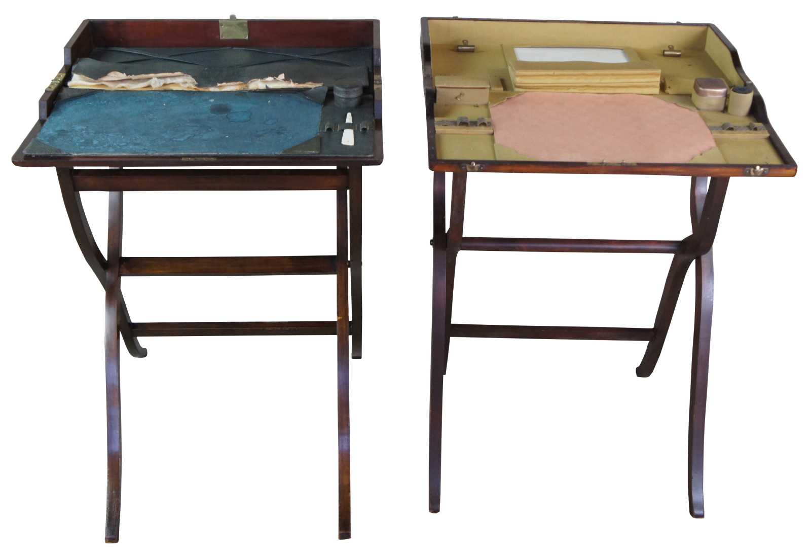 2 Civil War era British campaign writing desks. Made of mahogany featuring a folding form that opens to a writing surface complete with inkwells and letter storage. Slightly different forms and interiors, one boasting a needlepoint exterior design.