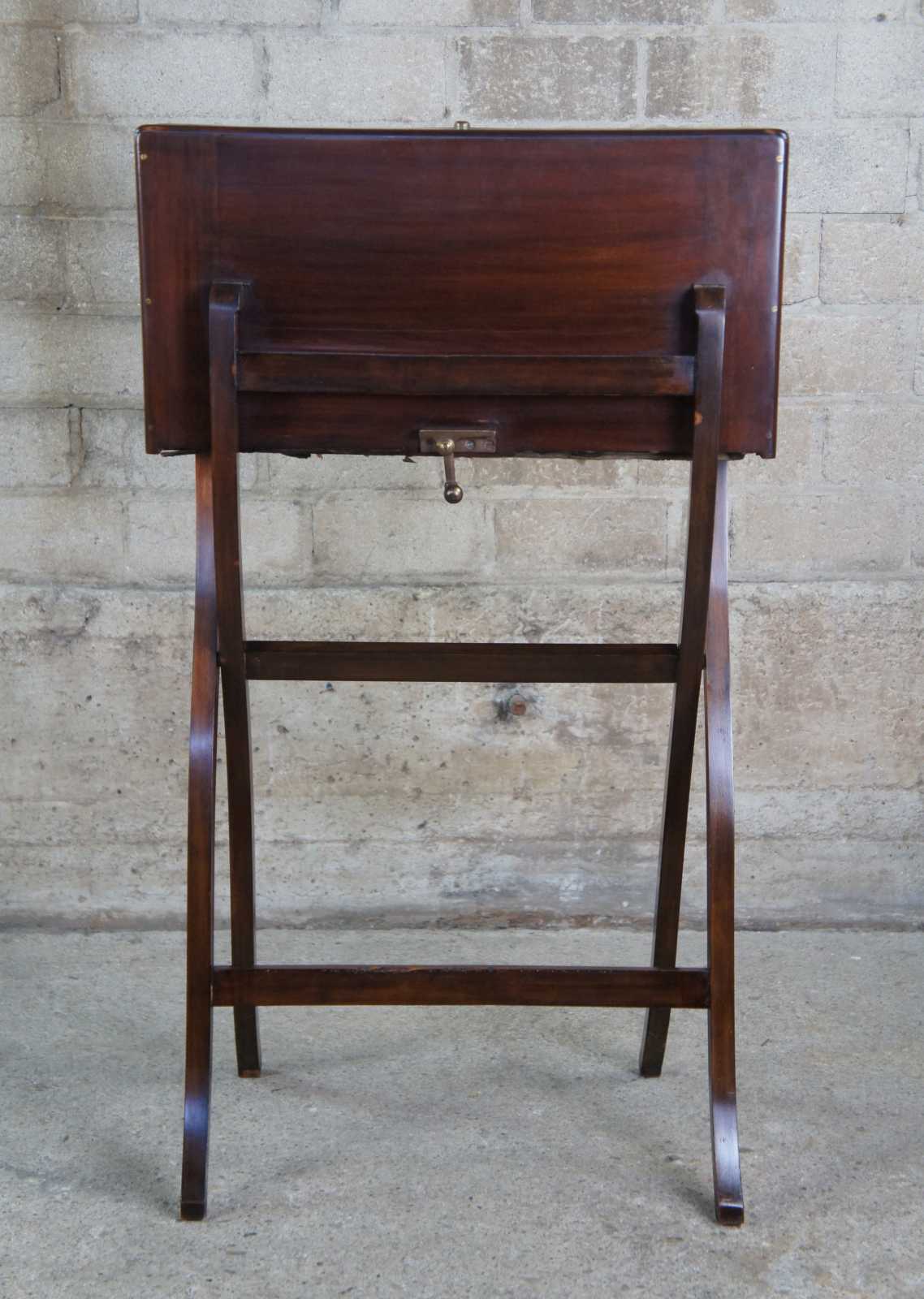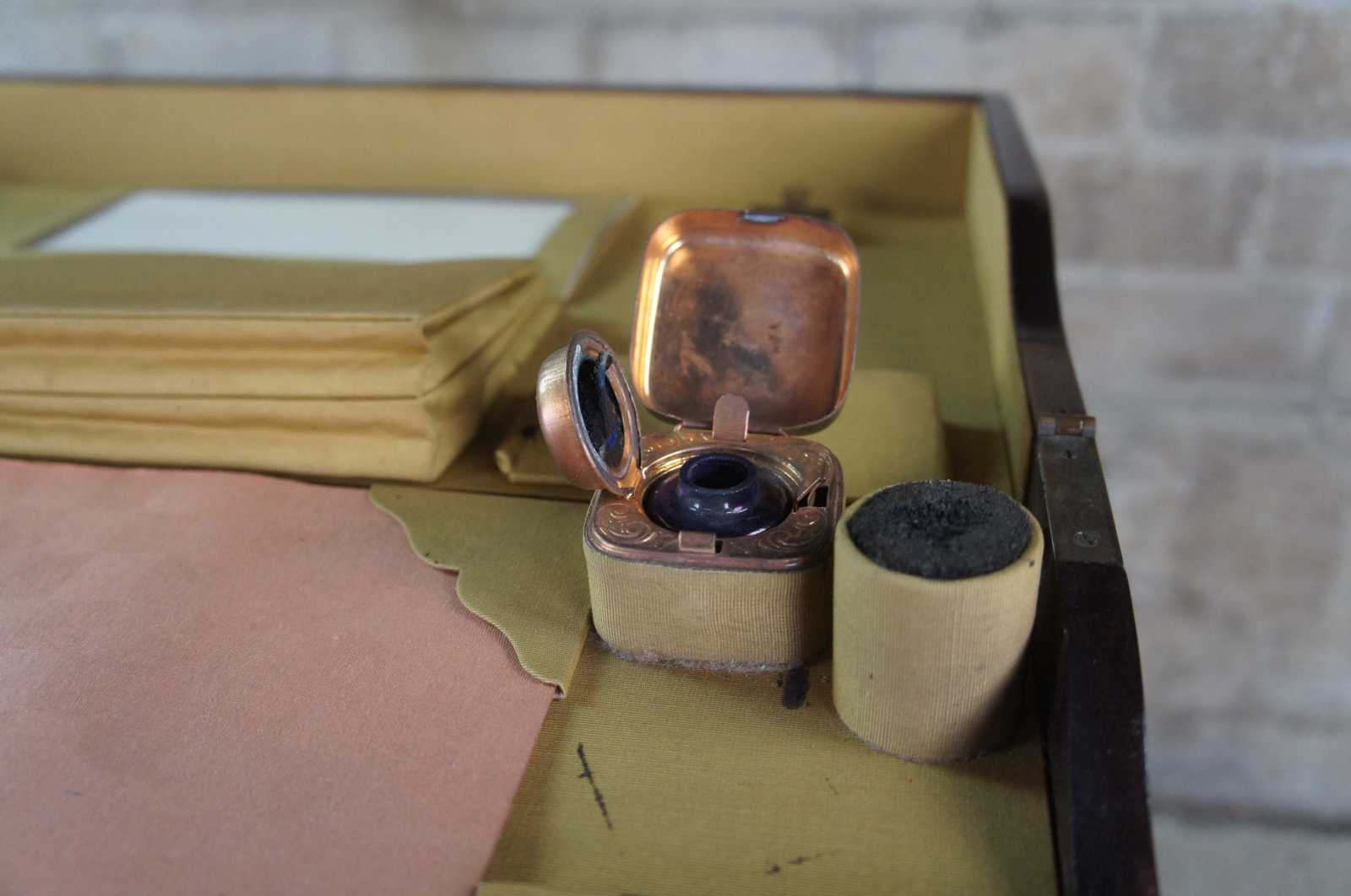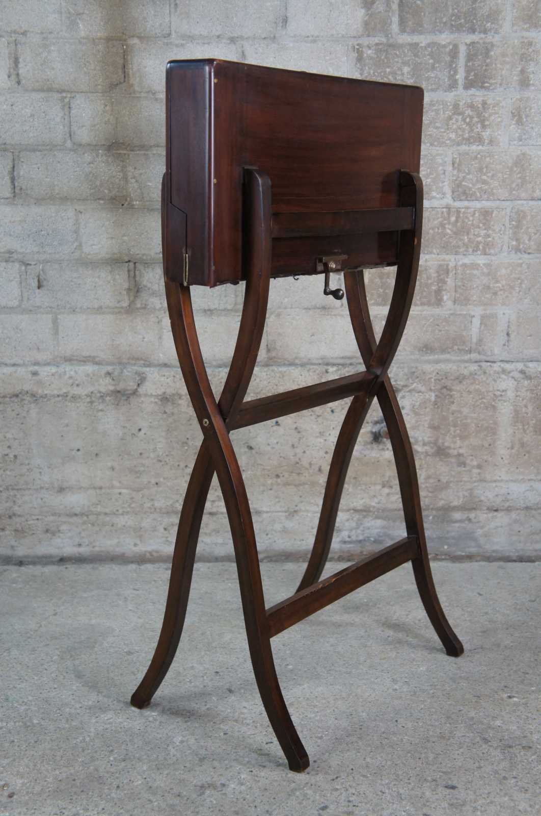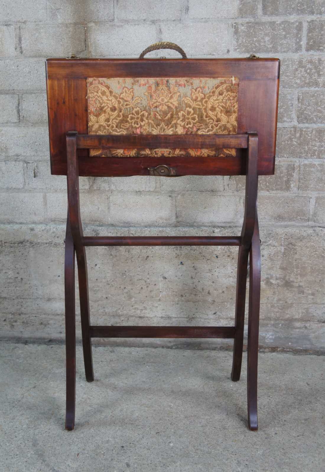2 Civil War era British campaign writing desks. Made of mahogany featuring a folding form that opens to a writing surface complete with inkwells and letter storage. Slightly different forms and interiors, one boasting a needlepoint exterior design.
