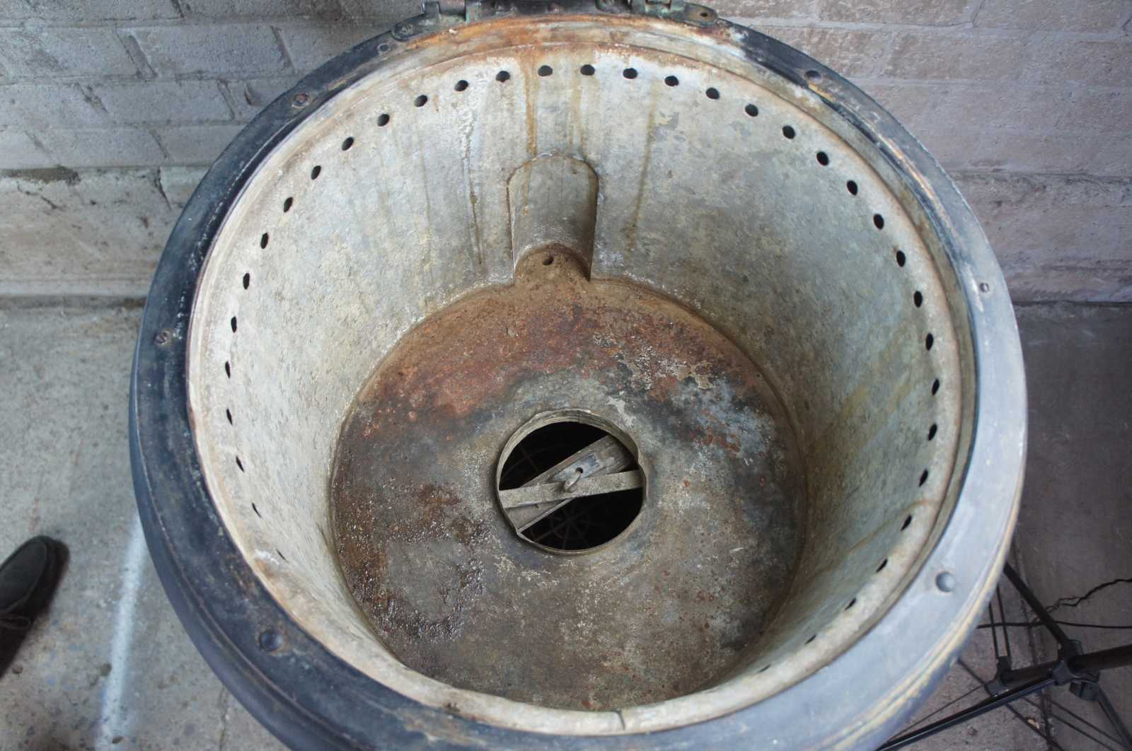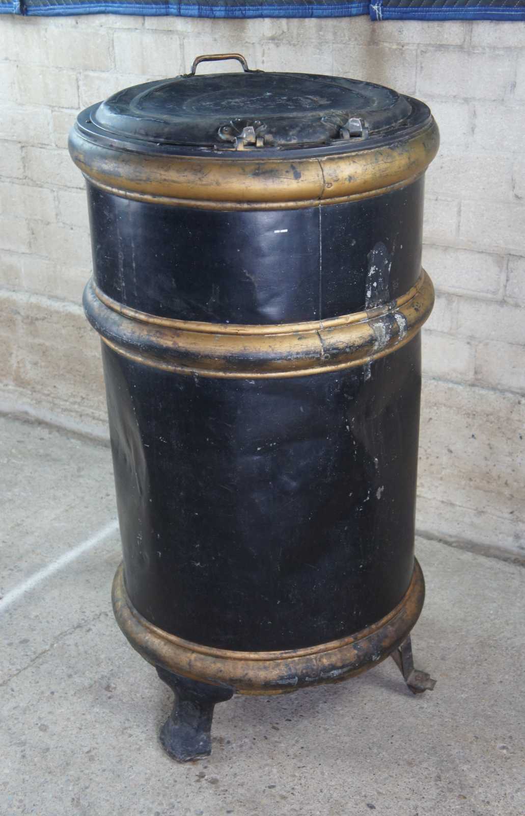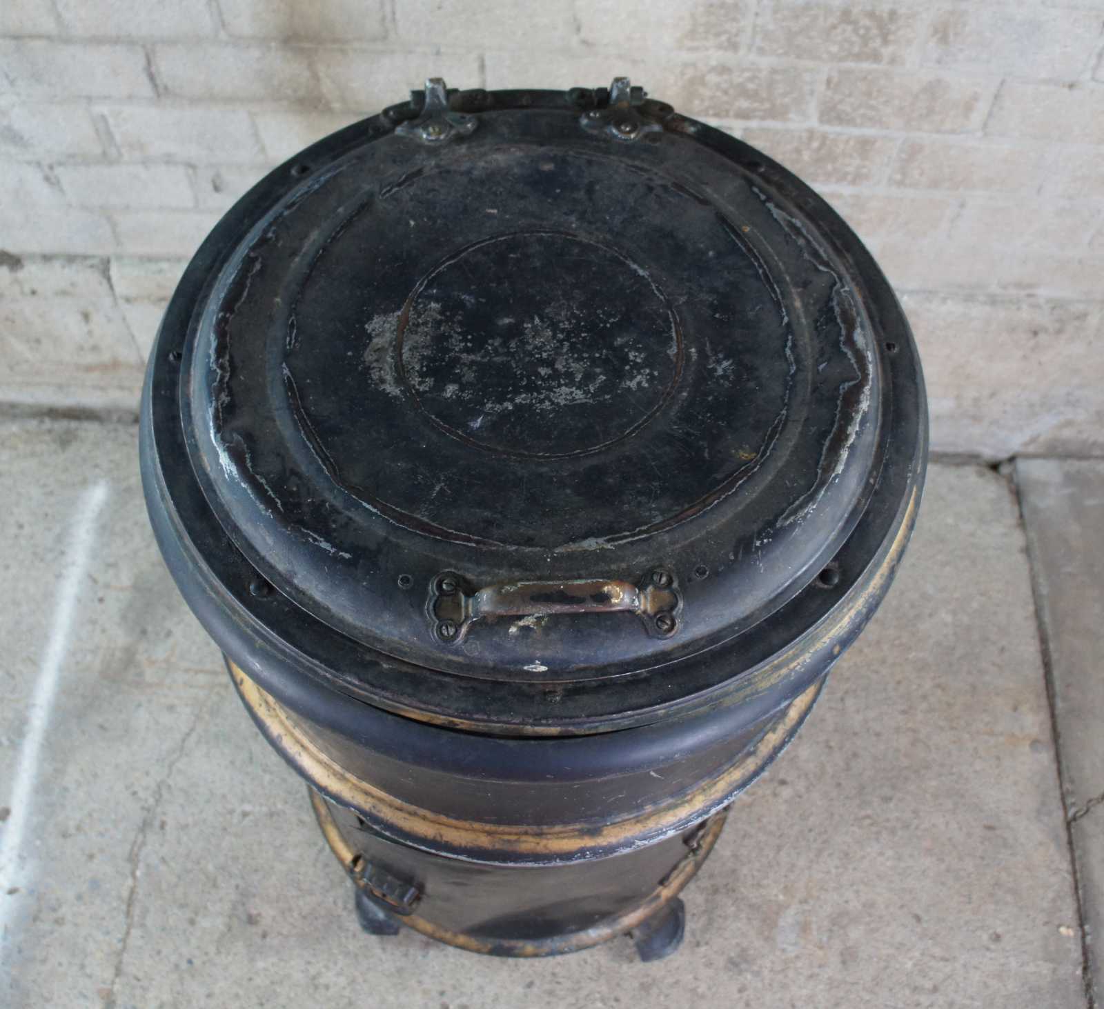 Antique pressed steel ice box refrigerator, with industrial design, hinged lid and door, with three round iron revolving shelves, supported by four shaped legs. Made in Jackson Michigan