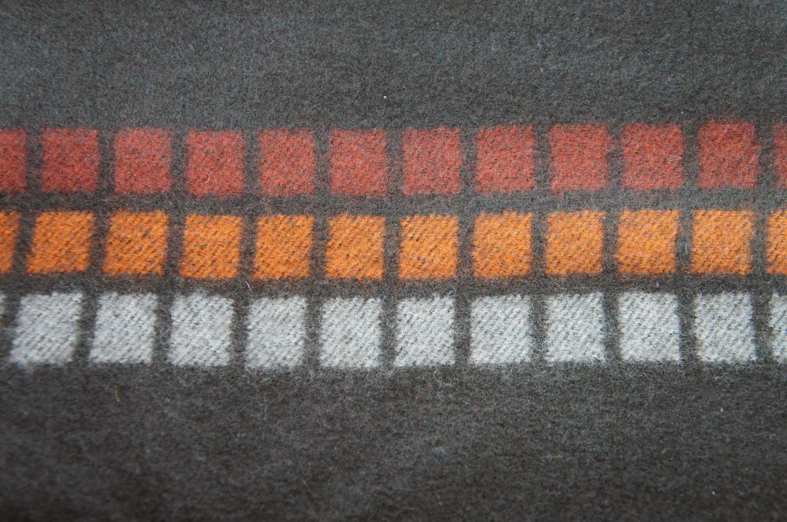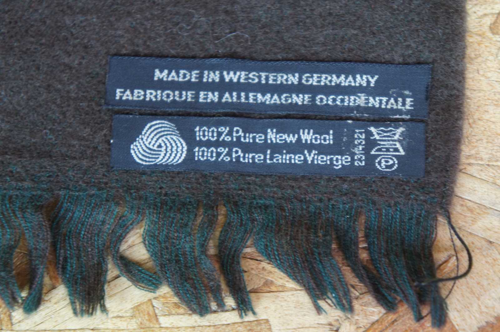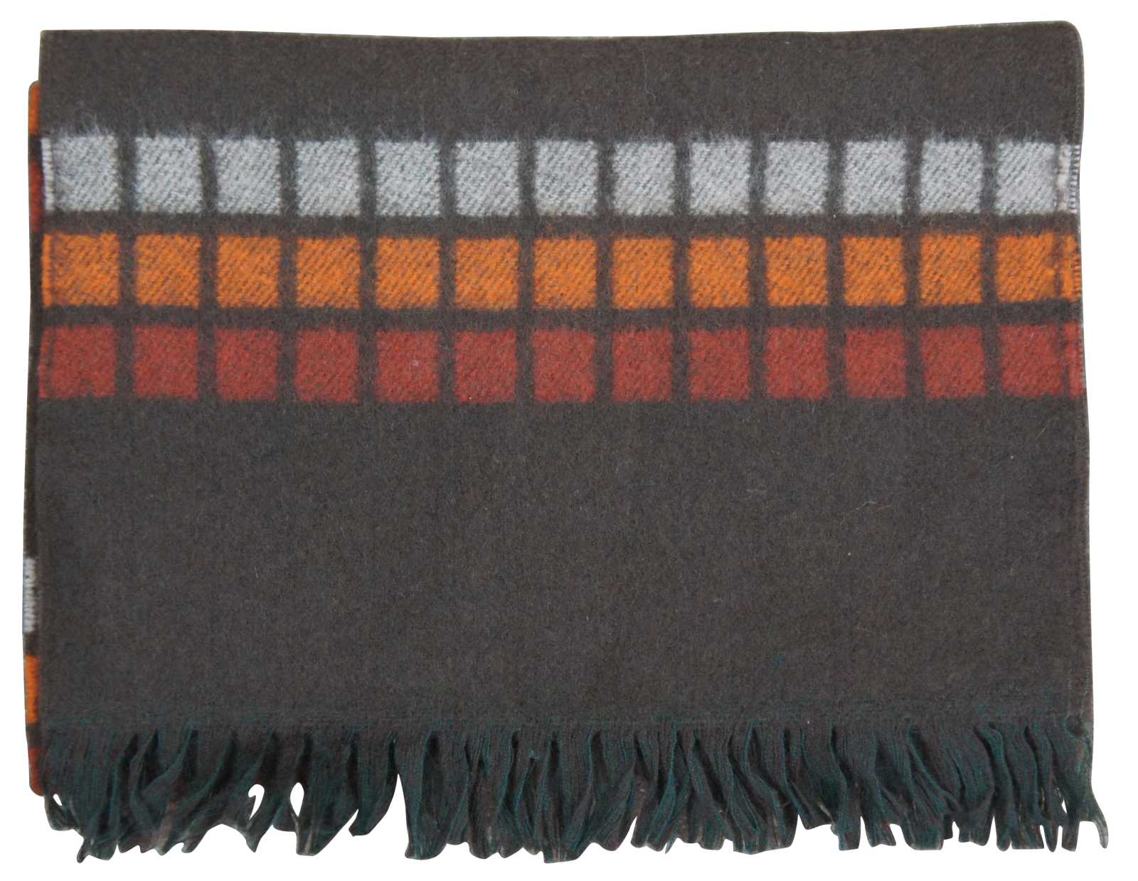Vintage Western Germany scarf or stole. Made of 100% wool featuring a brown base with geometric square banding of red, orange and white.