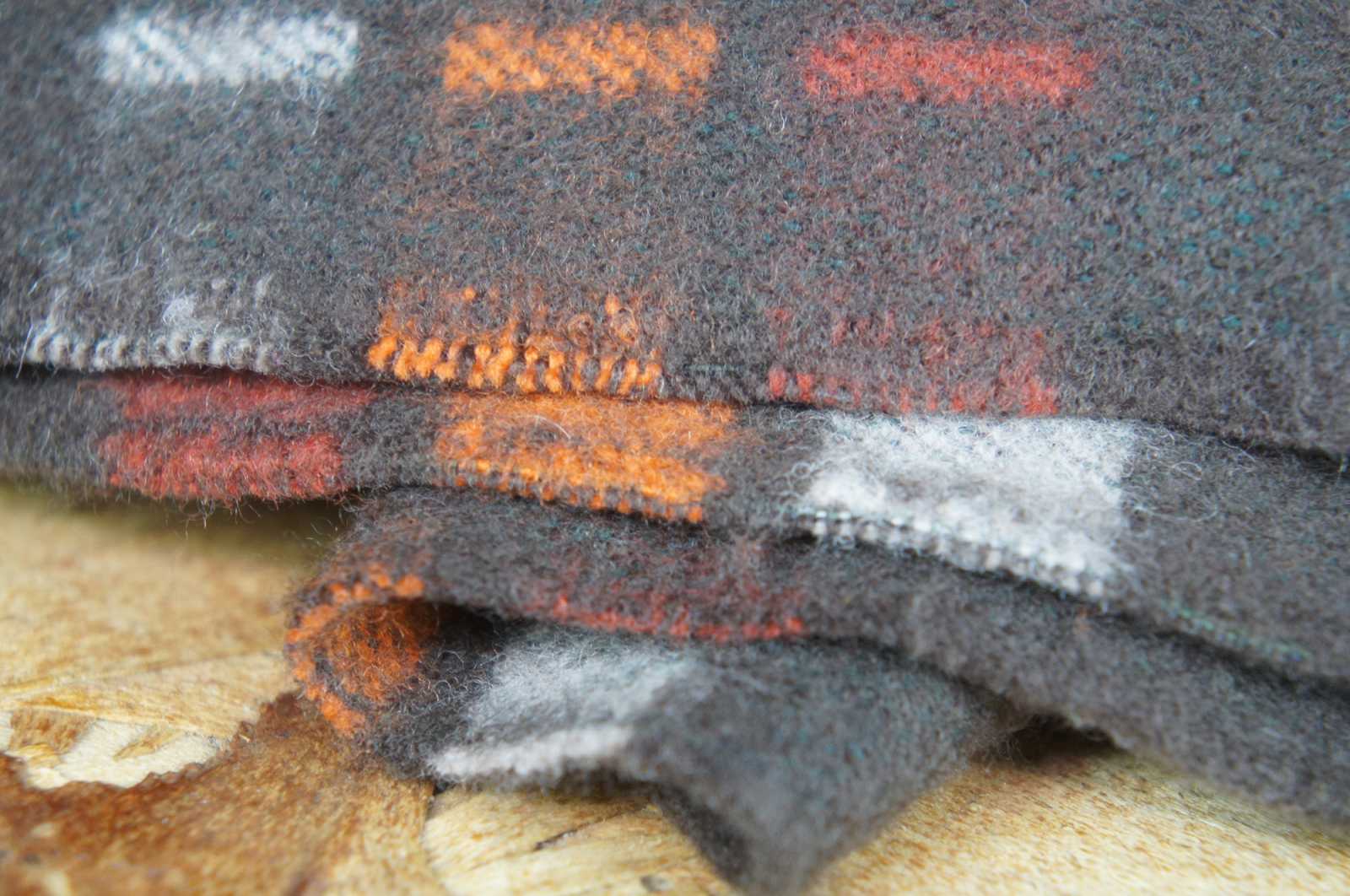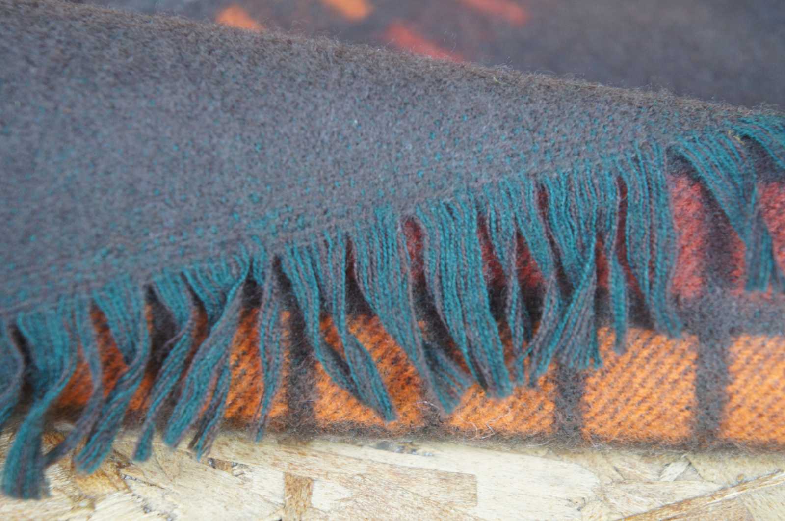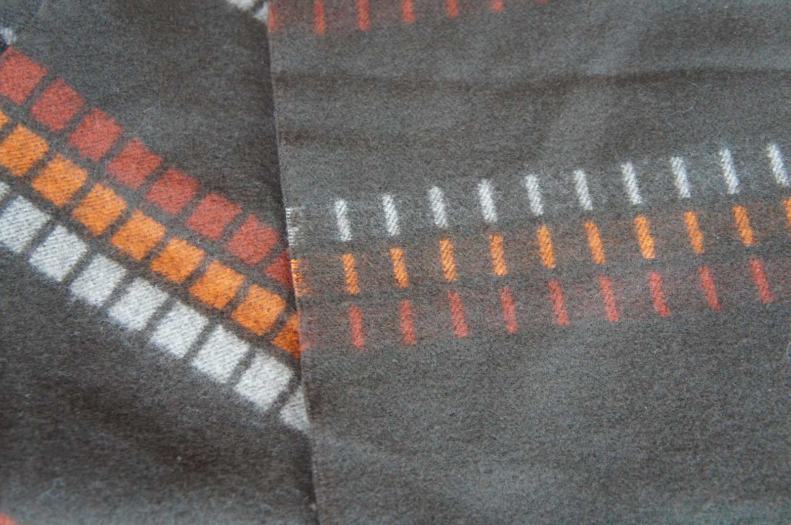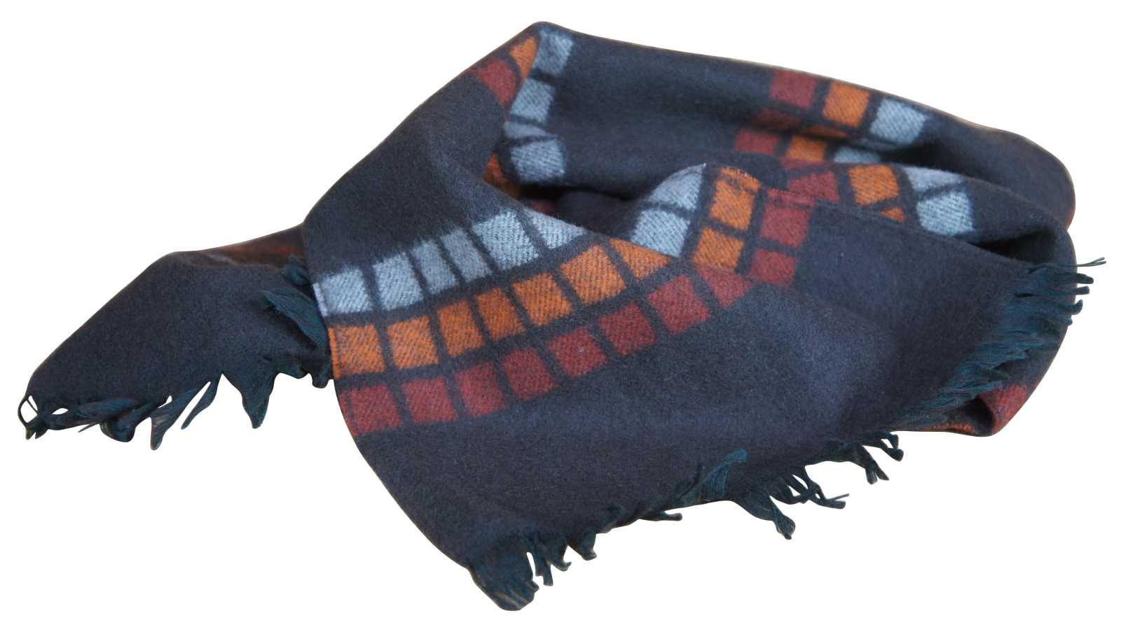 Vintage Western Germany scarf or stole. Made of 100% wool featuring a brown base with geometric square banding of red, orange and white.