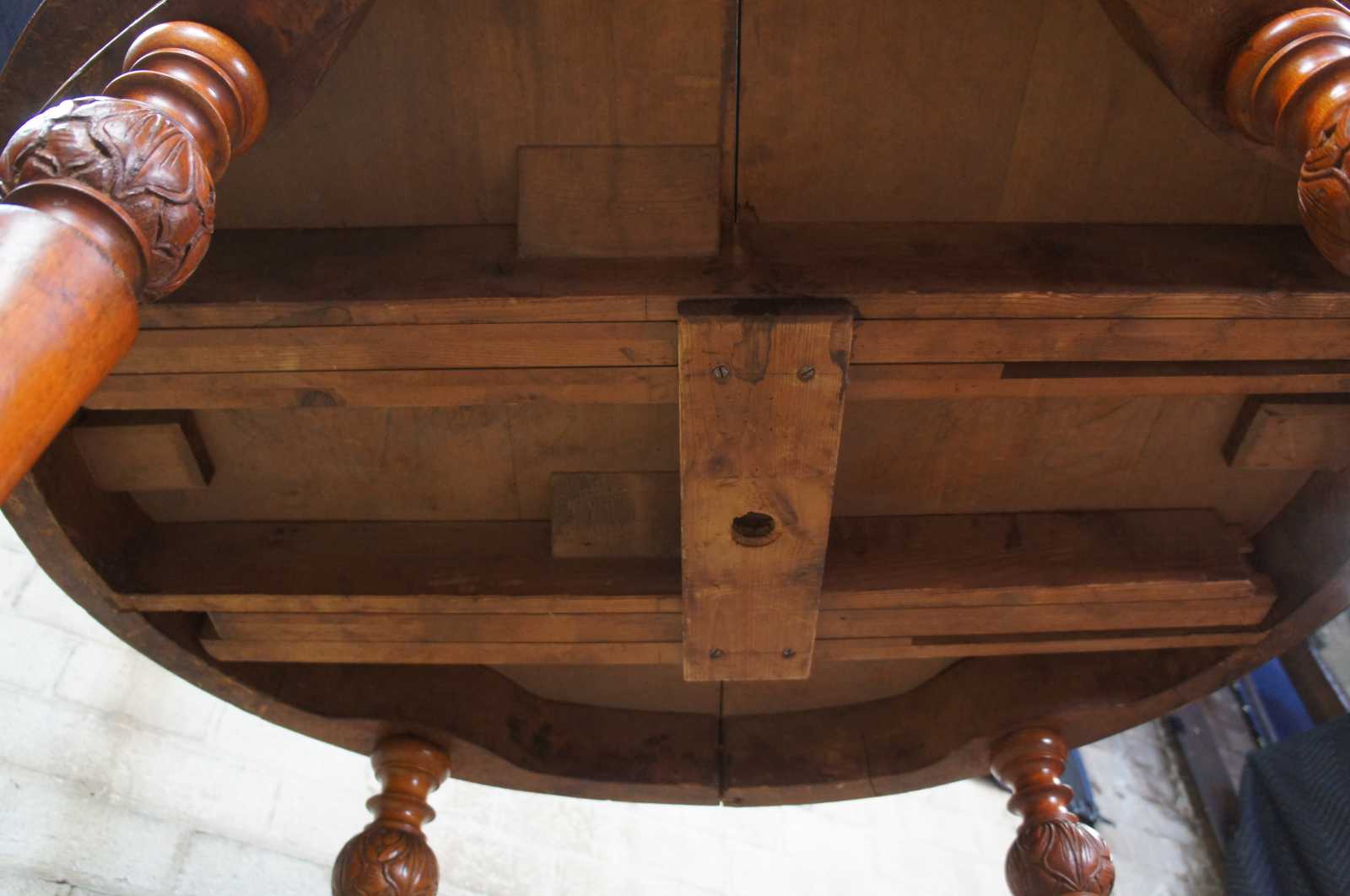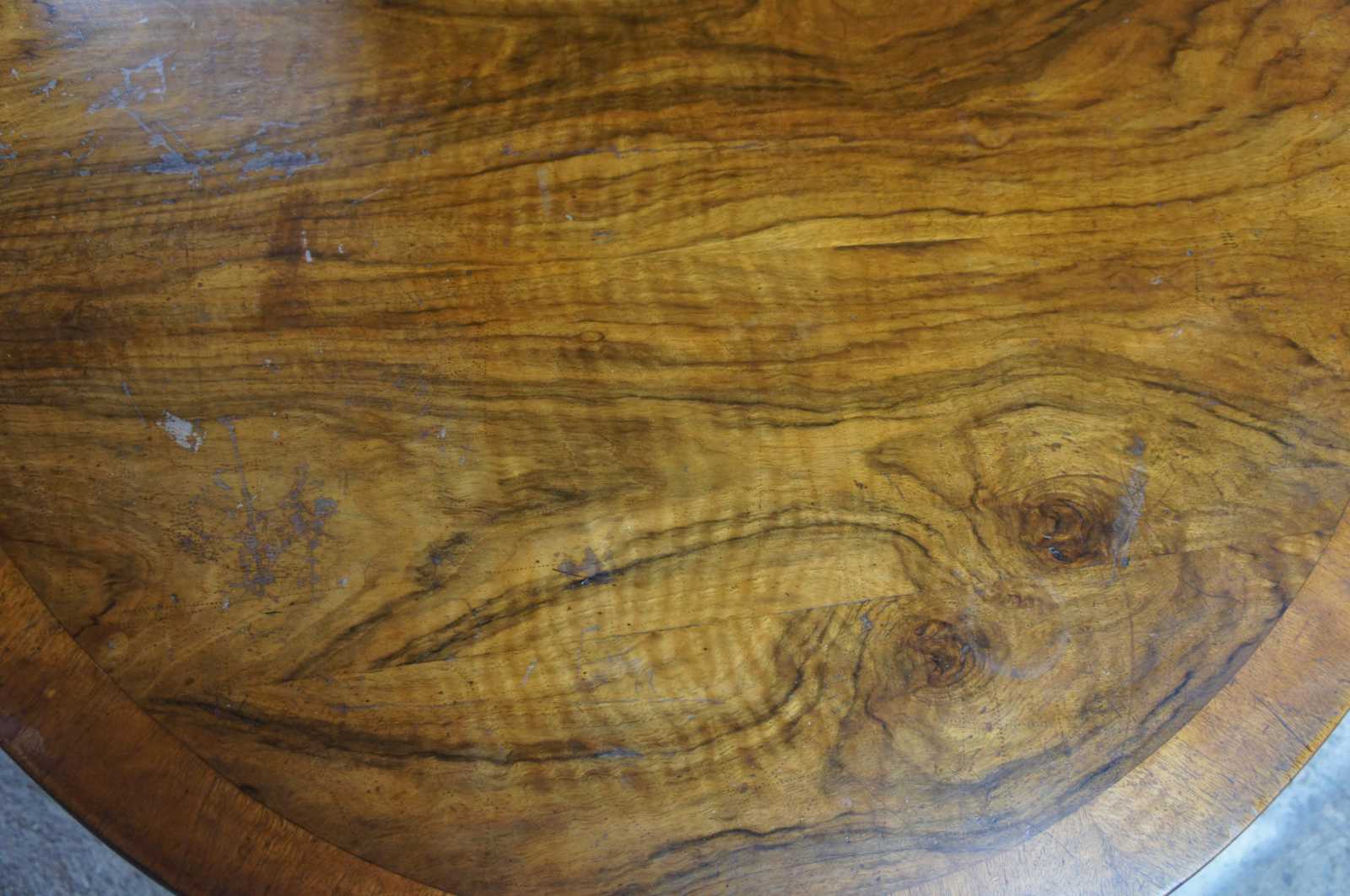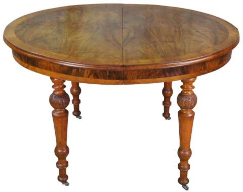 Antique Victorian dining or breakfast table. Made of Crotch Walnut featuring ovular or rounded form with circular banding and carved turn legs with castors.