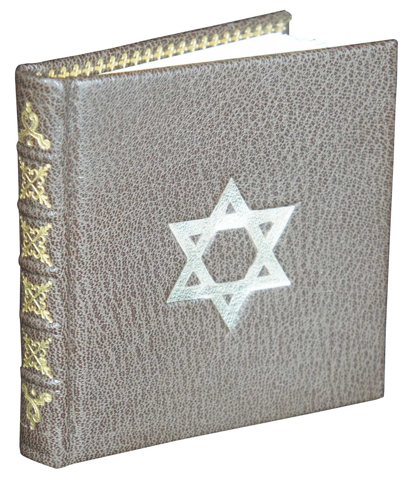 Vintage leather journal / diary / note / scrap book featuring Star of David embossing and rare antique pop up / raised ephemera chromolithograph cut out cards / prints showing various Jewish life events / holidays / traditions. Hard bound with storage case.