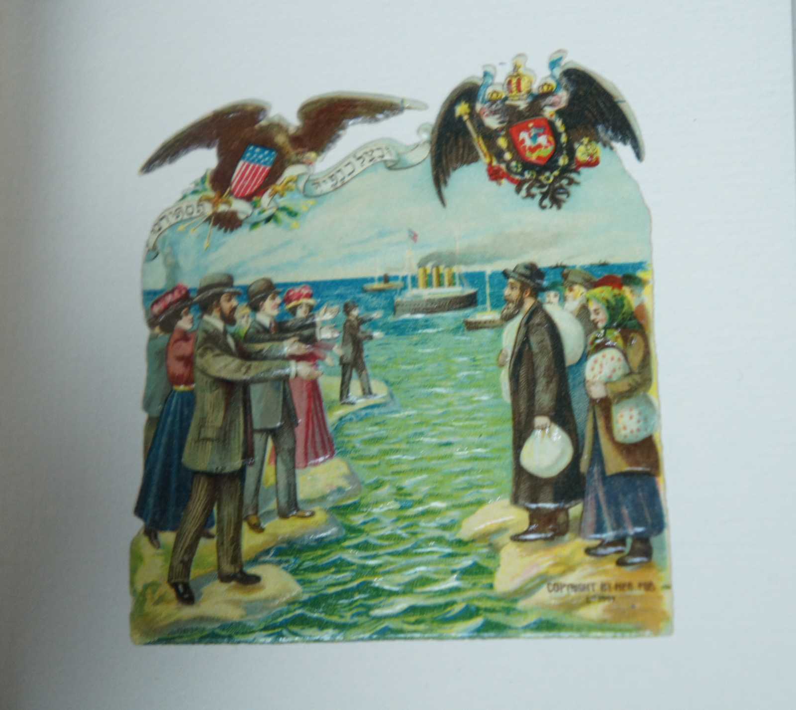 Illustration regarding the Jewish immigrant experience in America: Shelter Us in the Shadow of Your Wings, copyright by Heb. Pub. Co. 1901.