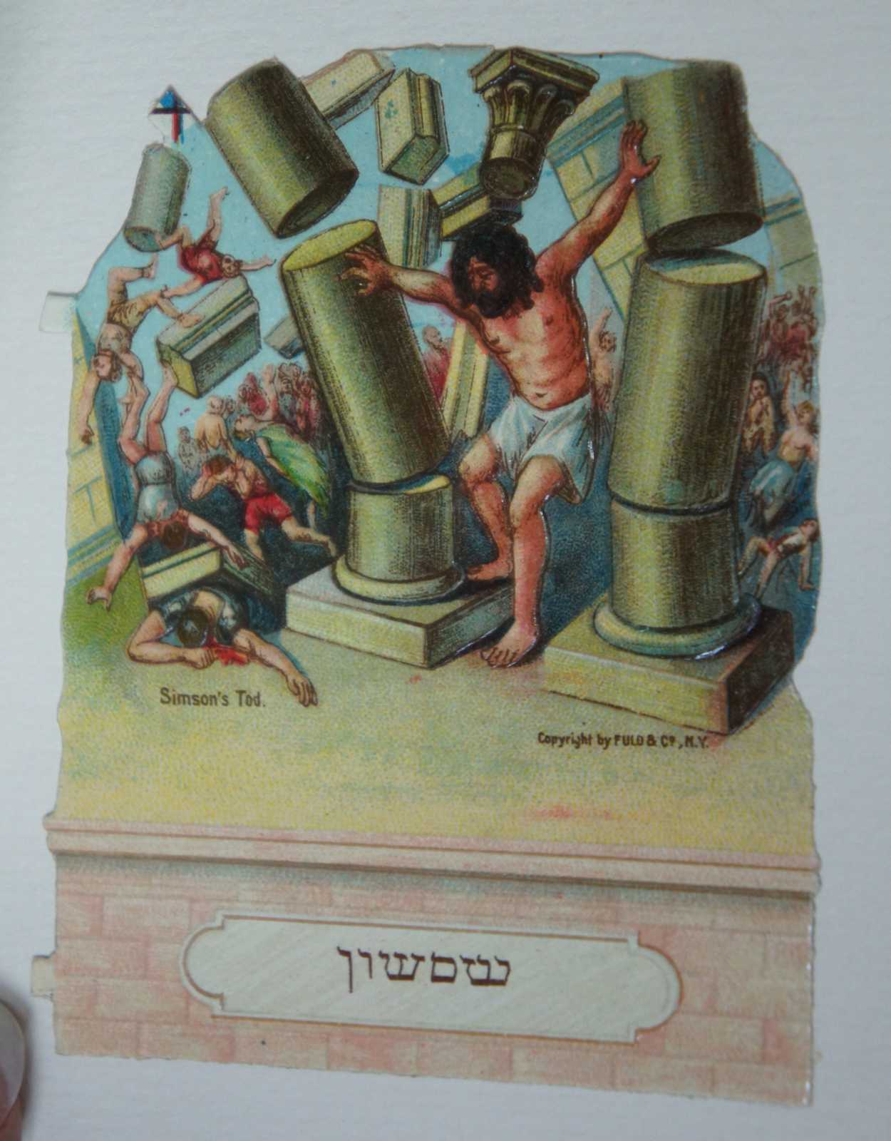 Fuld & Co., New York. Samson’s Tod (Samson’s Death). The blind Samson lets the Philistine temple collapse. Below the scene the Hebrew caption. Chromolith., embossed. 75x82 mm. Circa 1910.
