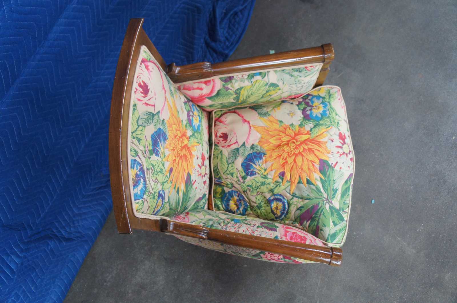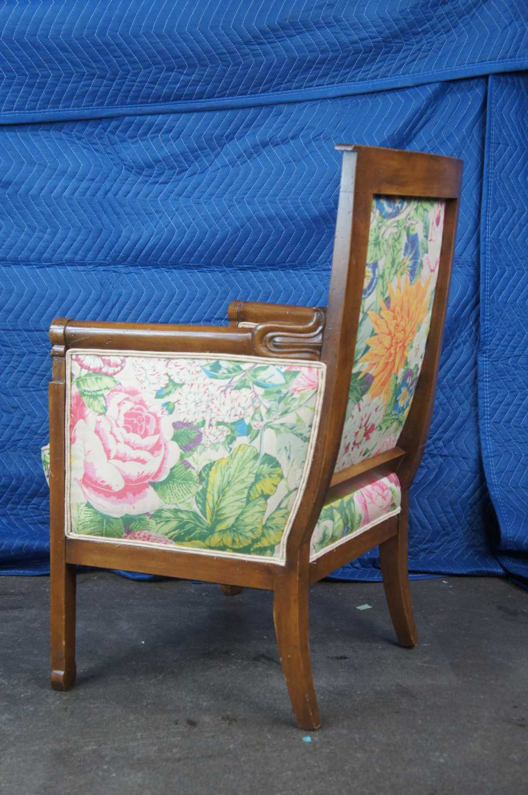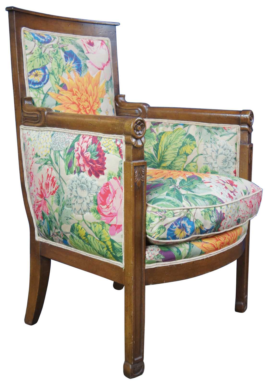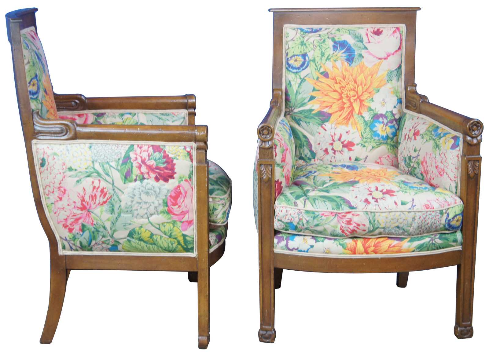 Vintage pair of French Empire or Louis XVI Inspired armchairs by Baker Furniture, circa 1976 . Made of walnut featuring carved floral details with fluted legs, round arms, and vibrant boho floral upholstery.