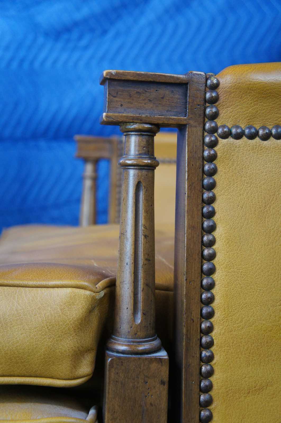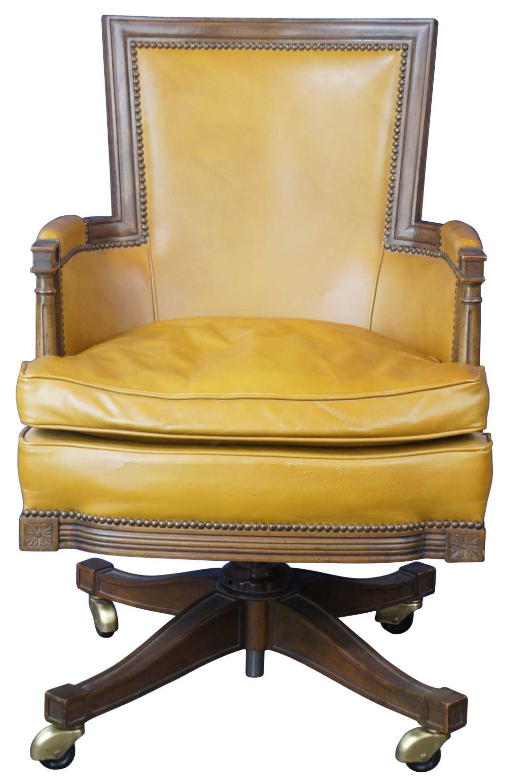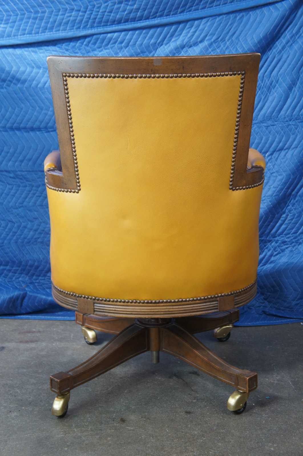Baker Furniture Louis XVI executive office desk arm chair, c. mid 20th century Made of walnut featuring carved floral and fluted accents with padded arms supported by columns, yellow leather, and nailhead trim. Adjustable swivel base and recline.