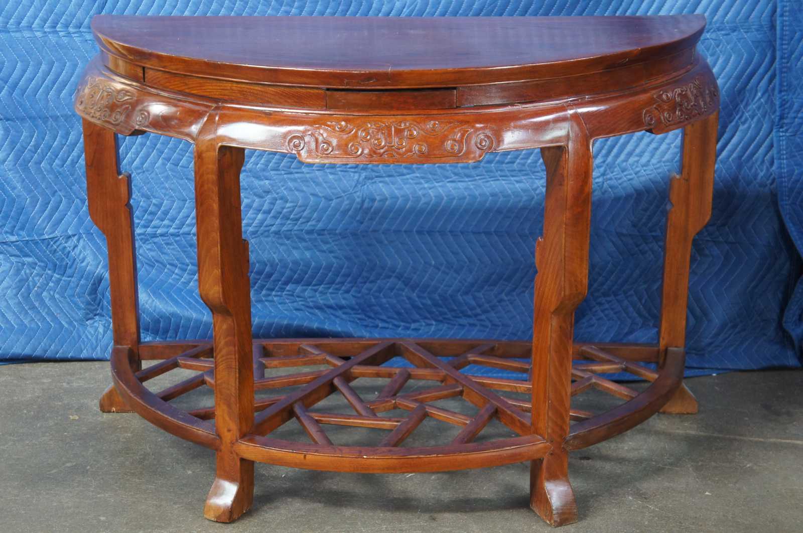 Exquisite Antique pair of Chinese Qing Dynasty Half Moon or crescent shaped center entry console tables. Each console is made of elm featuring demilune form with three concealed drawers that open from underneath, carved aprons, and lower tier that features lattice fretwork design. The tables can stand alone or connect via tongue and groove mechanism to form a uniform round center table.