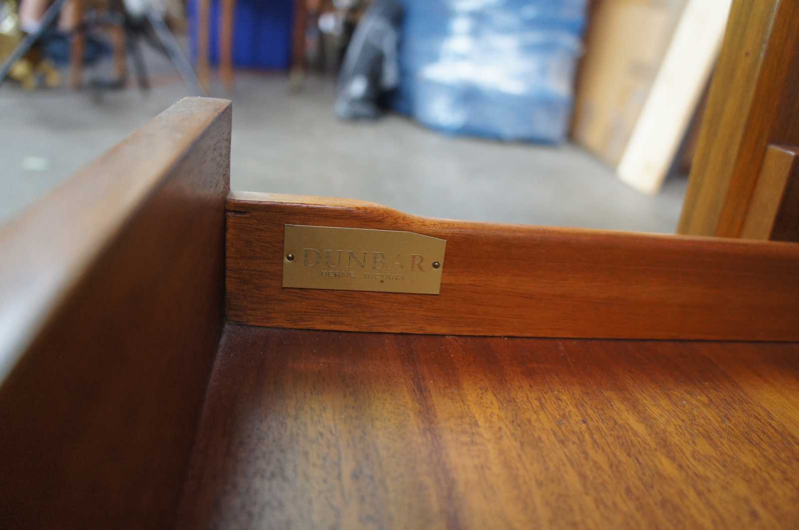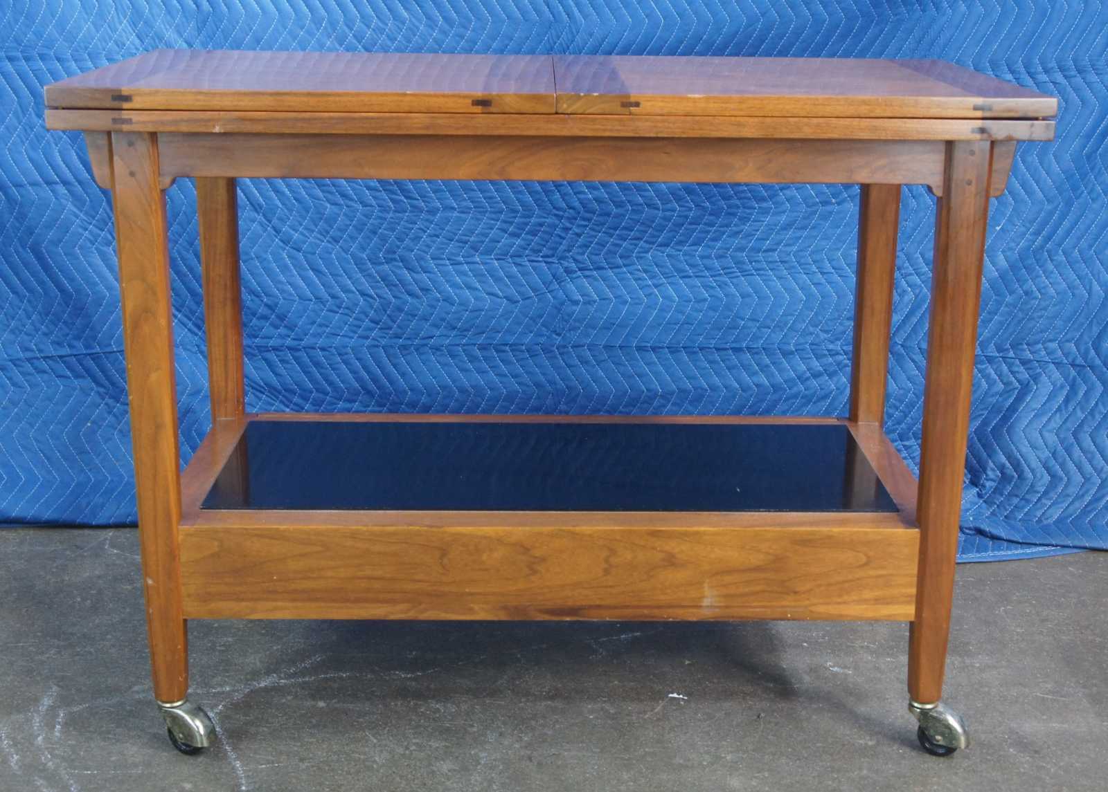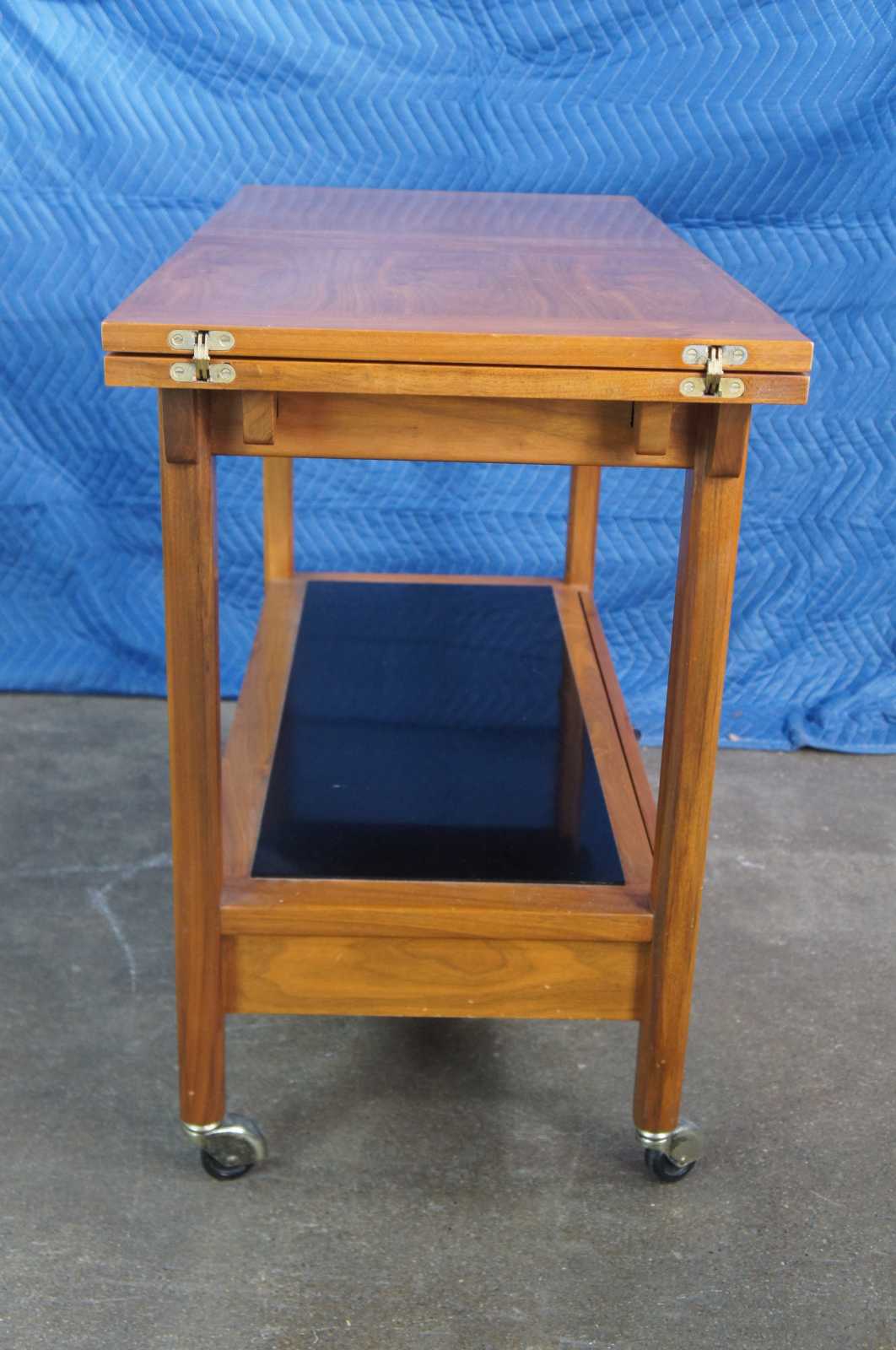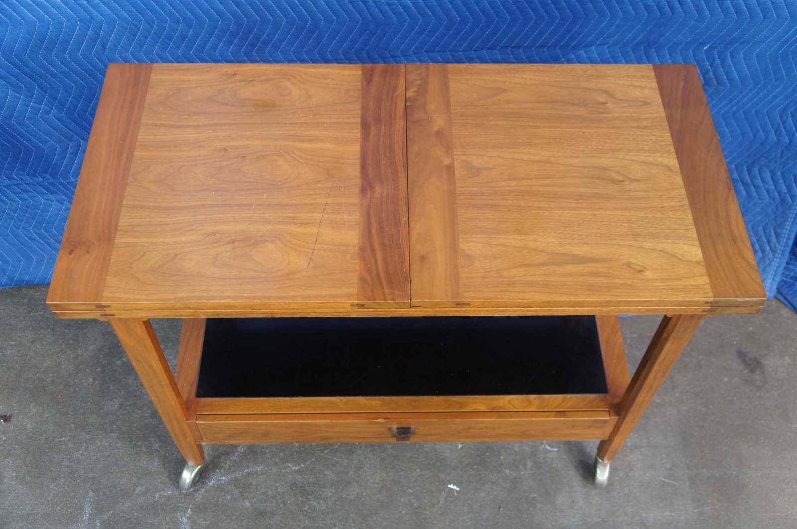 Mid Century Modern Edward Wormley for Dunbar Furniture bar cart or server. Made of walnut featuring a two tier design with a flip top, lower drawer, Micarta insert and large rolling casters.
