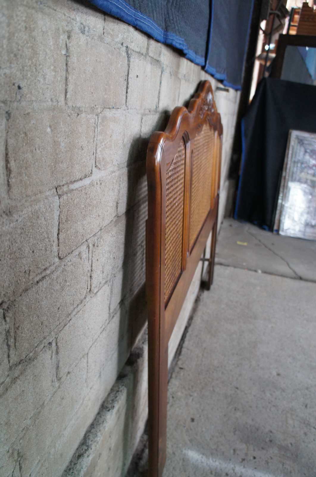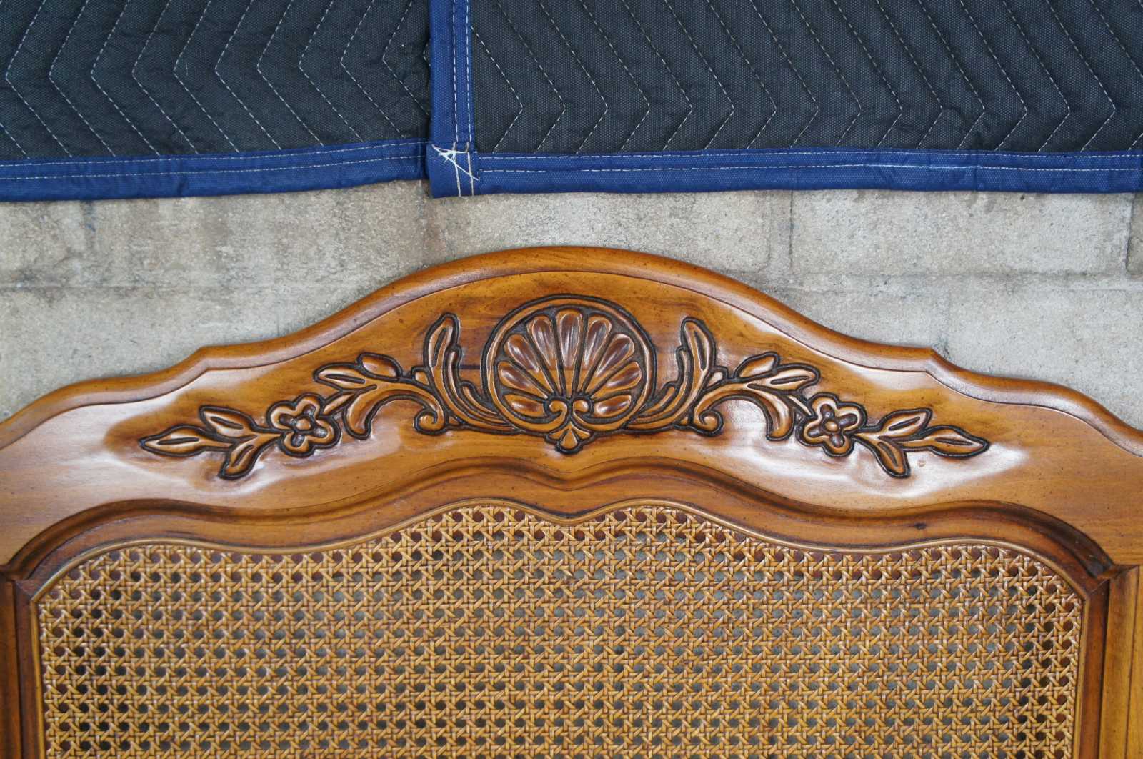 Mid century French Provincial full or queen size headboard featuring serpentine form with shell and floral design and caned back.