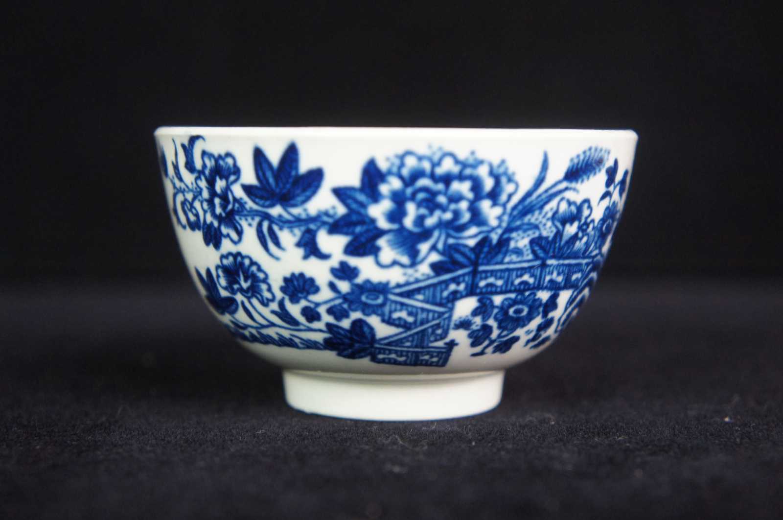 Antique 18th century (Circa 1770s) English George III Worcester 1st period tea bowl or coffee cup and saucer. Made of porcelain featuring the 1st period crescent mark and decorated with the chinoiserie motif known as Fences with an Asian landscape scene with a pagoda house, a fenced in garden and flowers with two large birds / cranes / geese.