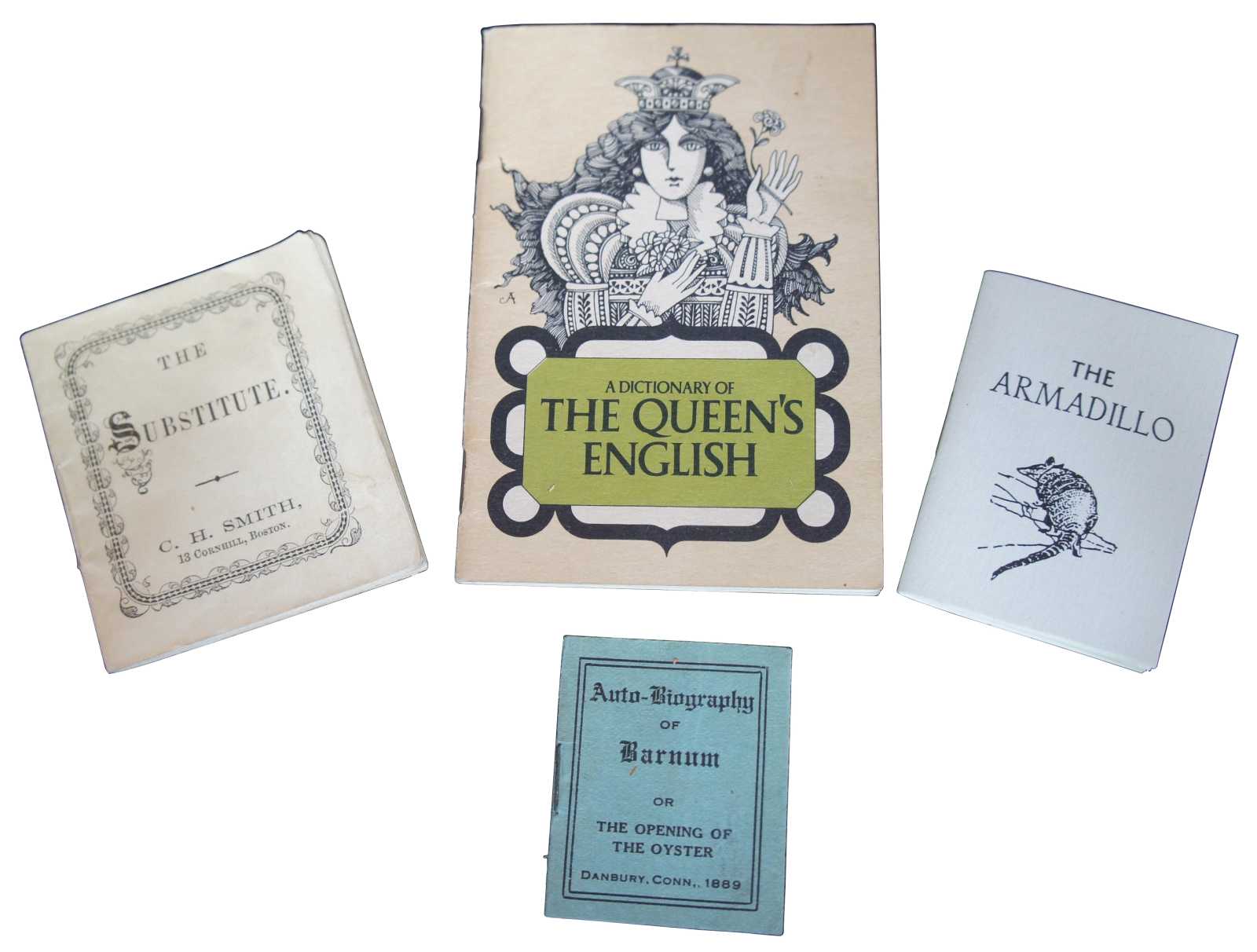 The Substitute by CH Smith; A Dictionary of The Queen's English; The Armadillo by Valentine Poska, Amistad Press Austin Texas; A blank purple notebook, and;