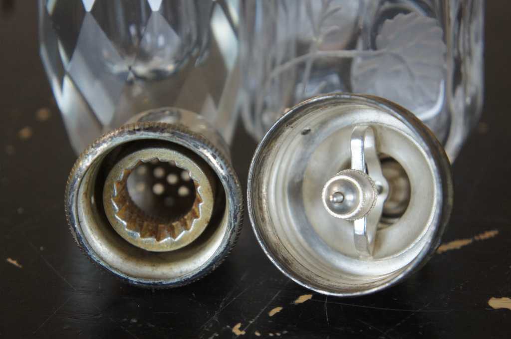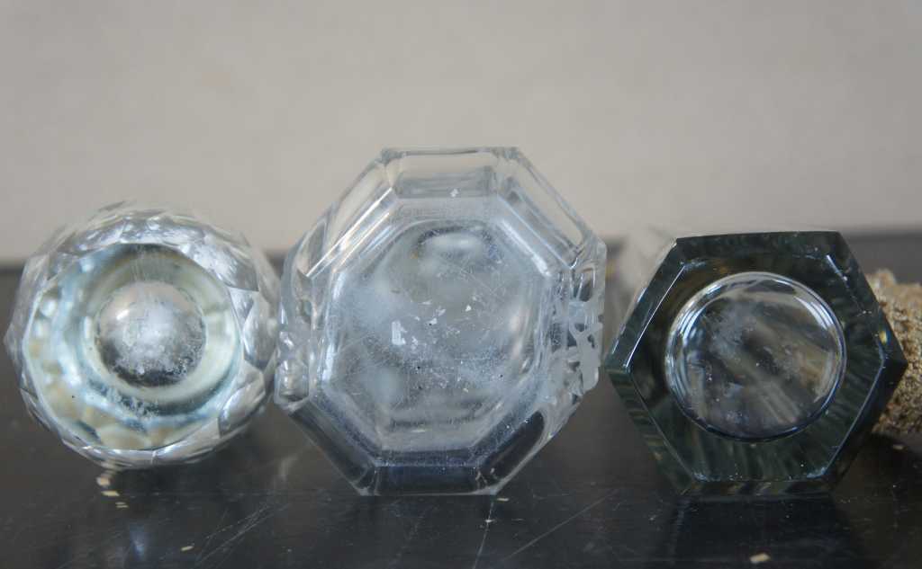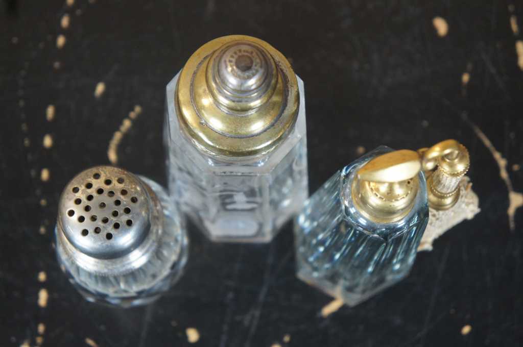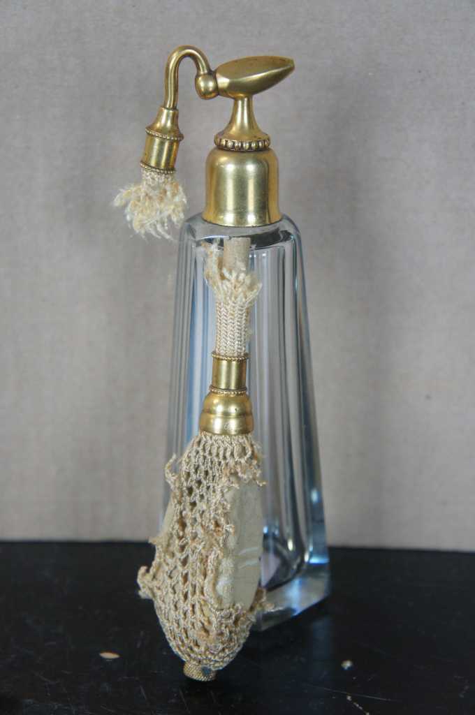 Gently used - tarnish to lids; some tiny chips on large bottle; small bottle lid does not stay on securely; medium bottle tube broke apart during photographing/bulb rubber hardened with age; see pictures
