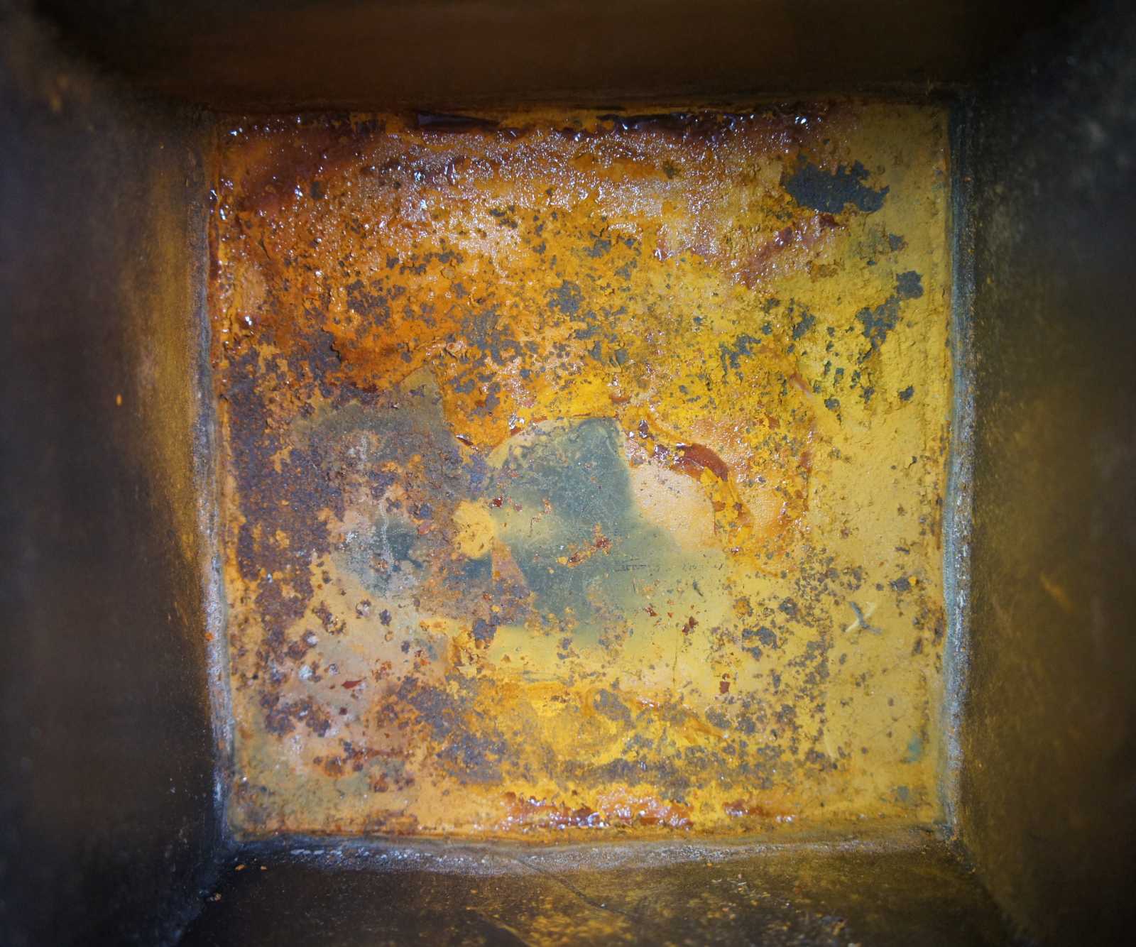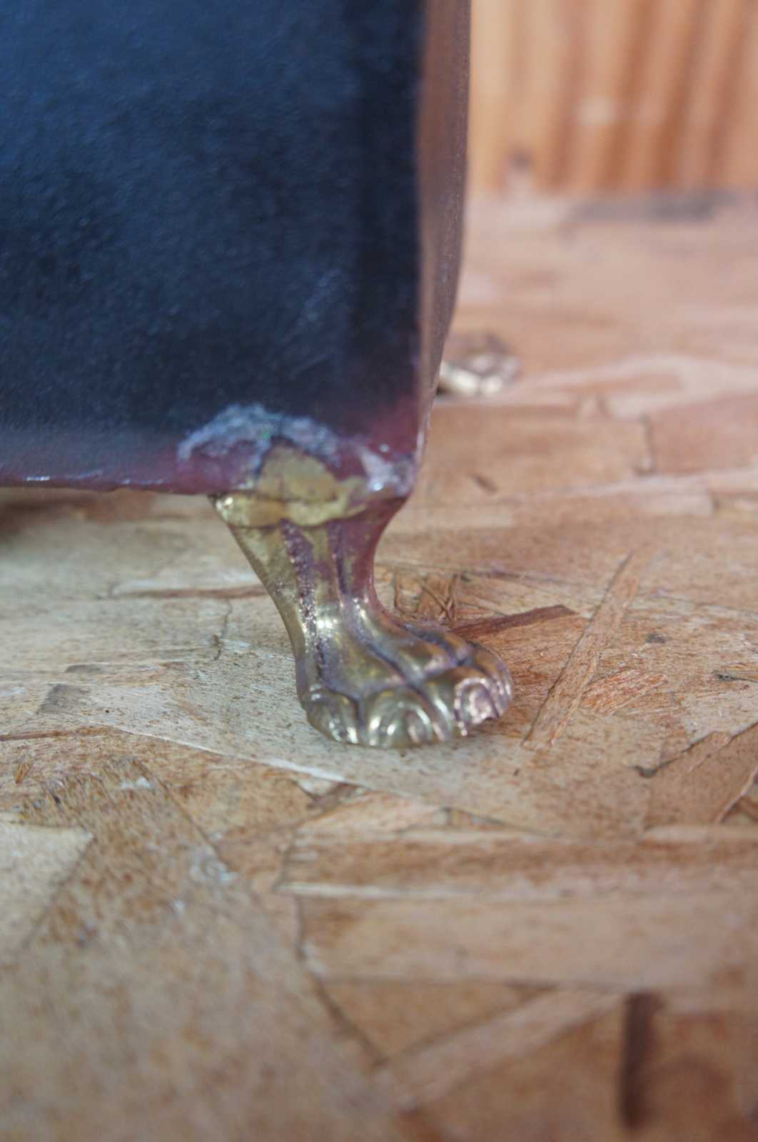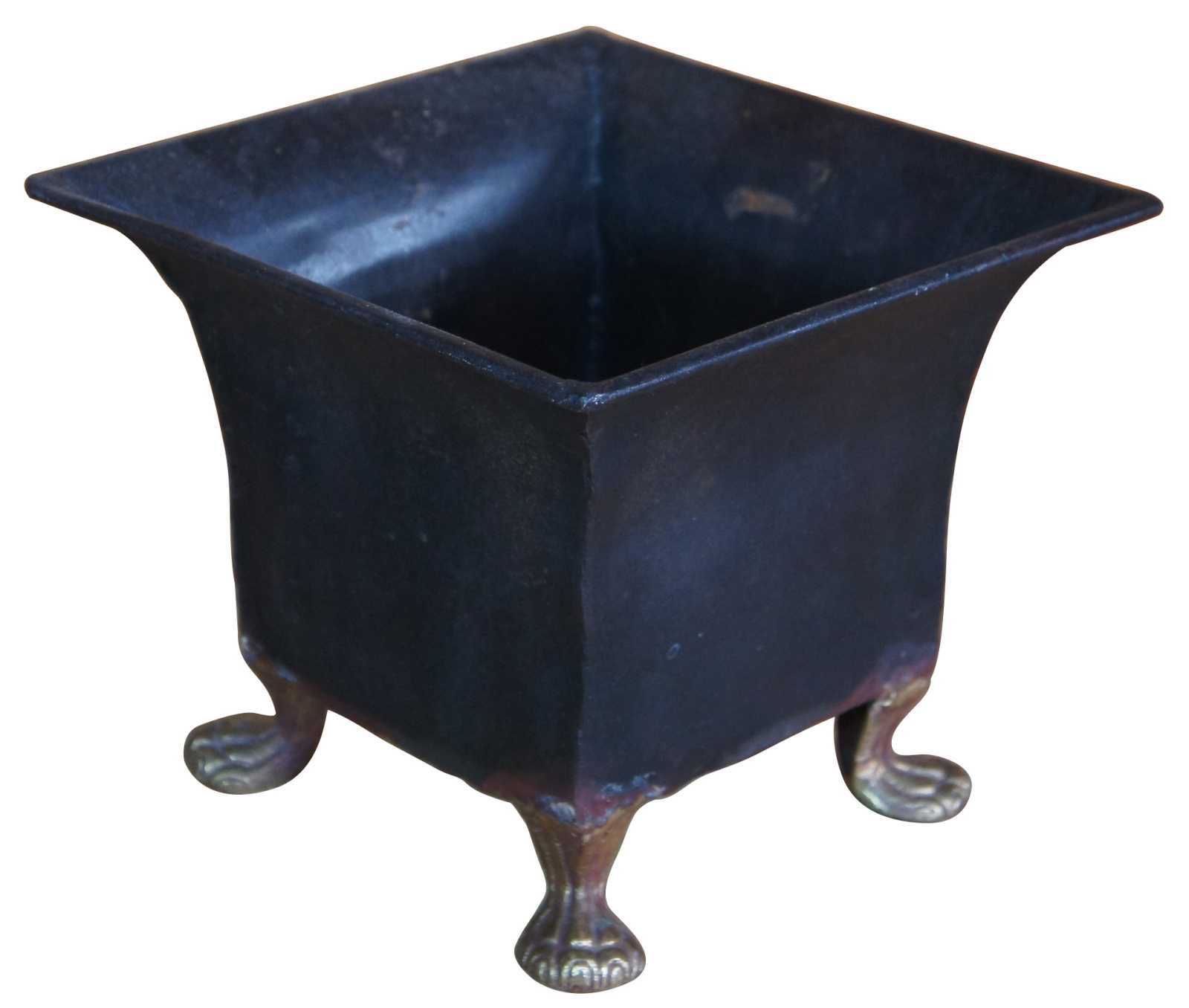 French Empire style metal toleware cachepot, circa first half 20th century. Rectangular form with flare mouth and brass claw feet.