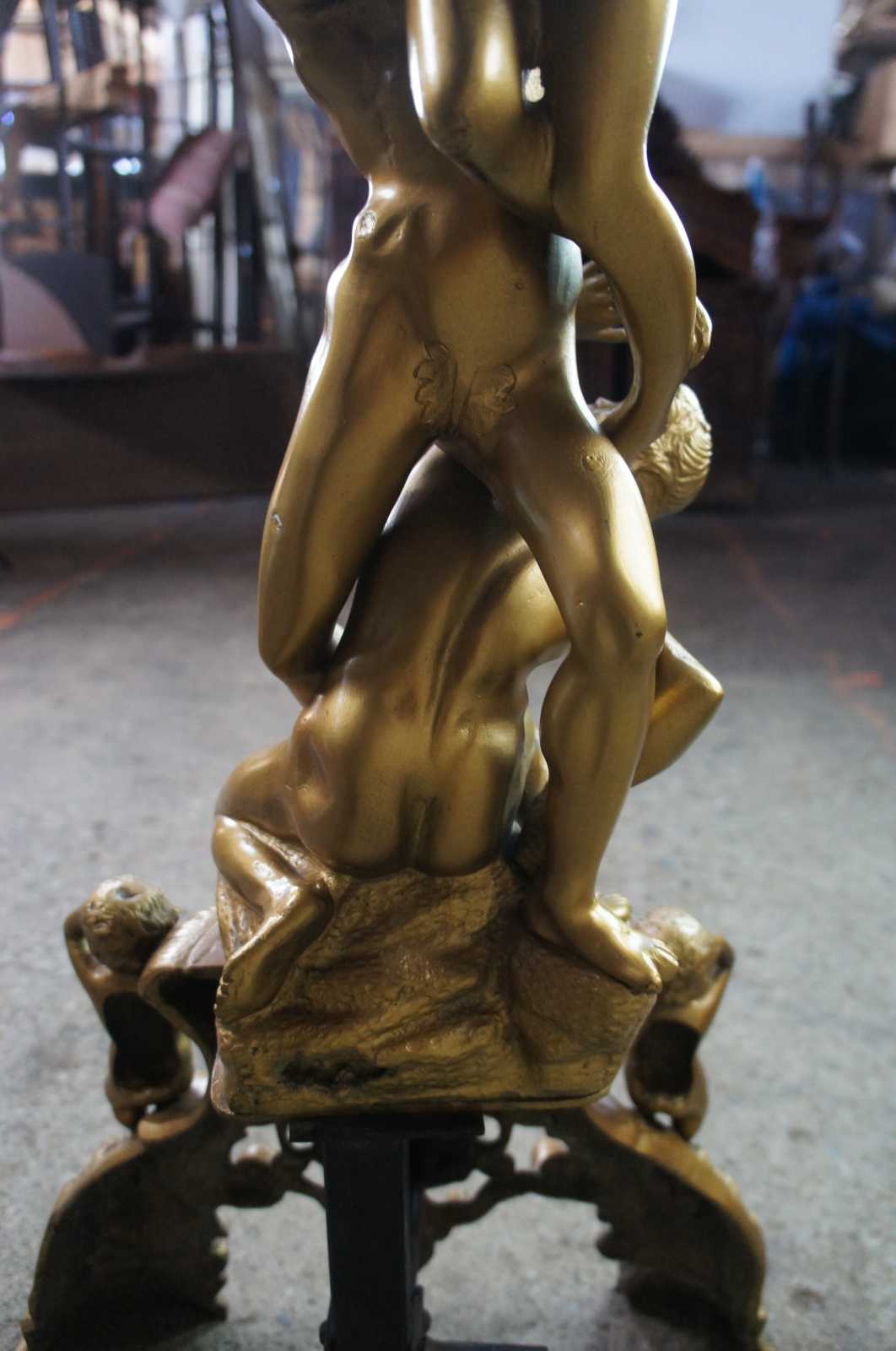 An elegant and rare set of figural Renaissance Revival andirons, chestnuts or firedogs. A depiction of Giambologna's Abduction of a Sabine Woman. Made from Bronze and finished in Gold. Features 3 outstretched figures above an ornate base of caryatids and cherubs centered by a lion crest. Log holder is made from iron.