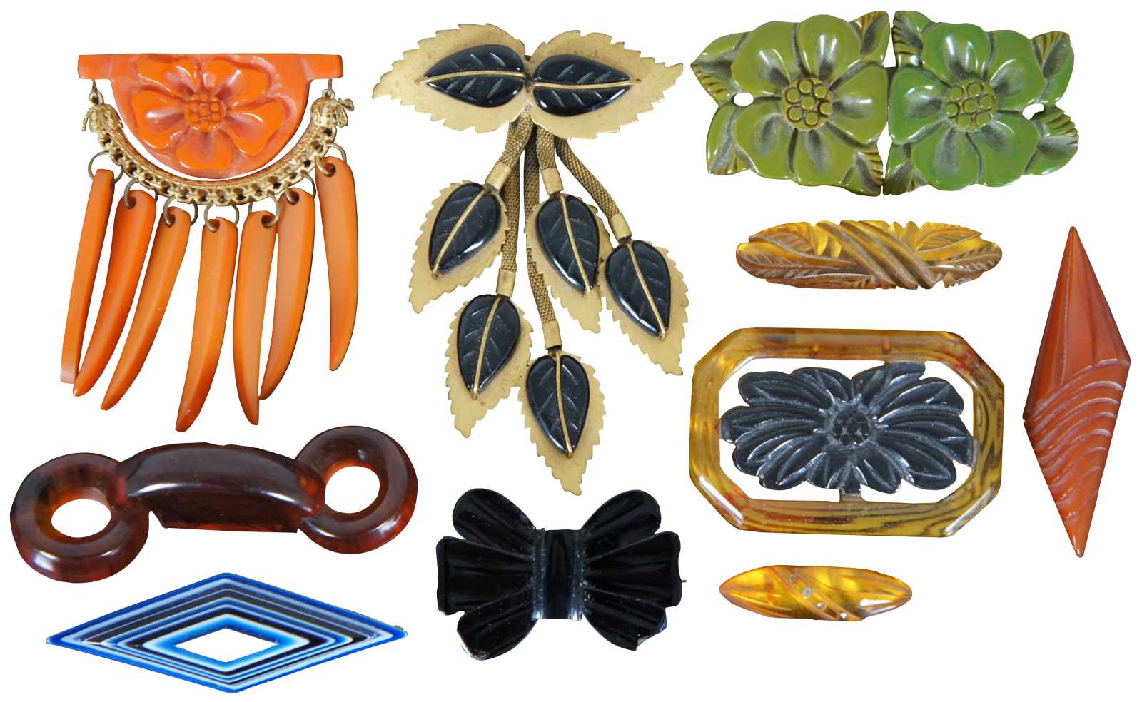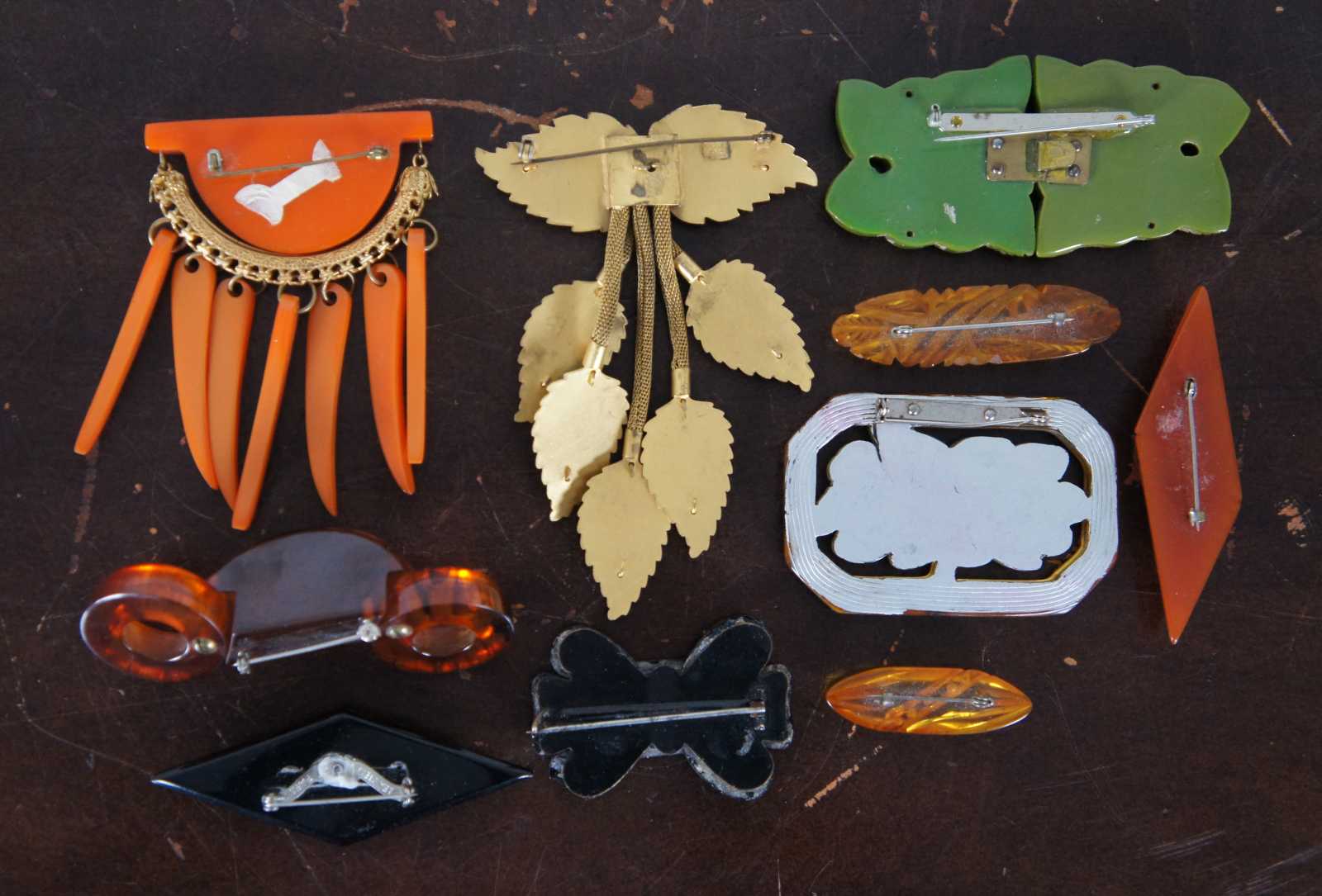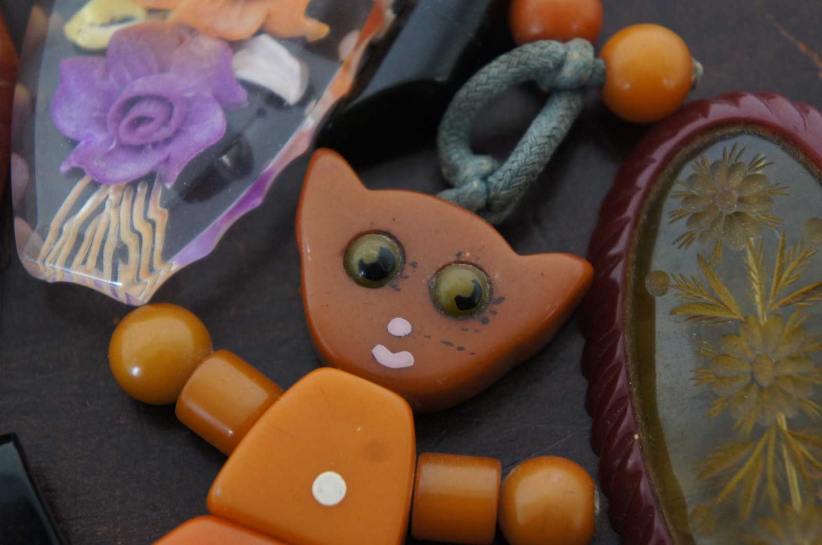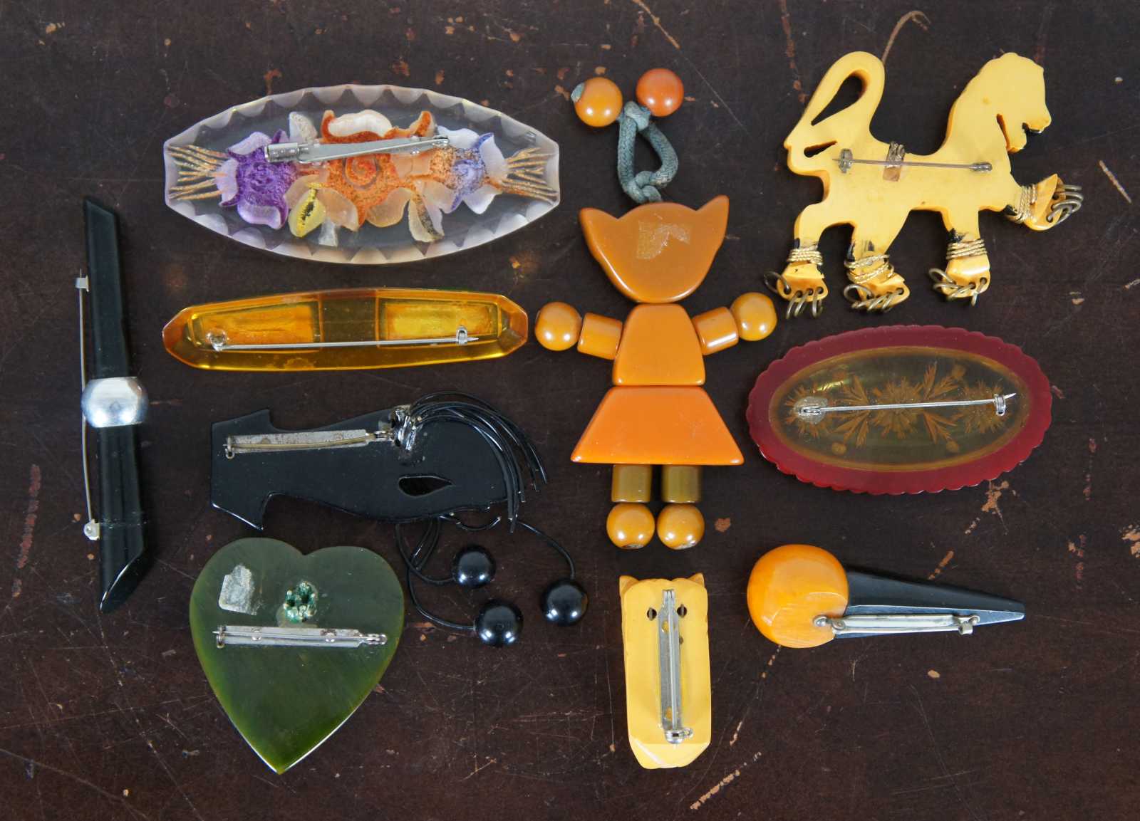 Lot of 20 early to mid 20th century bakelite pins and brooches and one beaded pendant. Includes one Lea Stein geometric pin, a heraldic lion, multiple florals, a horse, heart, bowtie and butterscotch kitty cat in skirt.