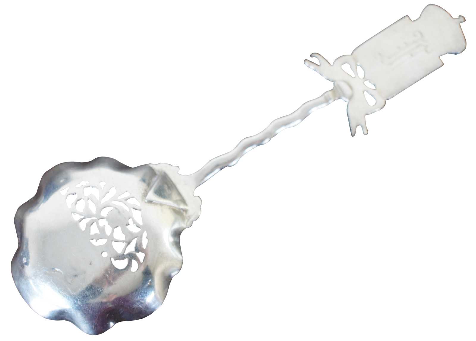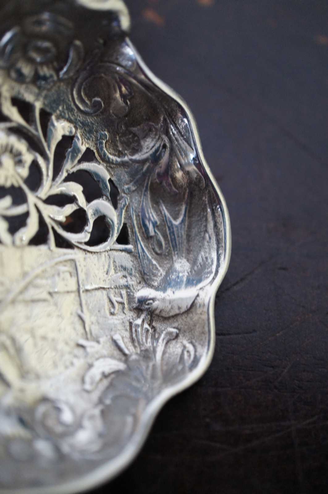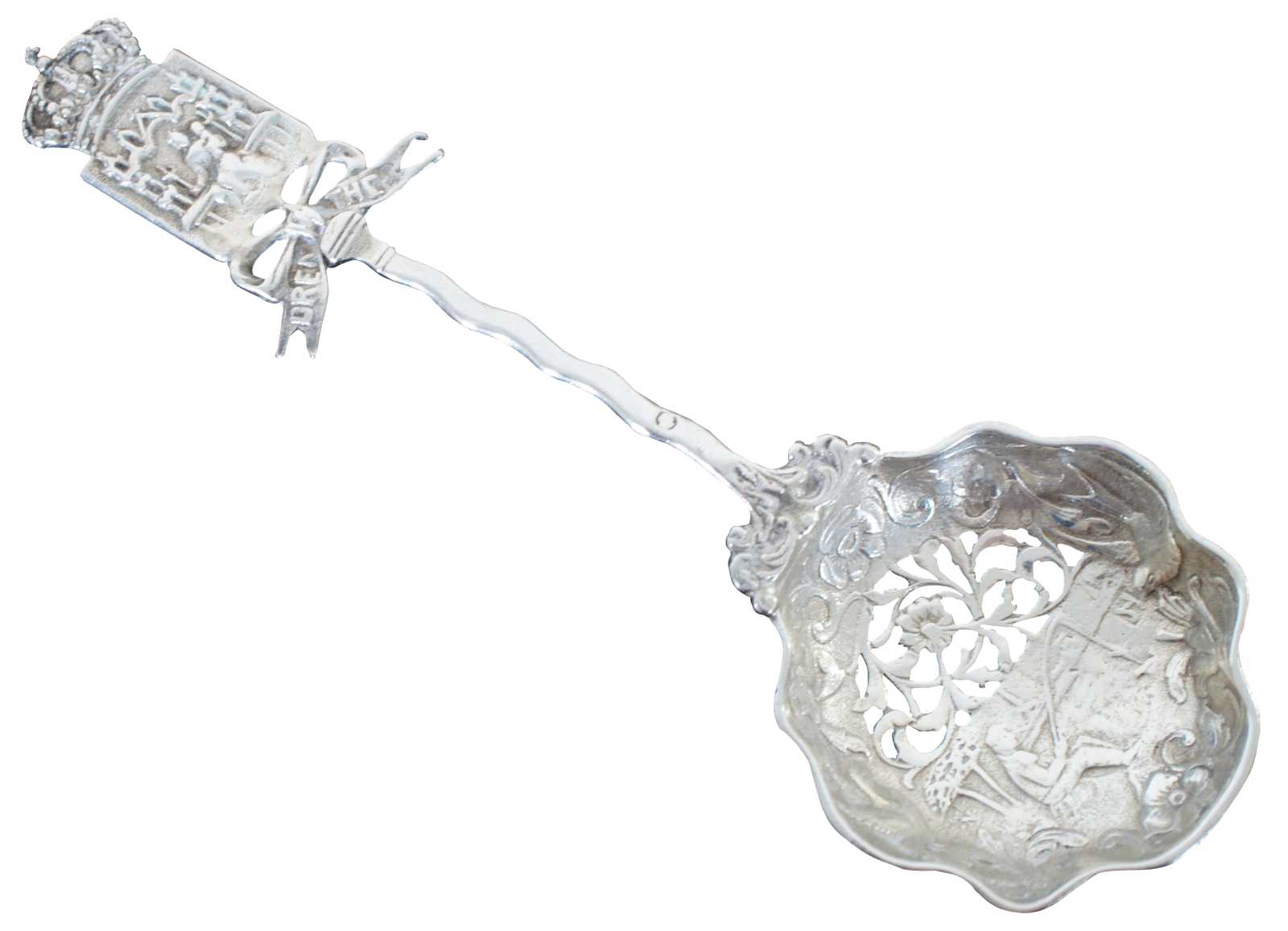 Antique Danish ornate repousse high relief sterling silver berry or caddy spoon, topped with a crown and the image of the Virgin Mary holding the baby Jesus, enthroned as the Queen of Heaven. Below her is a bow with the name Drenthe (a province in the Netherlands). The pierced bowl features scrolled leaves and flowers around a figure fishing. Monogrammed F. 43.