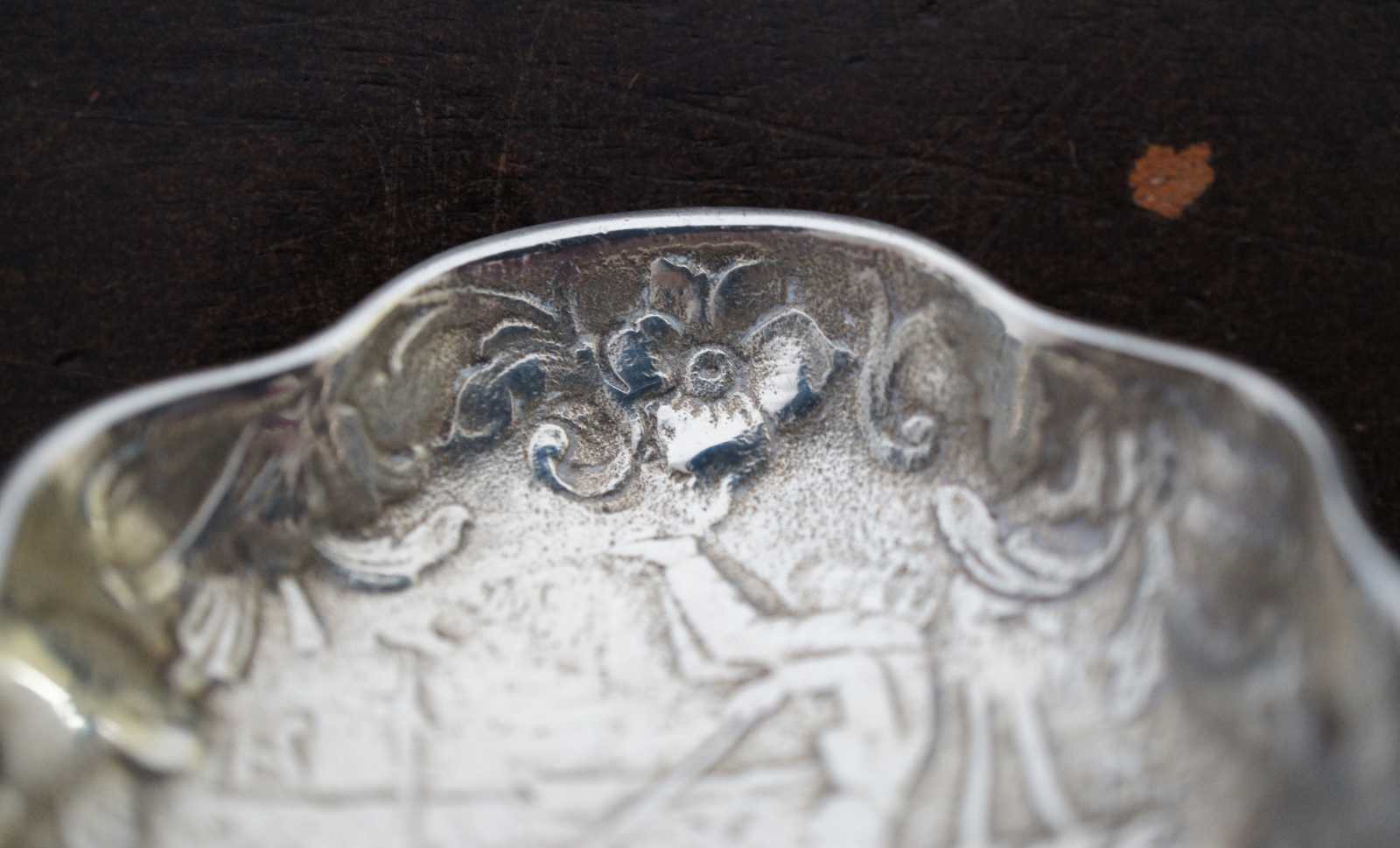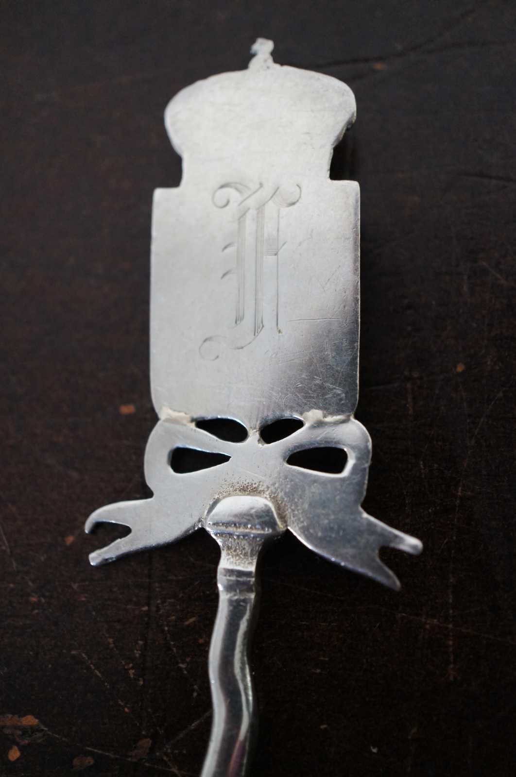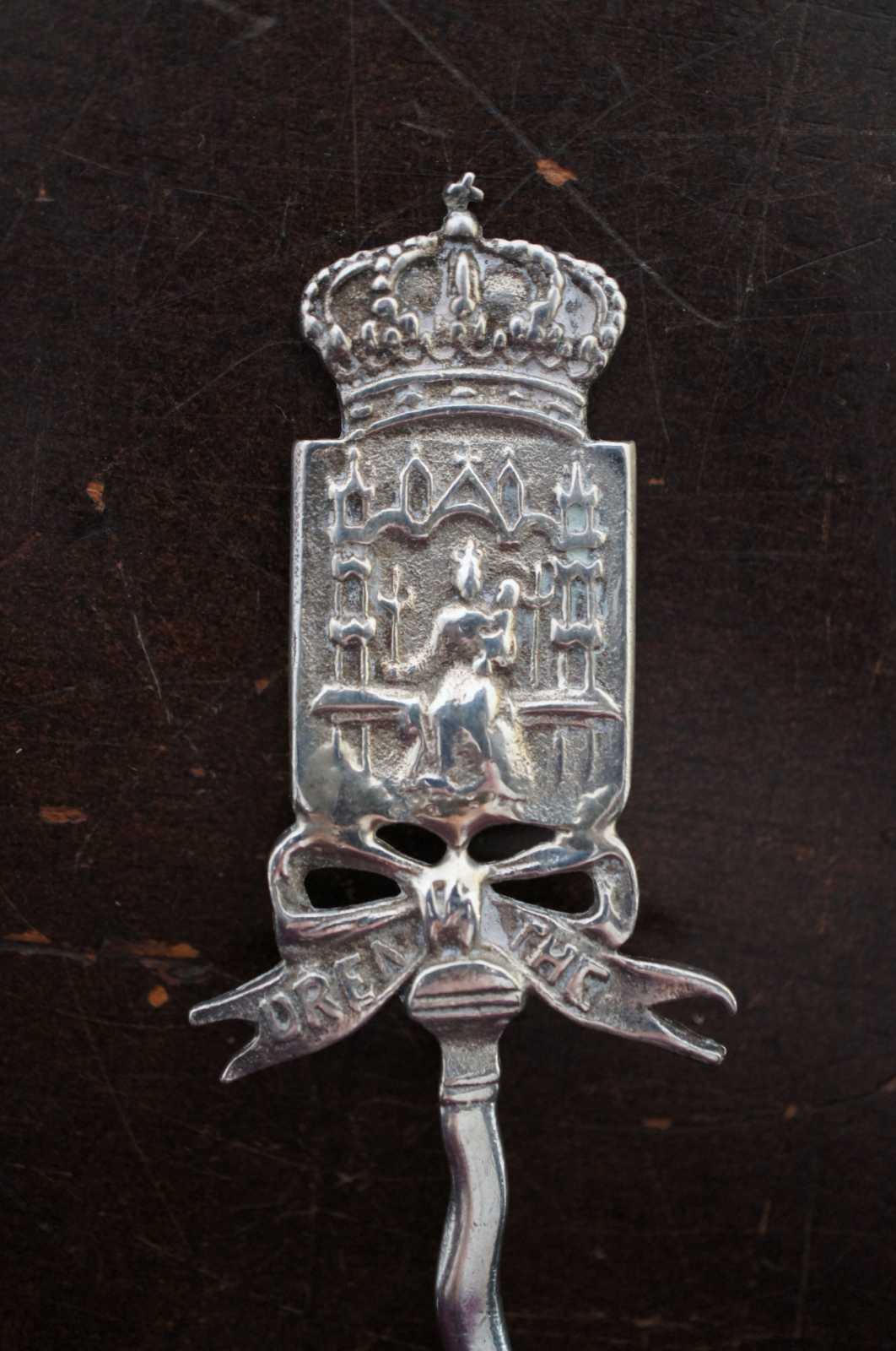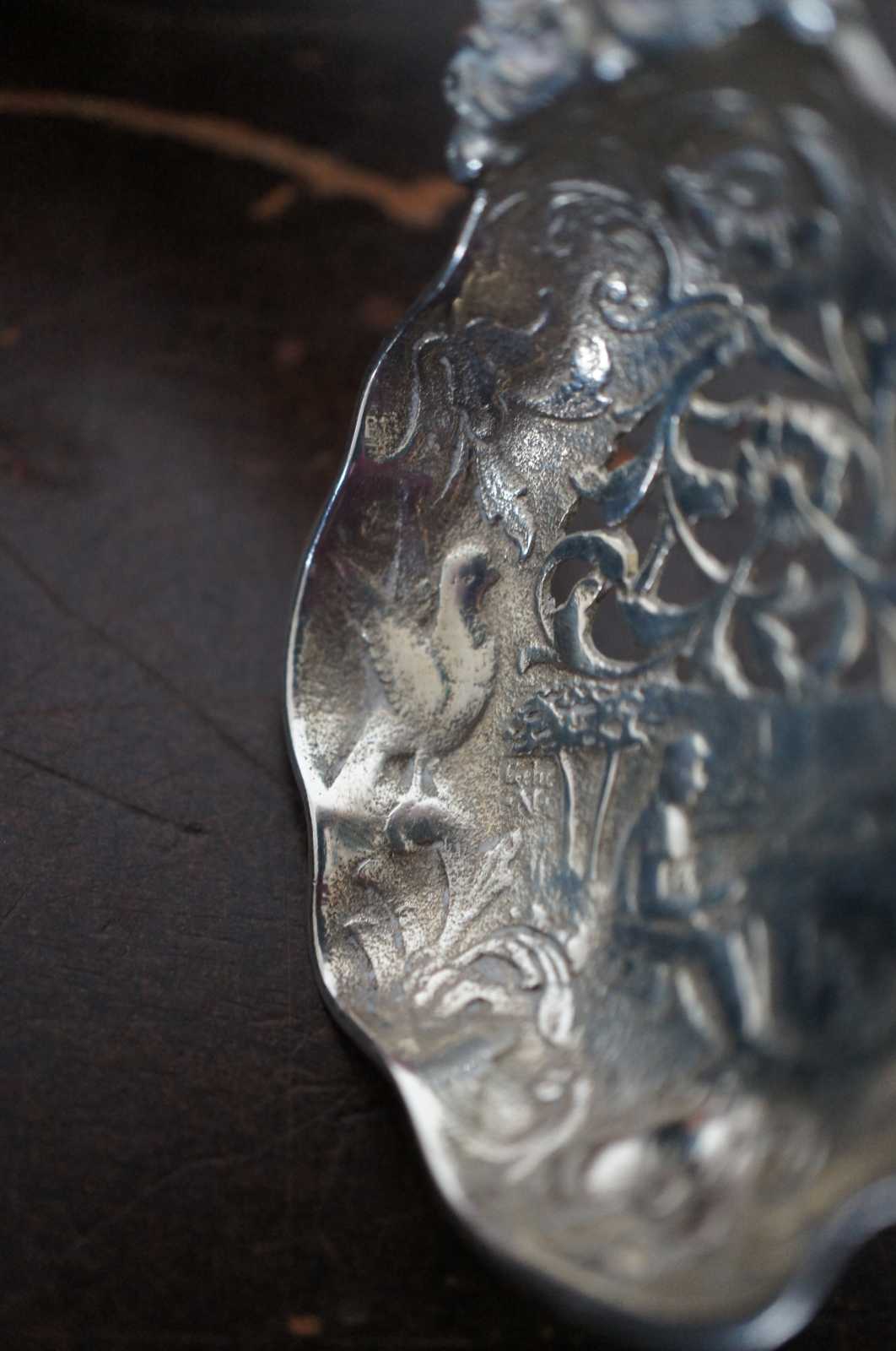 Antique Danish ornate repousse high relief sterling silver berry or caddy spoon, topped with a crown and the image of the Virgin Mary holding the baby Jesus, enthroned as the Queen of Heaven. Below her is a bow with the name Drenthe (a province in the Netherlands). The pierced bowl features scrolled leaves and flowers around a figure fishing. Monogrammed F. 43.
