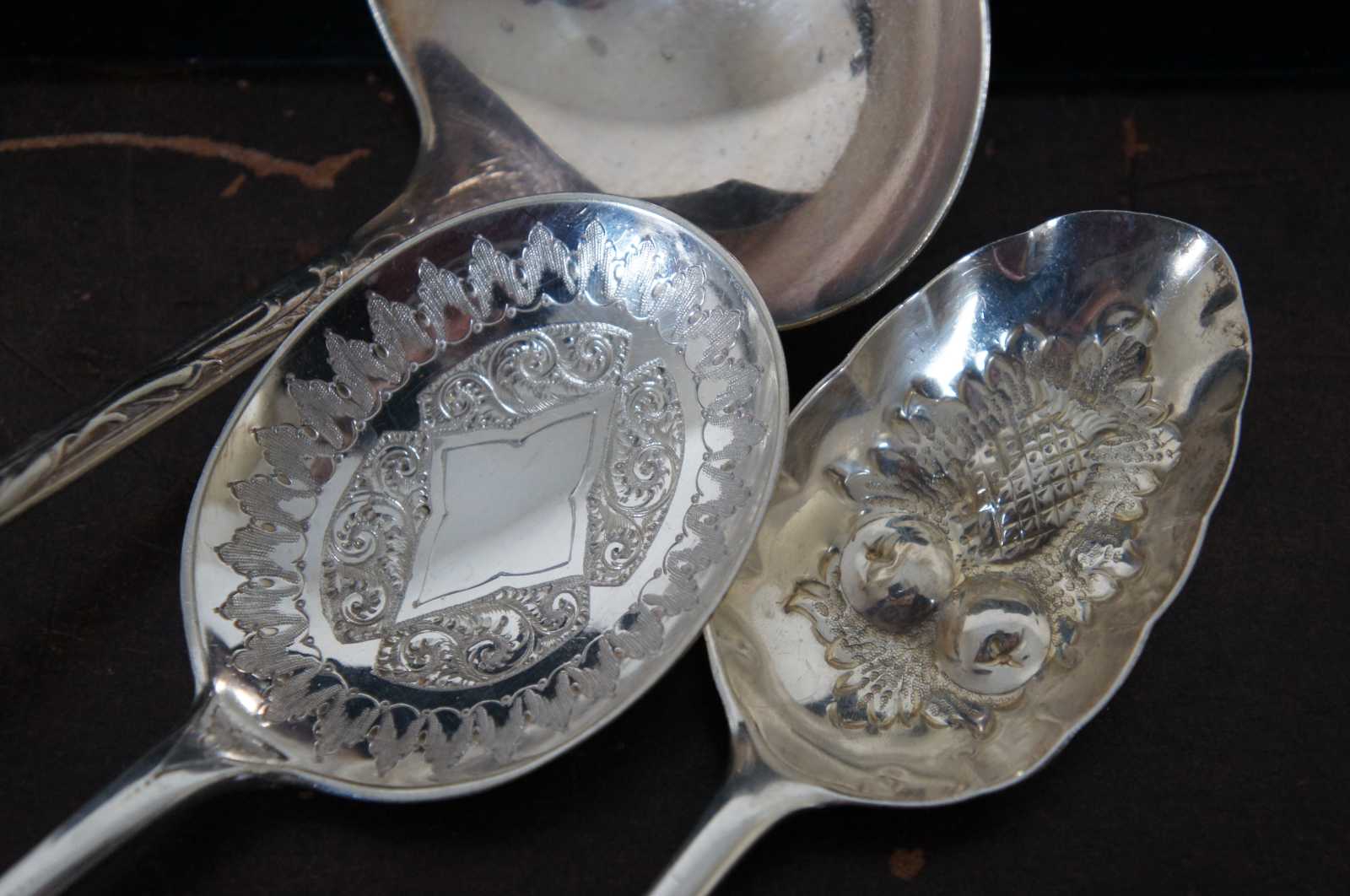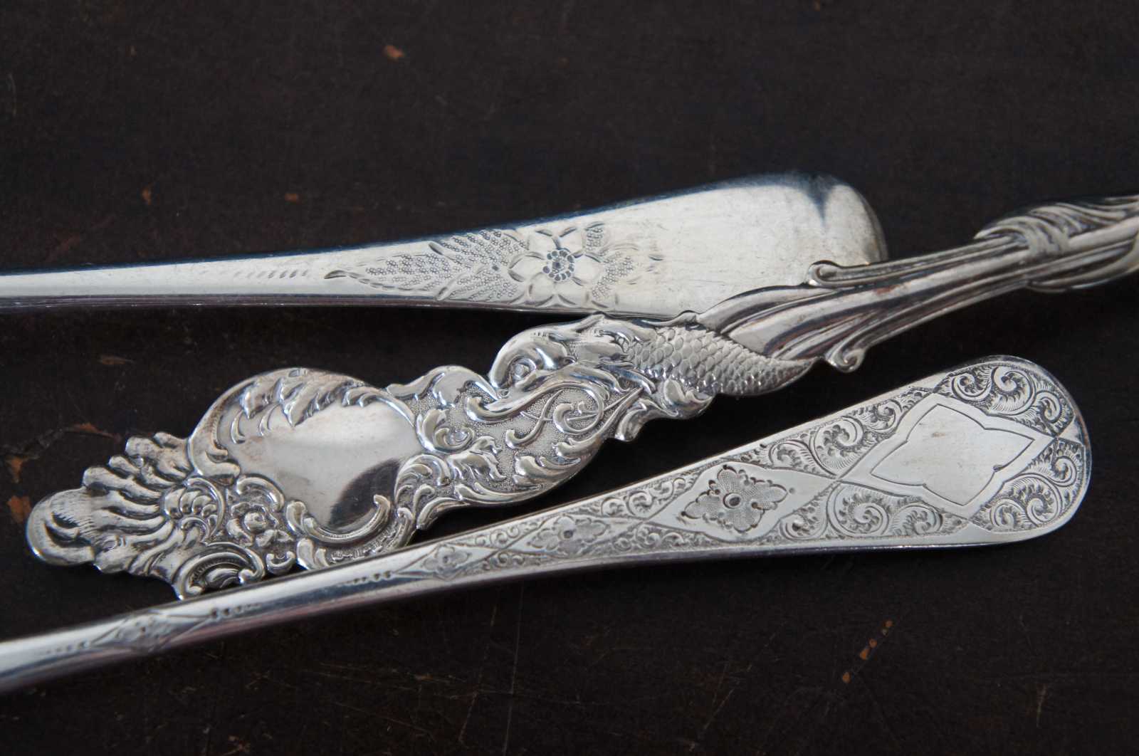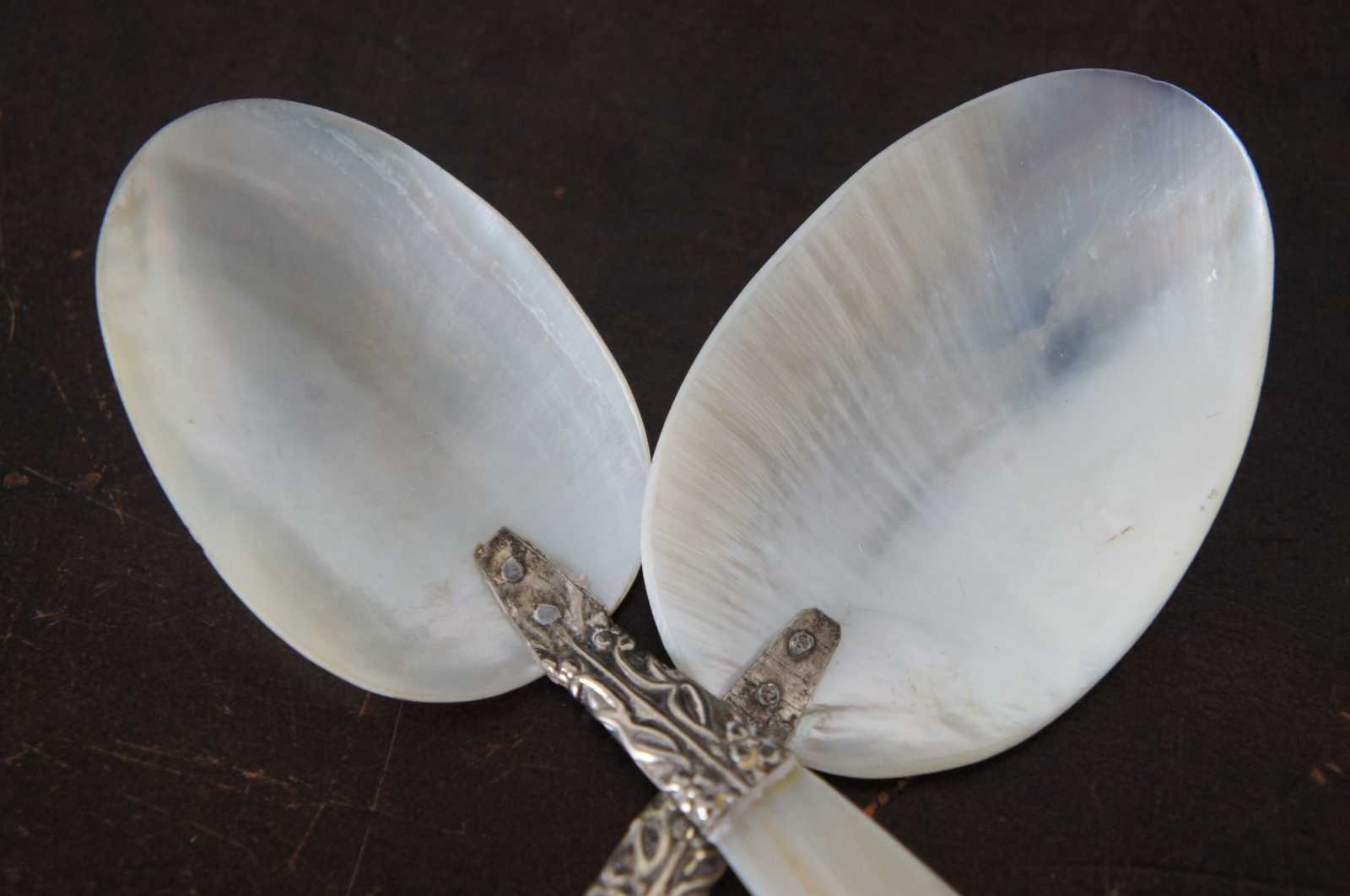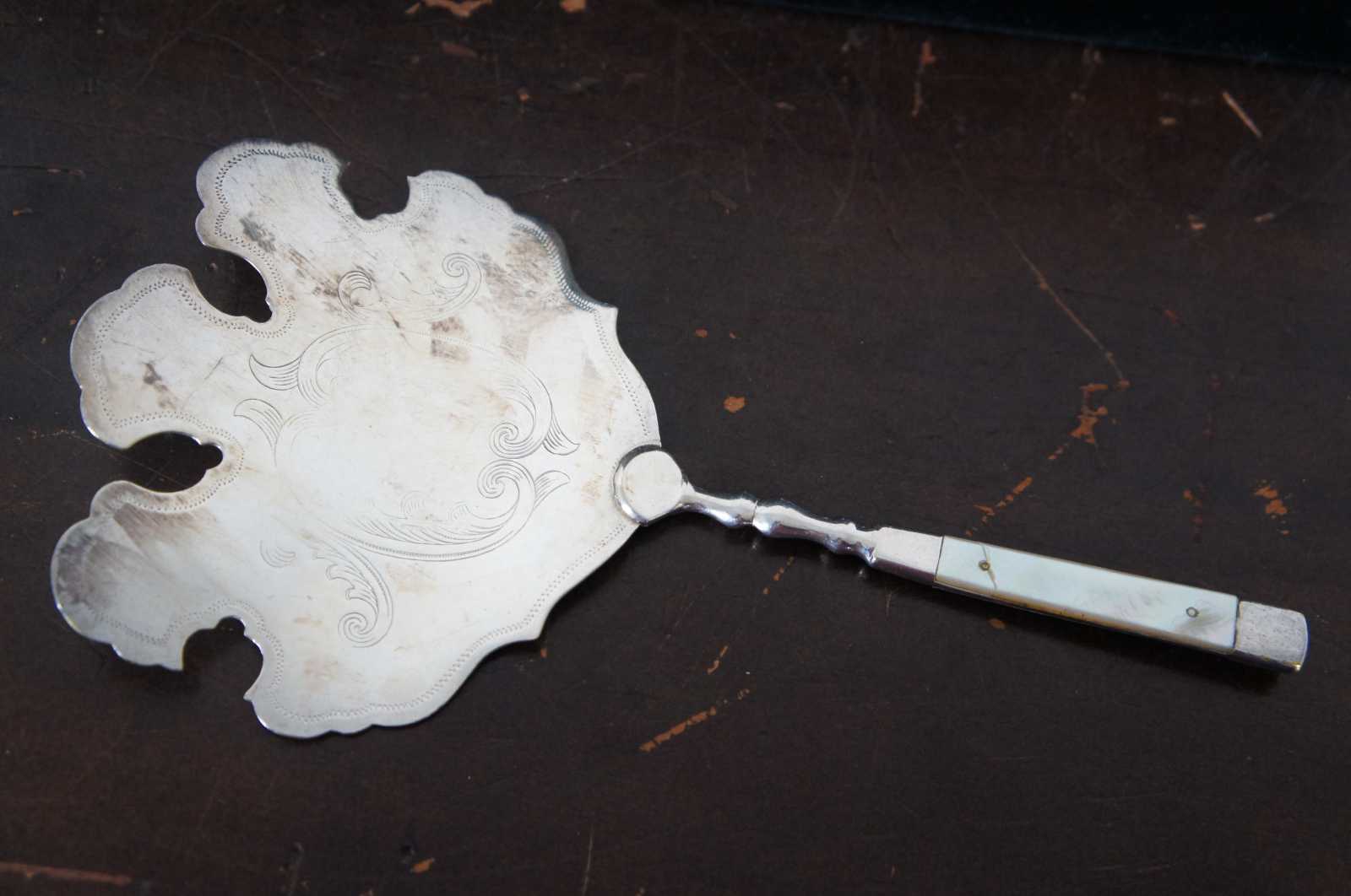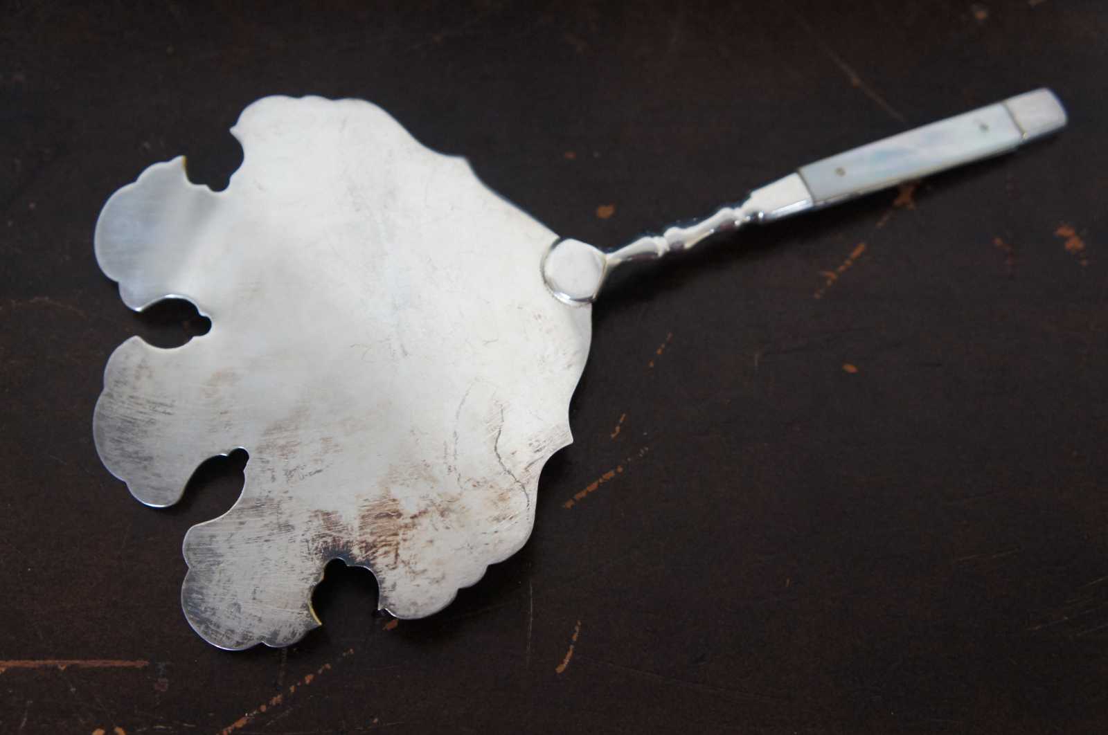 Lot of 6 assorted vintage silver, silver plate and mother of pearl serving pieces featuring: