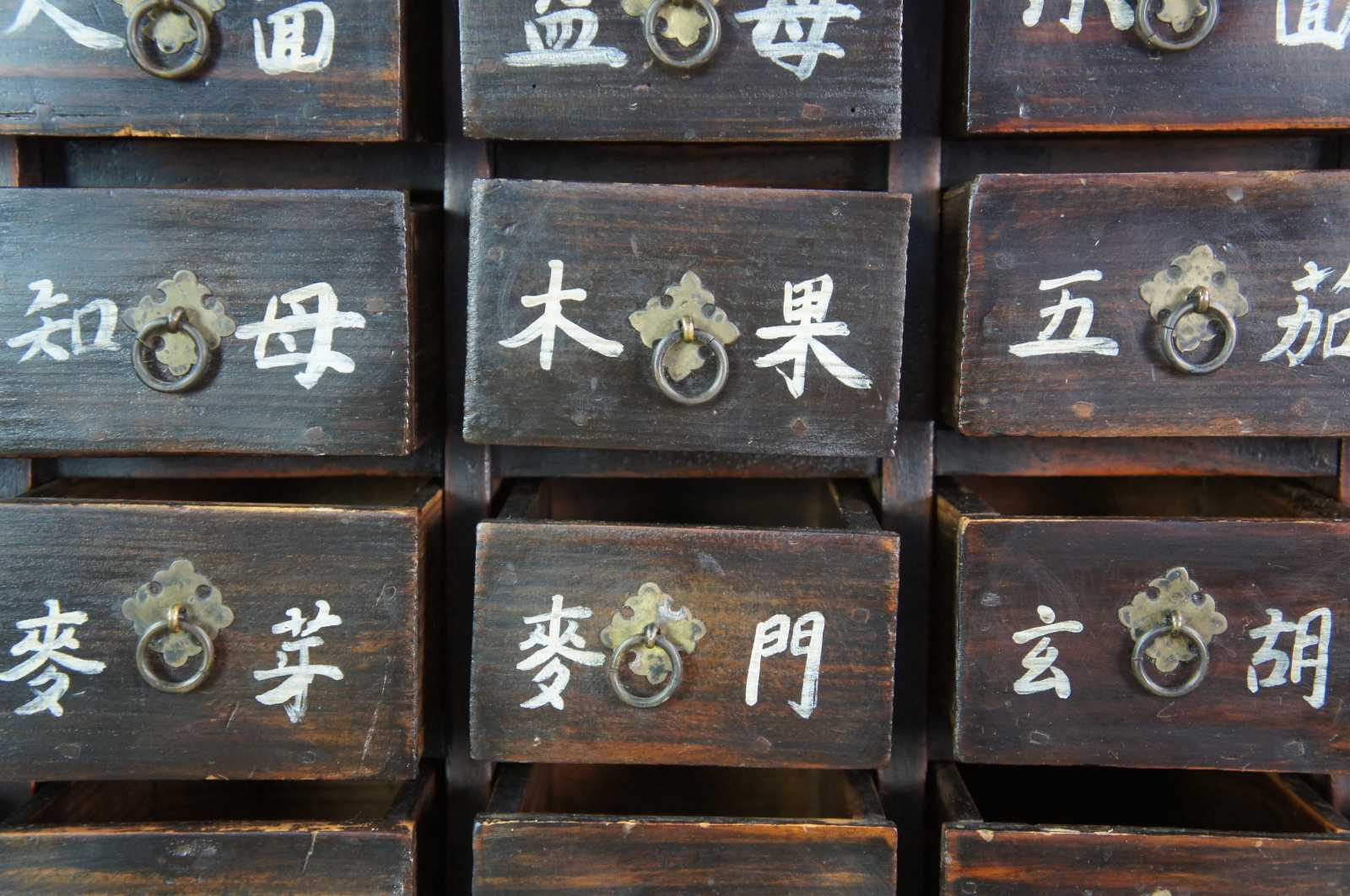 A rare early 19th century Chinese medical or apothecary chest. Made of dense Chinese hardwood with dovetailed and serpentine accents featuring 56 calligraphy drawers with dividers and brass hardware.