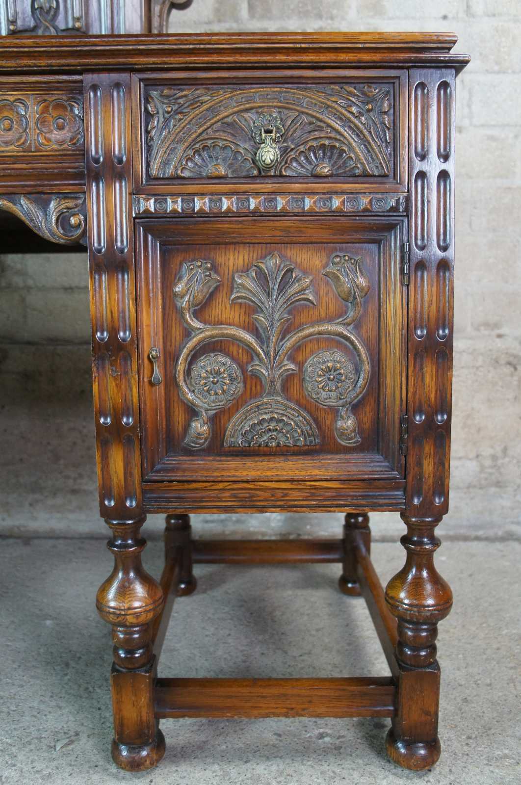 American Furniture Company Gothic or Spanish Renaissance Revival vanity desk and mirror. Operating out of Batesville Indiana since 1899, they worked closely and collaborated in part with Romweber. Specializing in high grade bedroom suites & furniture. Made from American Oak with low relief floral carvings, an arched trifold mirror, twisted balusters posts, turned legs and bun feet. Includes three drawers over lower cabinets. Circa 1930s.