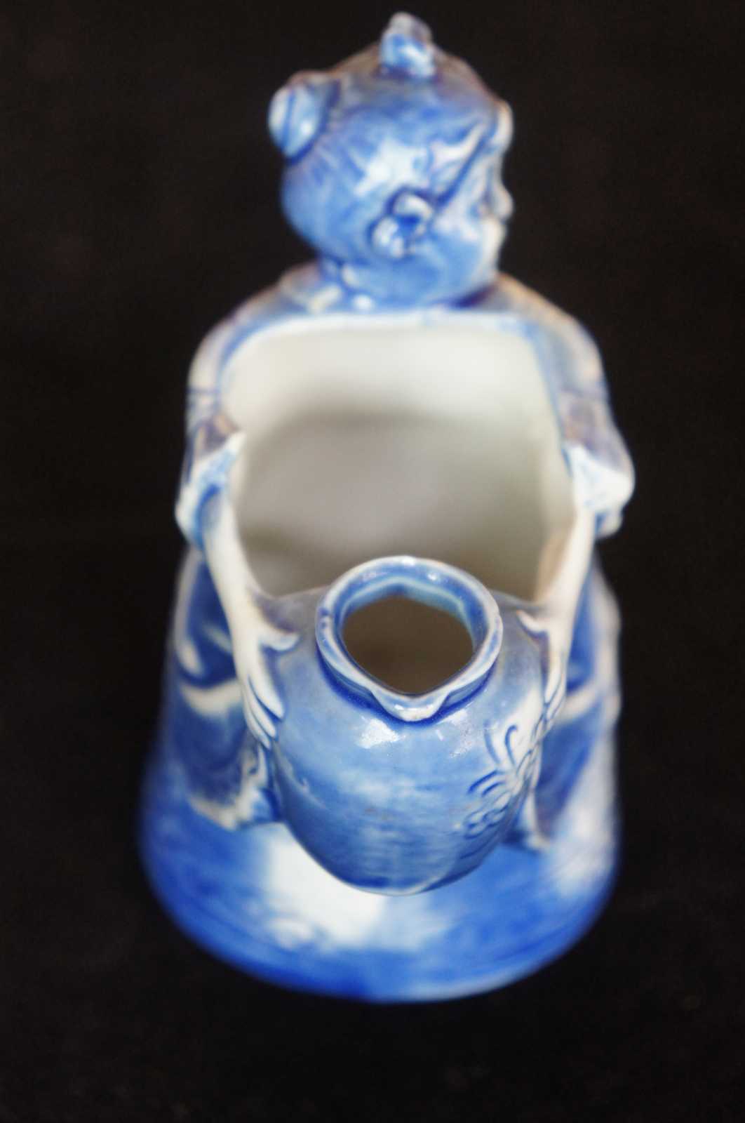 Vintage milk maiden pitcher in blue porcelain featuring a woman in a dress holding a jug.