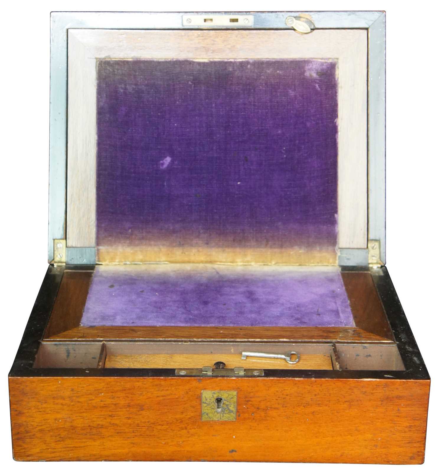 Antique Victorian campaign writing desk slope. Made of walnut featuring purple velvet writing surface with multiple compartments and functional lock / key. Few extra accessories included.