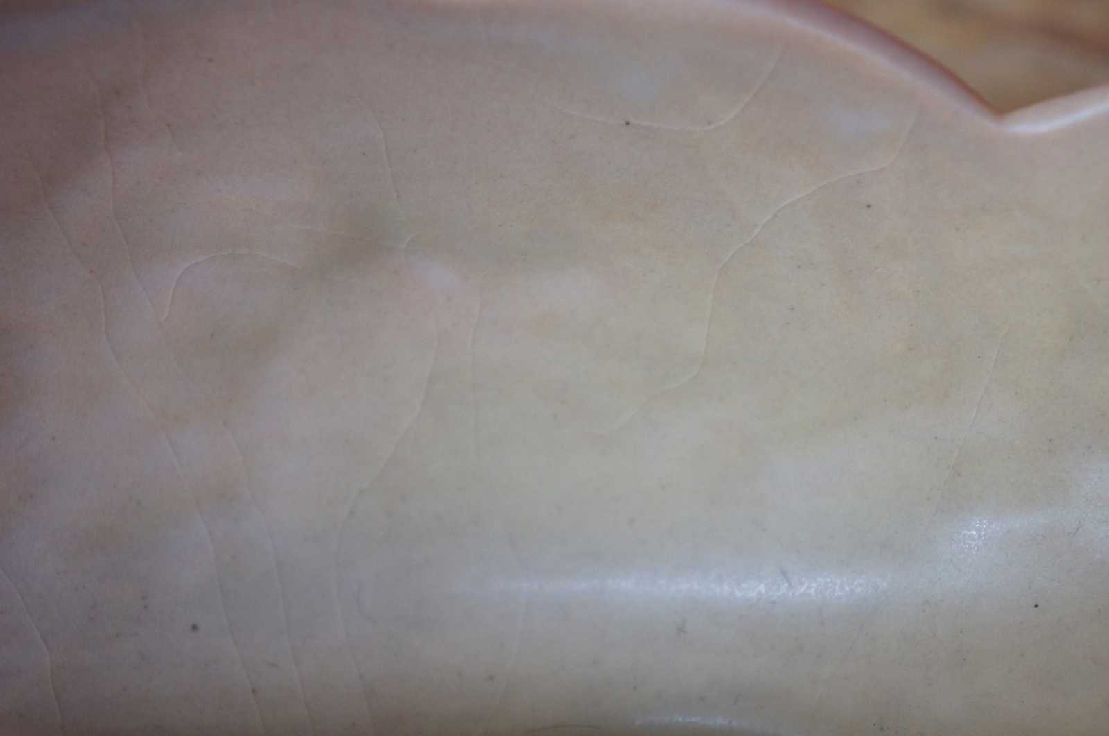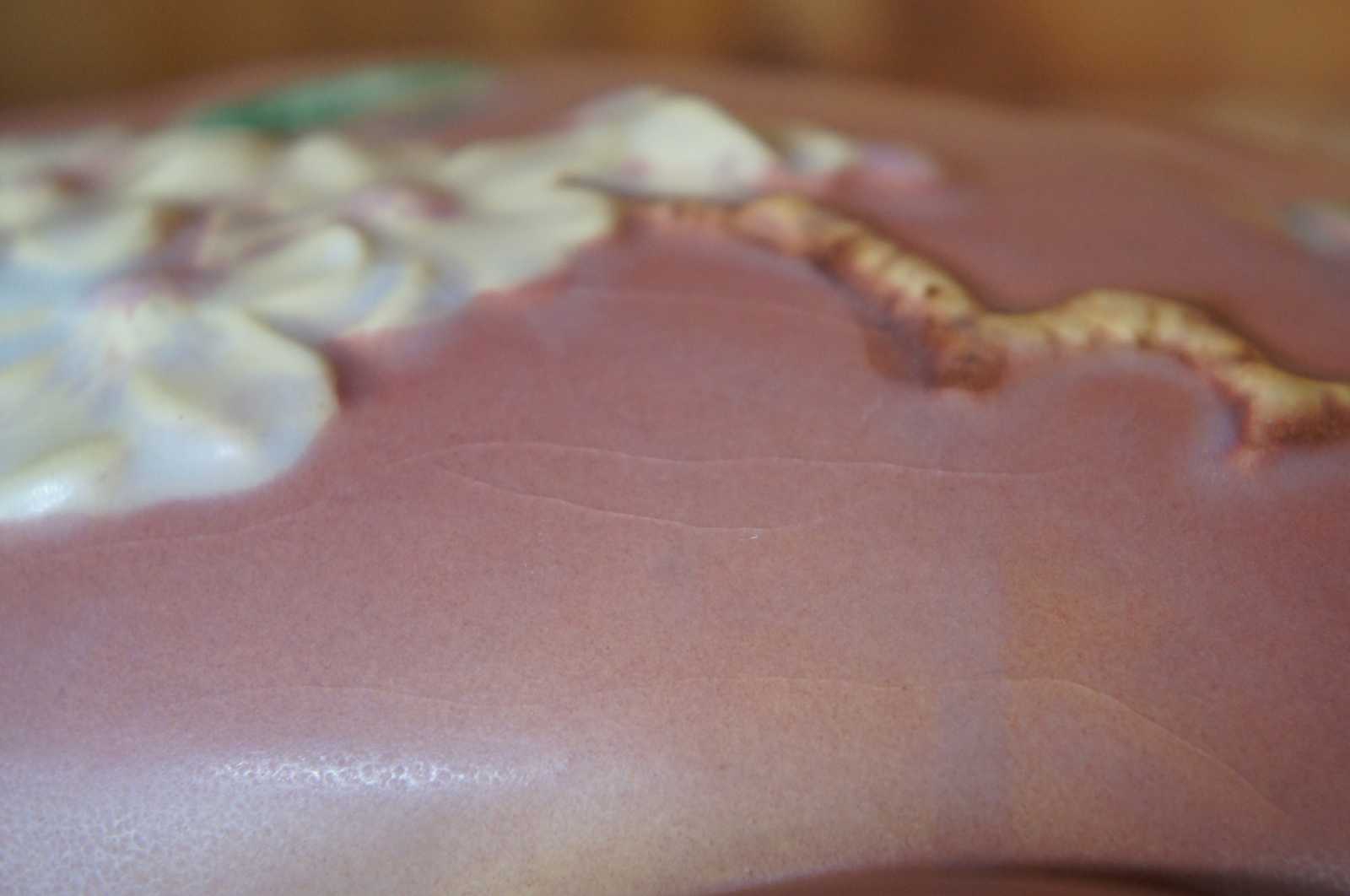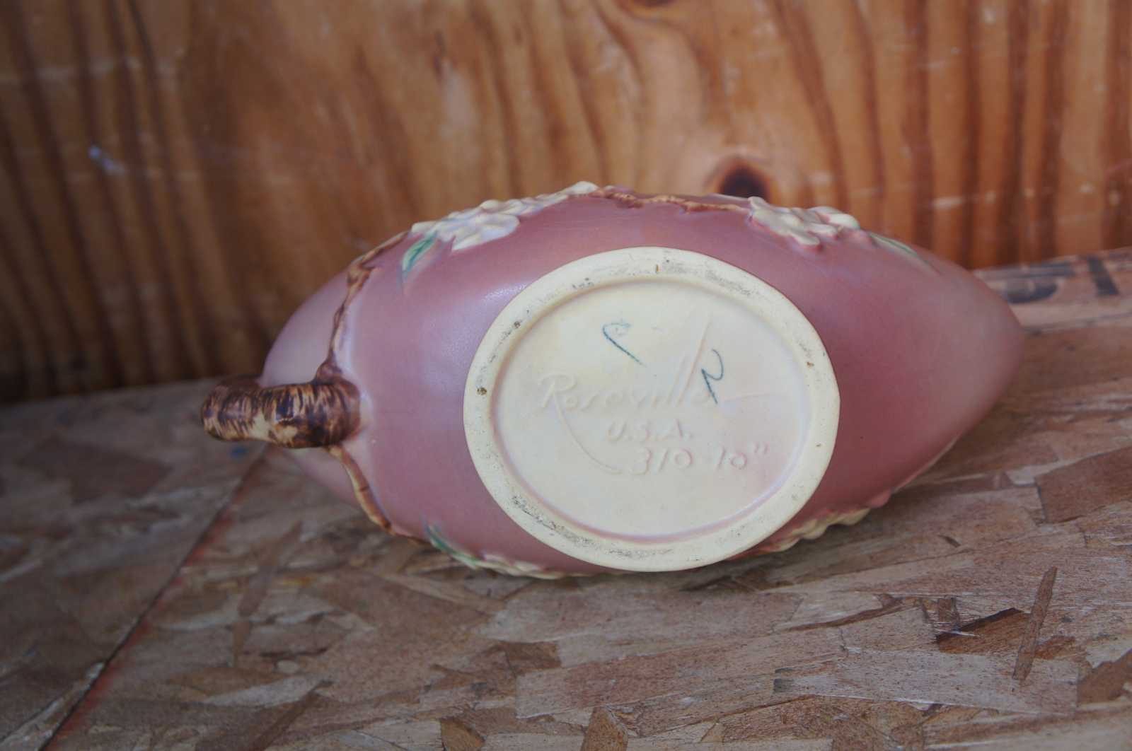 Vintage Roseville USA pottery scalloped footed basket featuring pink apple blossom pattern with twig handle and floral motif. 310-10.