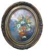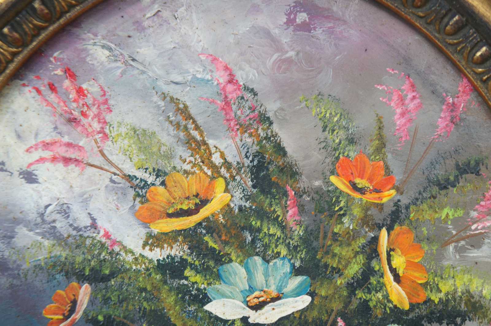 20th century still life oil painting on board.. Features a bouquet of flowers in an oval frame with raised flowers. Marked Worshop of Ran Su in Merrick NY