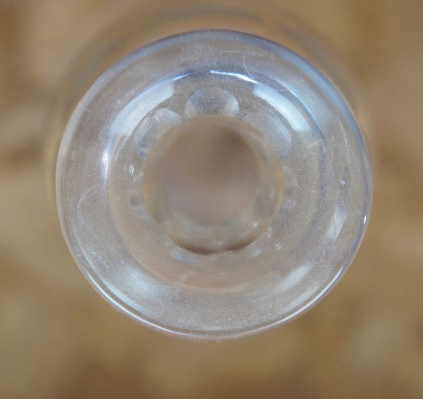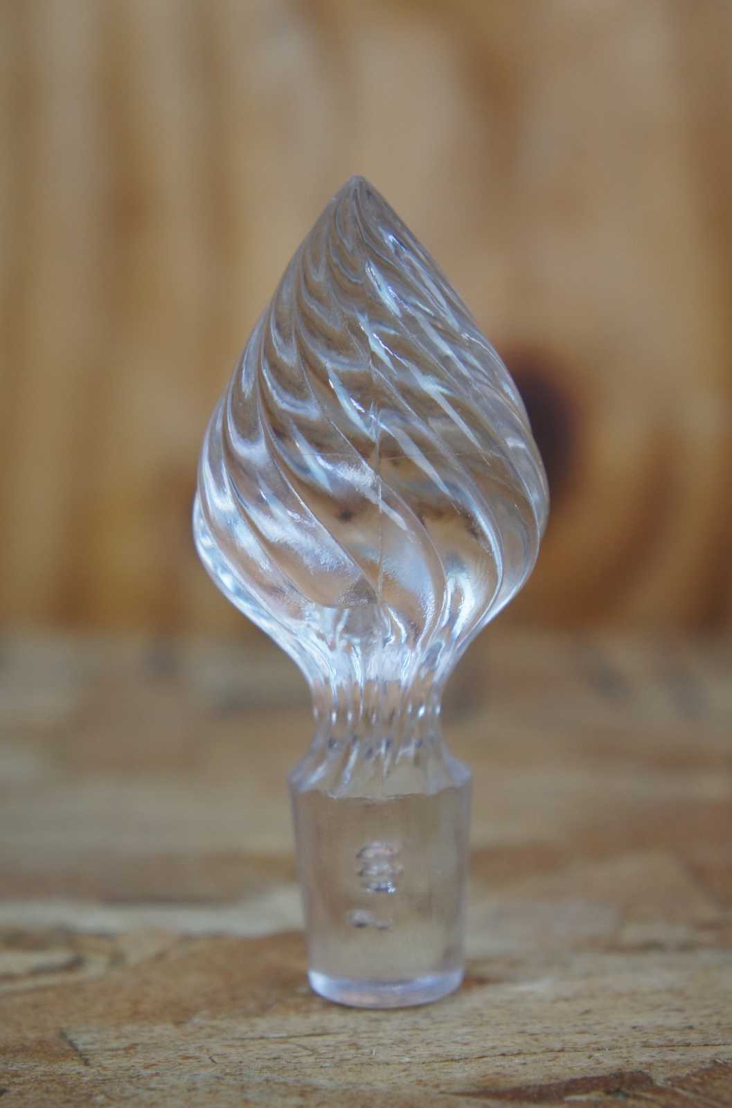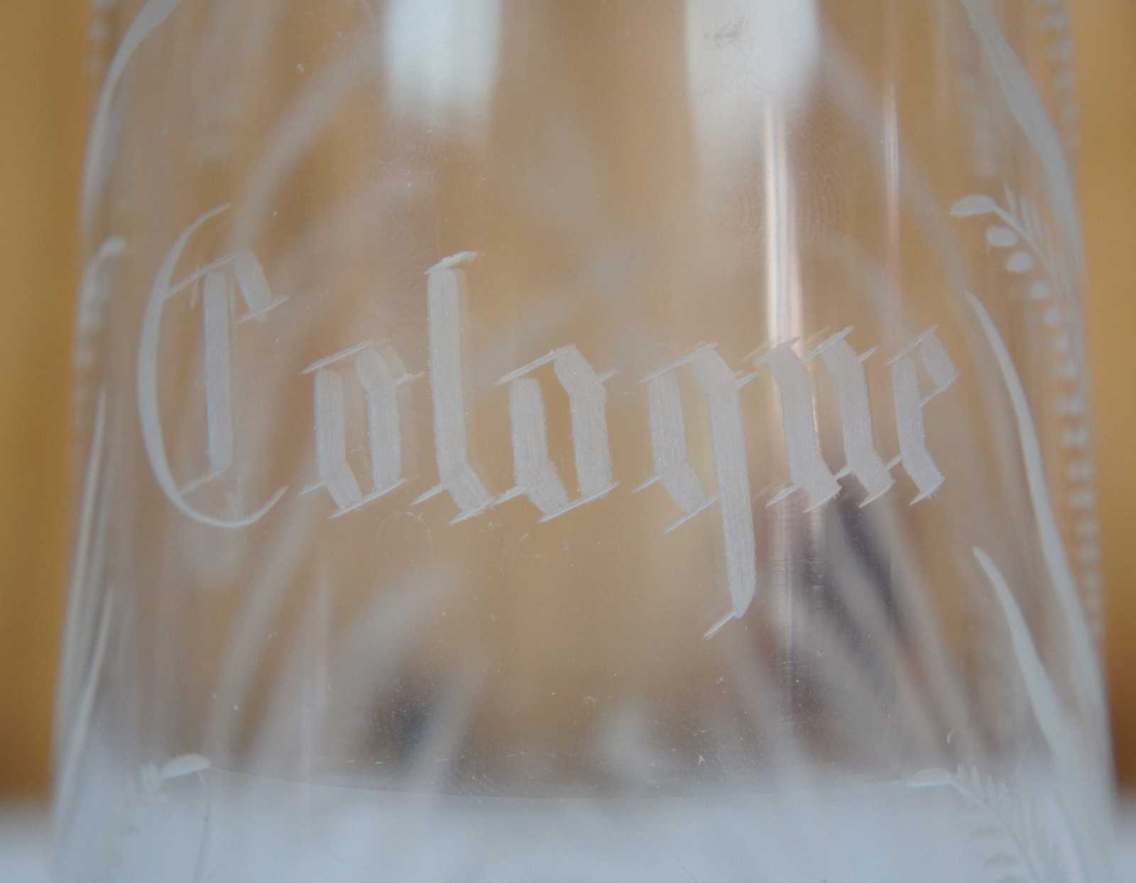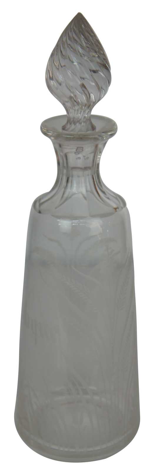 Antique Victorian barber shop cologne bottle decanter and stopper featuring etched crystal with butterfly or dragonfly and wheat (maiden) grass / floral motif.