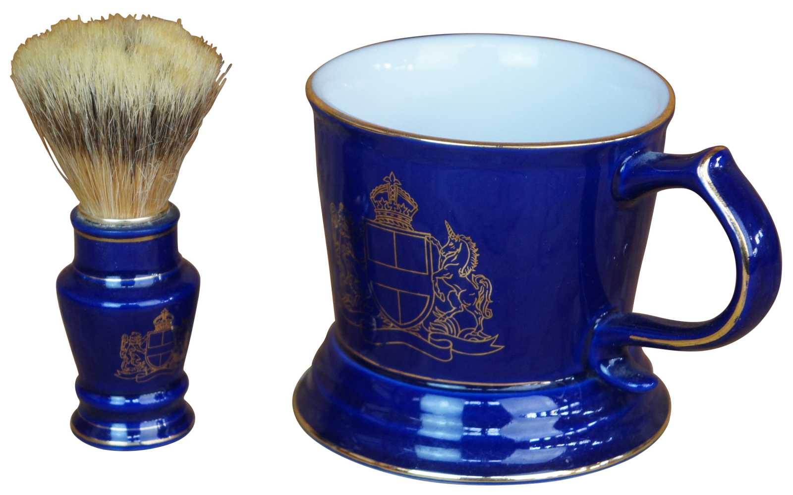 Royal London Shaving Mug & Brush. Cobalt blue with gold trim