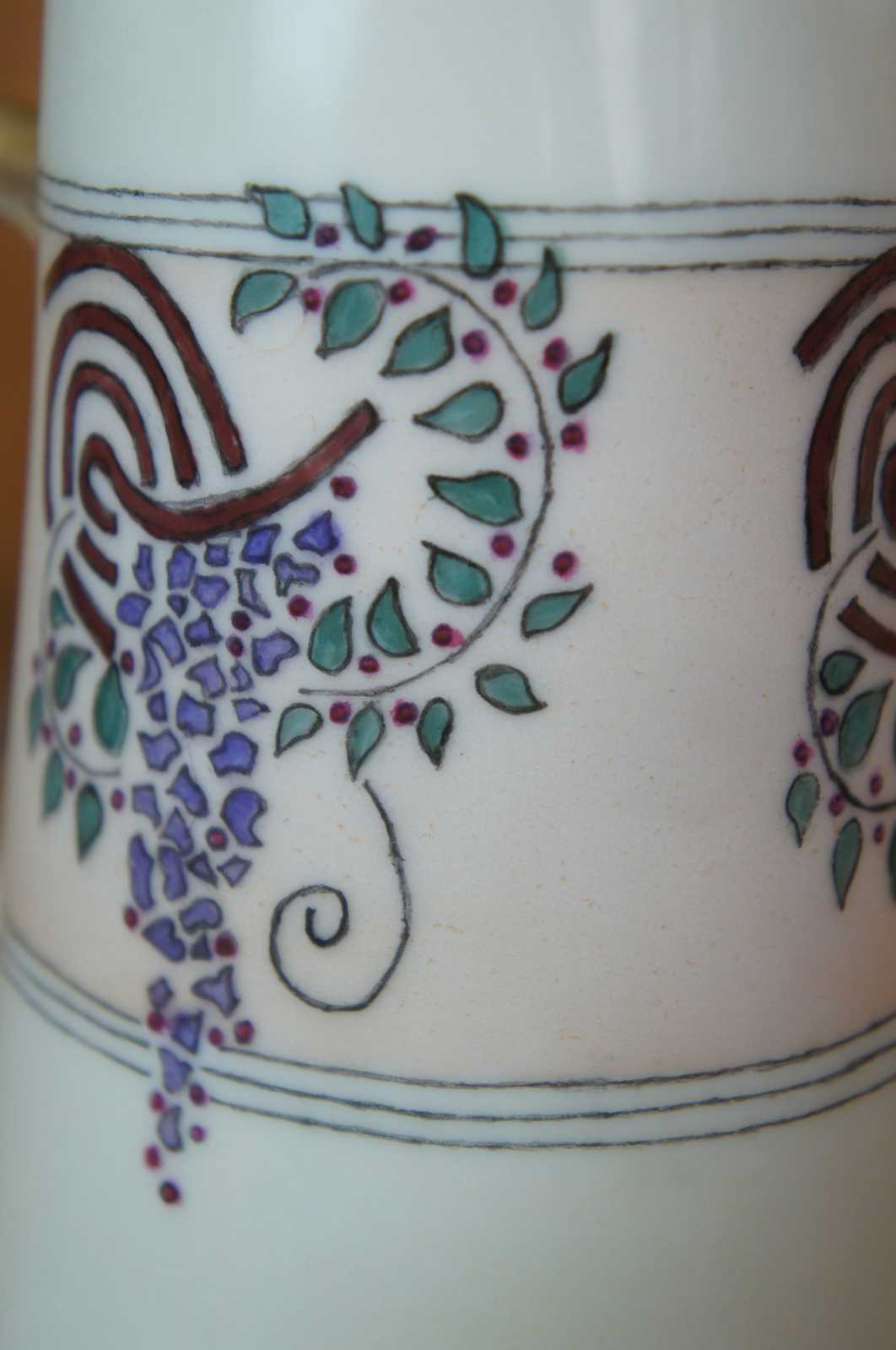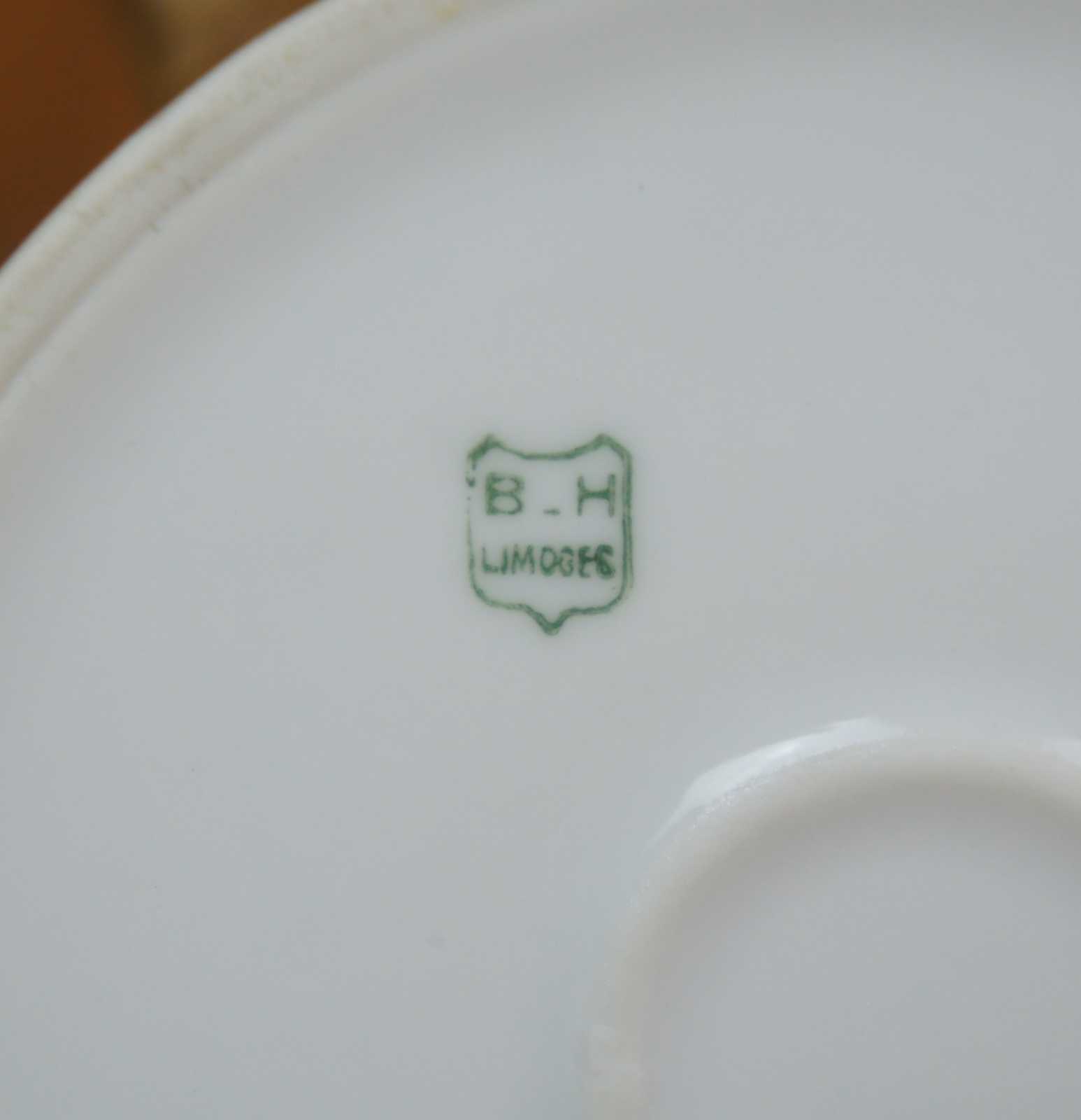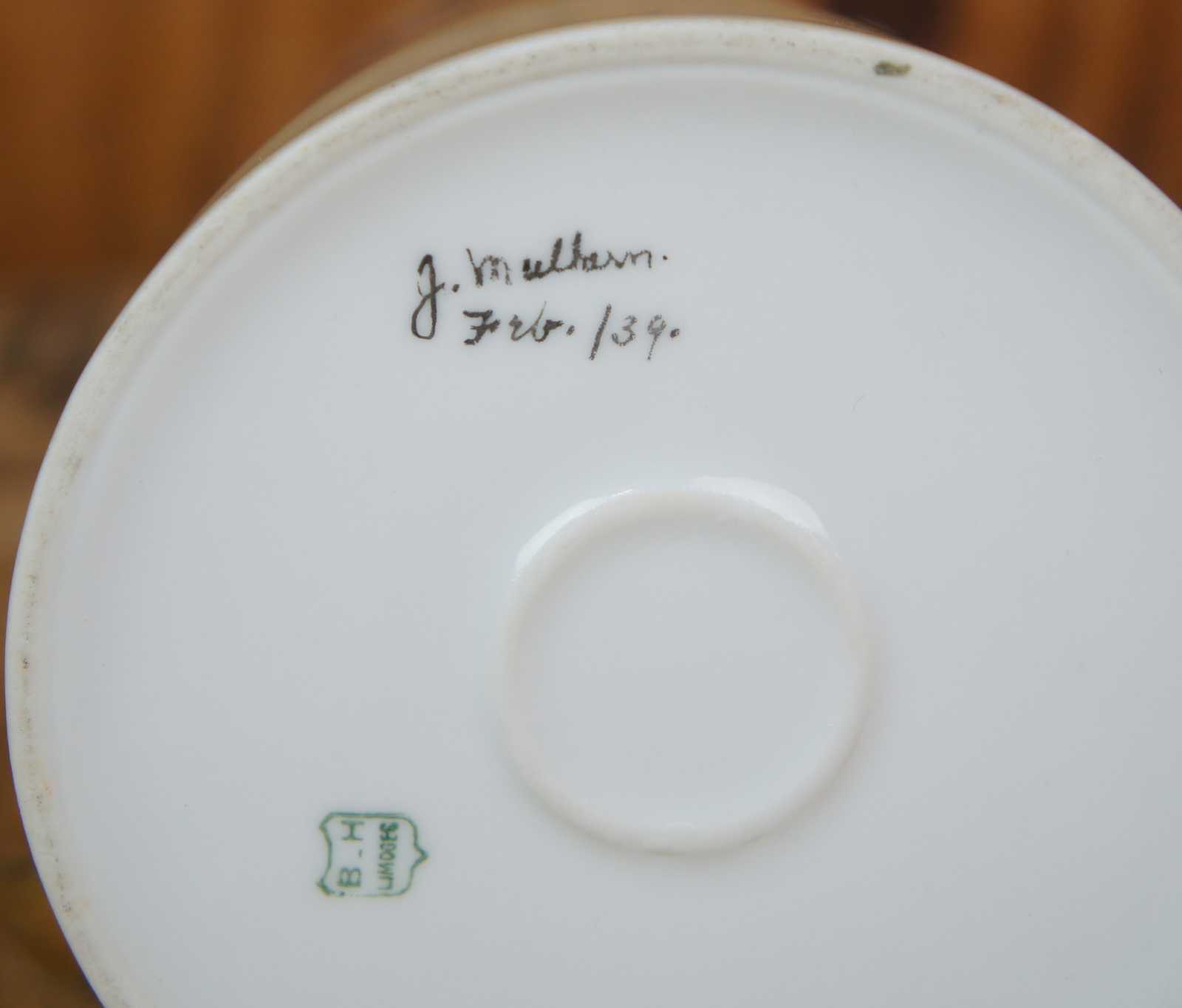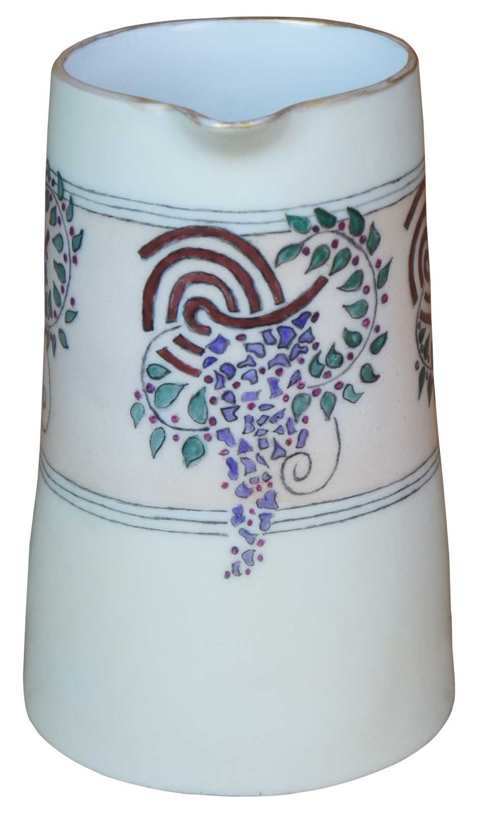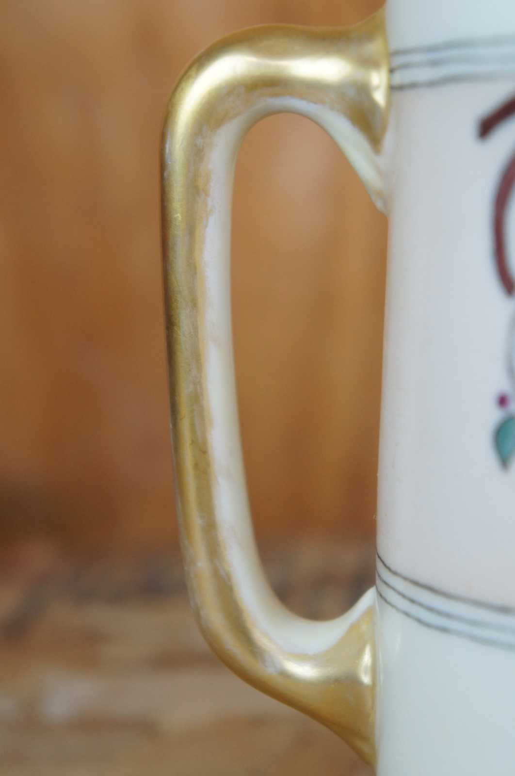 1939 B.H. Limoges Tankard Pitcher. Beautifully hand painted with a unique floral and grape pattern with gilding. Hand signed along base.