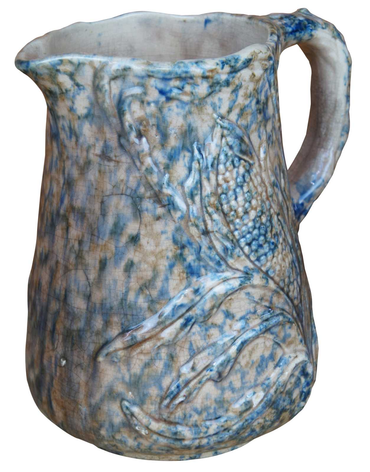 Roseville Cornelian blended majolica blue glaze pitcher with corn. Features an ear of corn design with cobalt blue / light blue / white mottled spoungeware / stoneware glaze with a hint of the factory gold gilt glaze. Circa 1900-1902. (Ref: Huxford, Second Series, pg. 39)