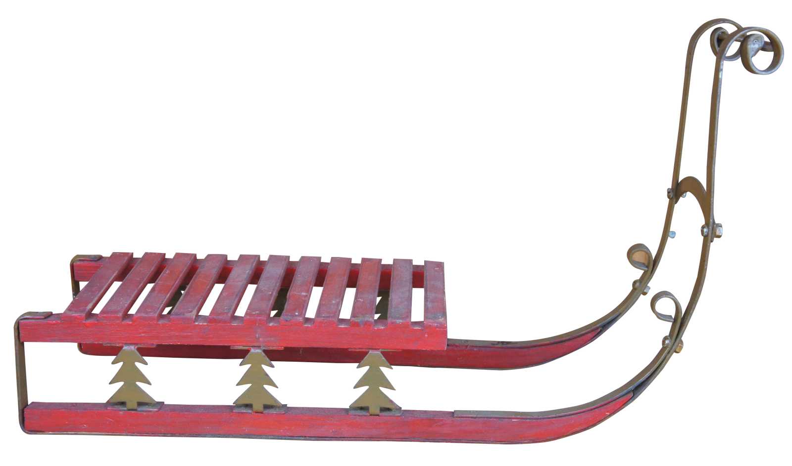 Vintage folk art toy or childs christmas sleigh/ sled / toboggan. Made of slatted wood with scrolled iron accents featuring cut out christmas trees.