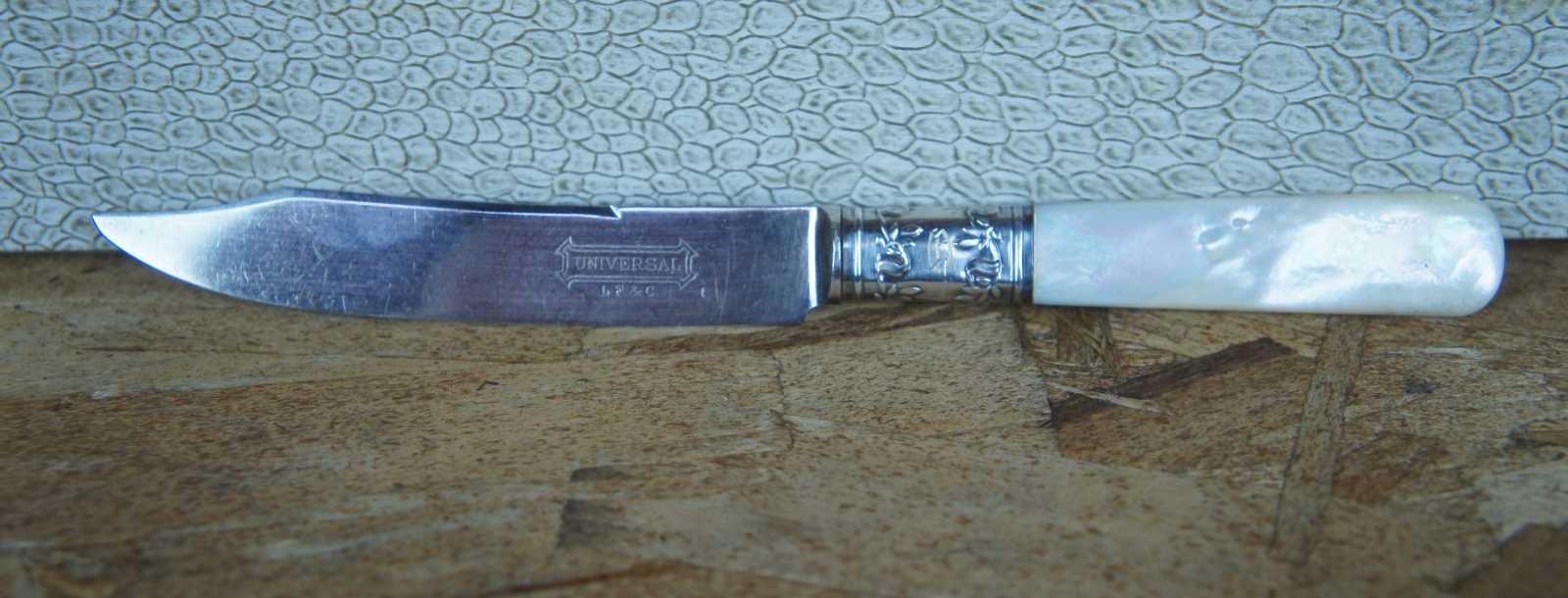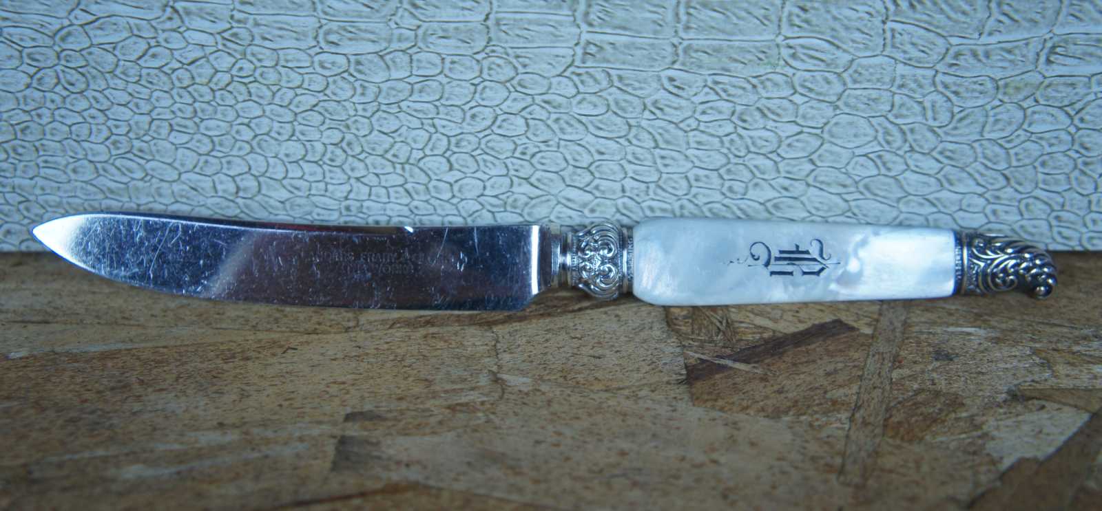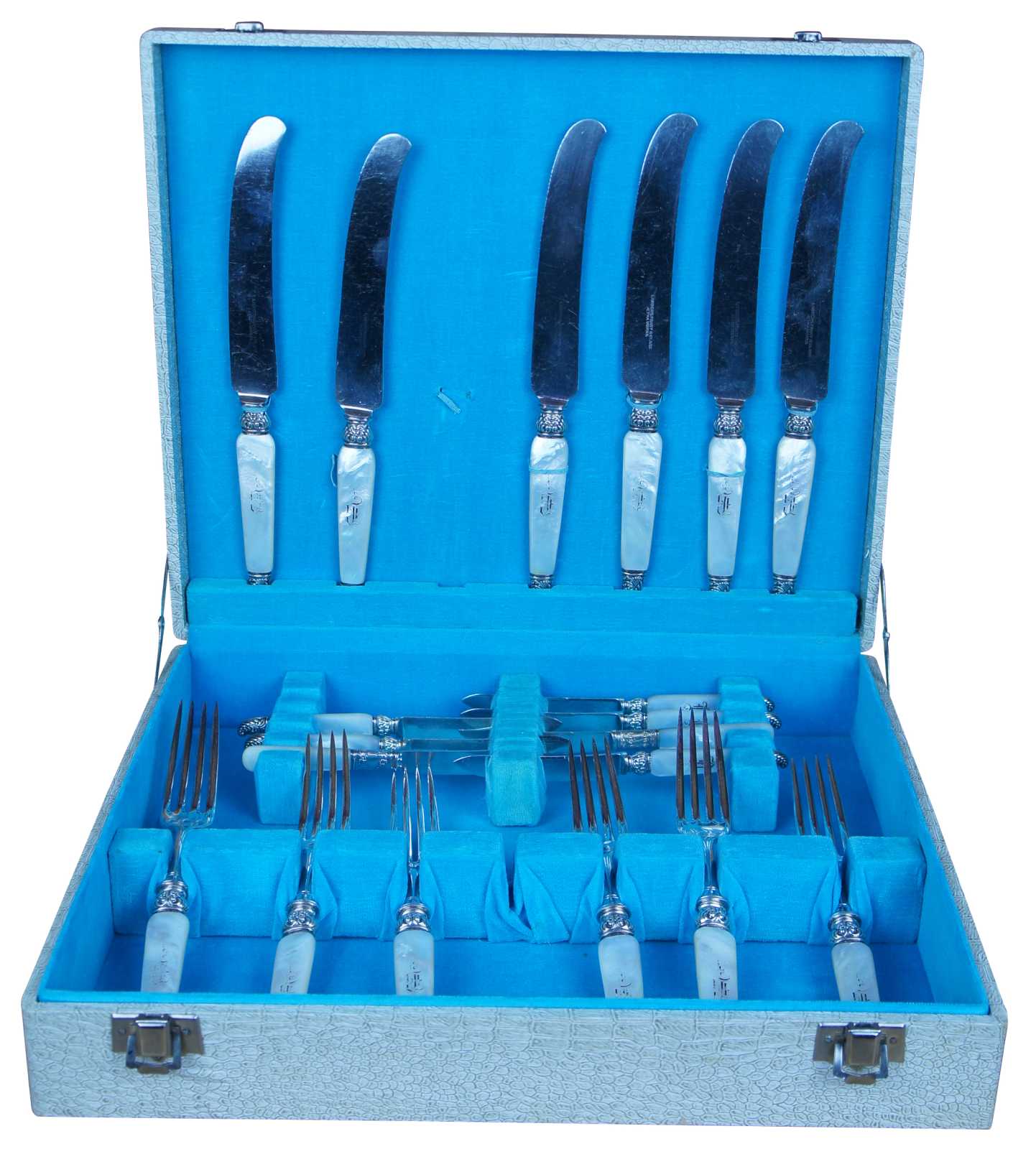 19 Antique Landers, Frary & Clark (LF&C) sterling silver 925 and mother of pearl (MOP) forks and knives featuring baroque styling. Case included.