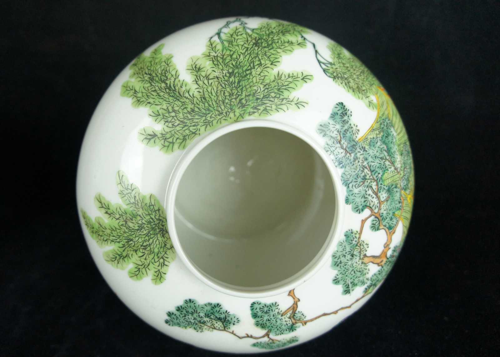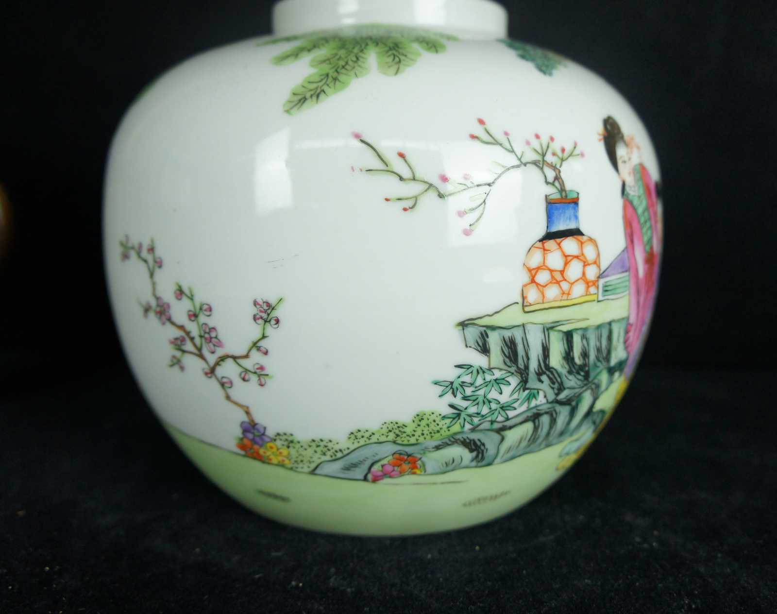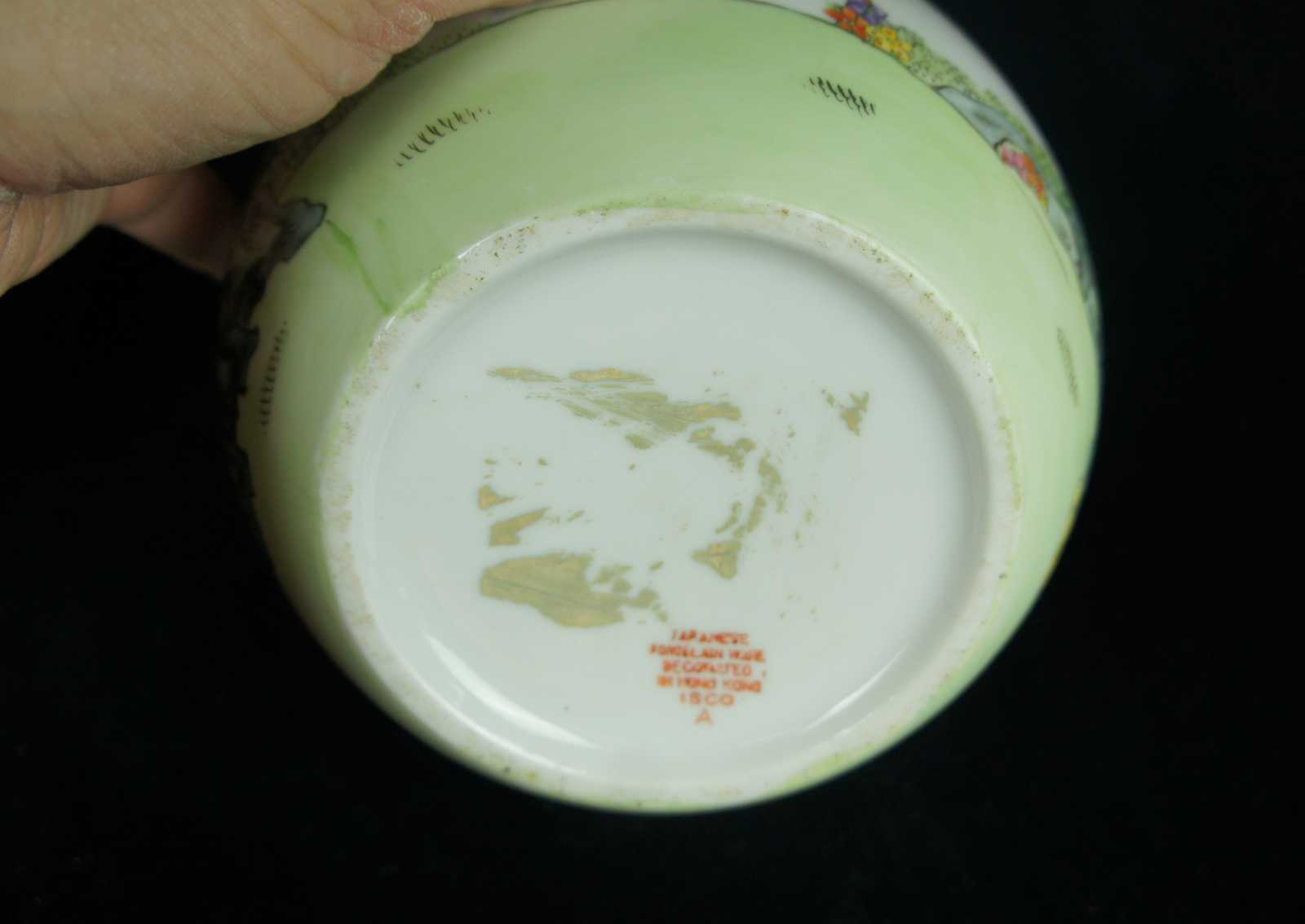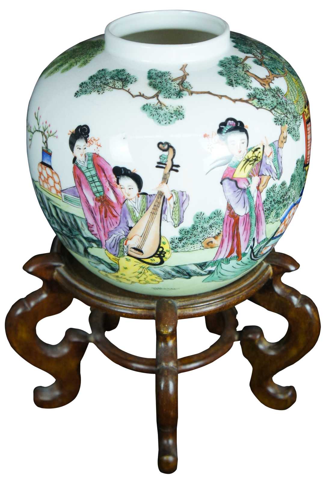 Vintage ISCO Japanese Hong Kong porcelain urn or vase with ornate hardwood base. Features hand painted floral landscape scene with geishas playing instruments outside of a pagoda.