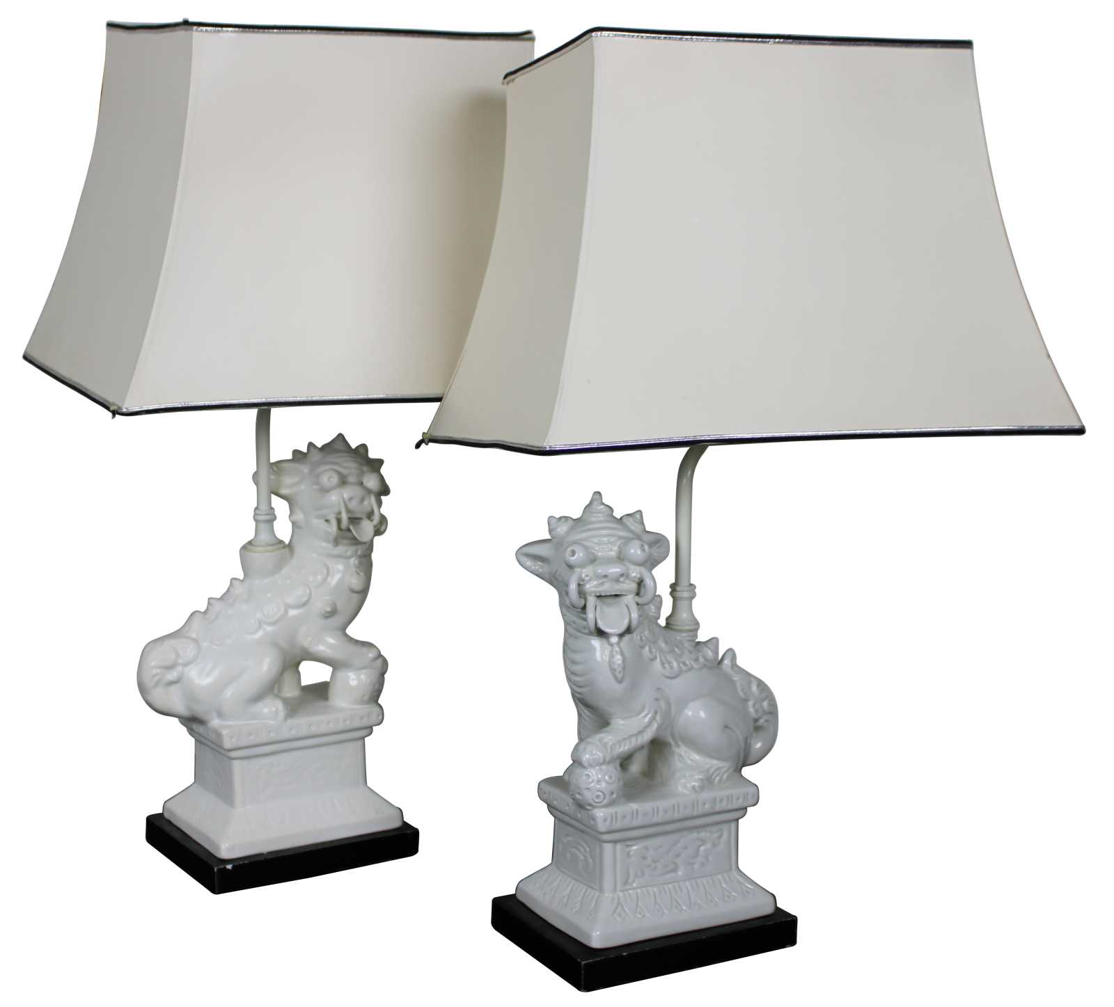 Two vintage Chinese Blanc De Chine white Dehua provence foo dog lamps. Made of white porcelain featuring ornate guardian dogs with wide eyes and ornate tusks