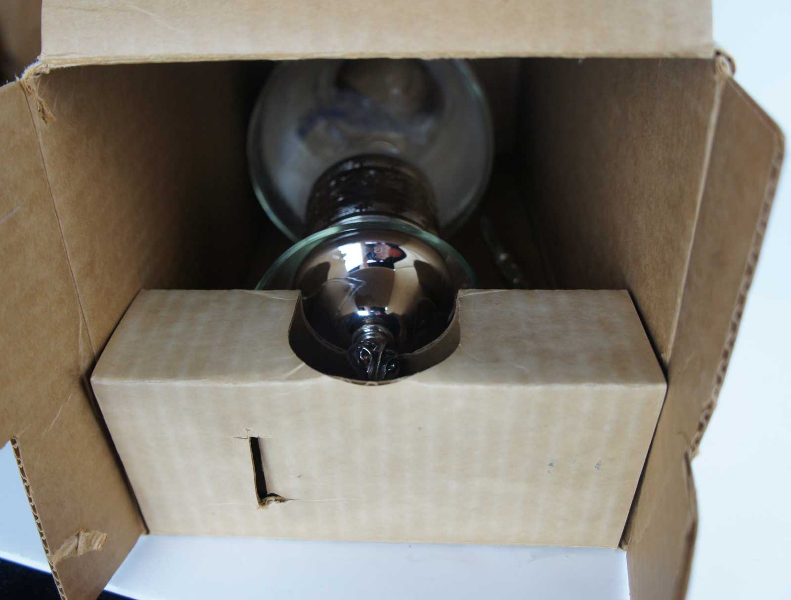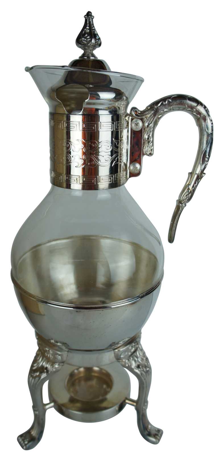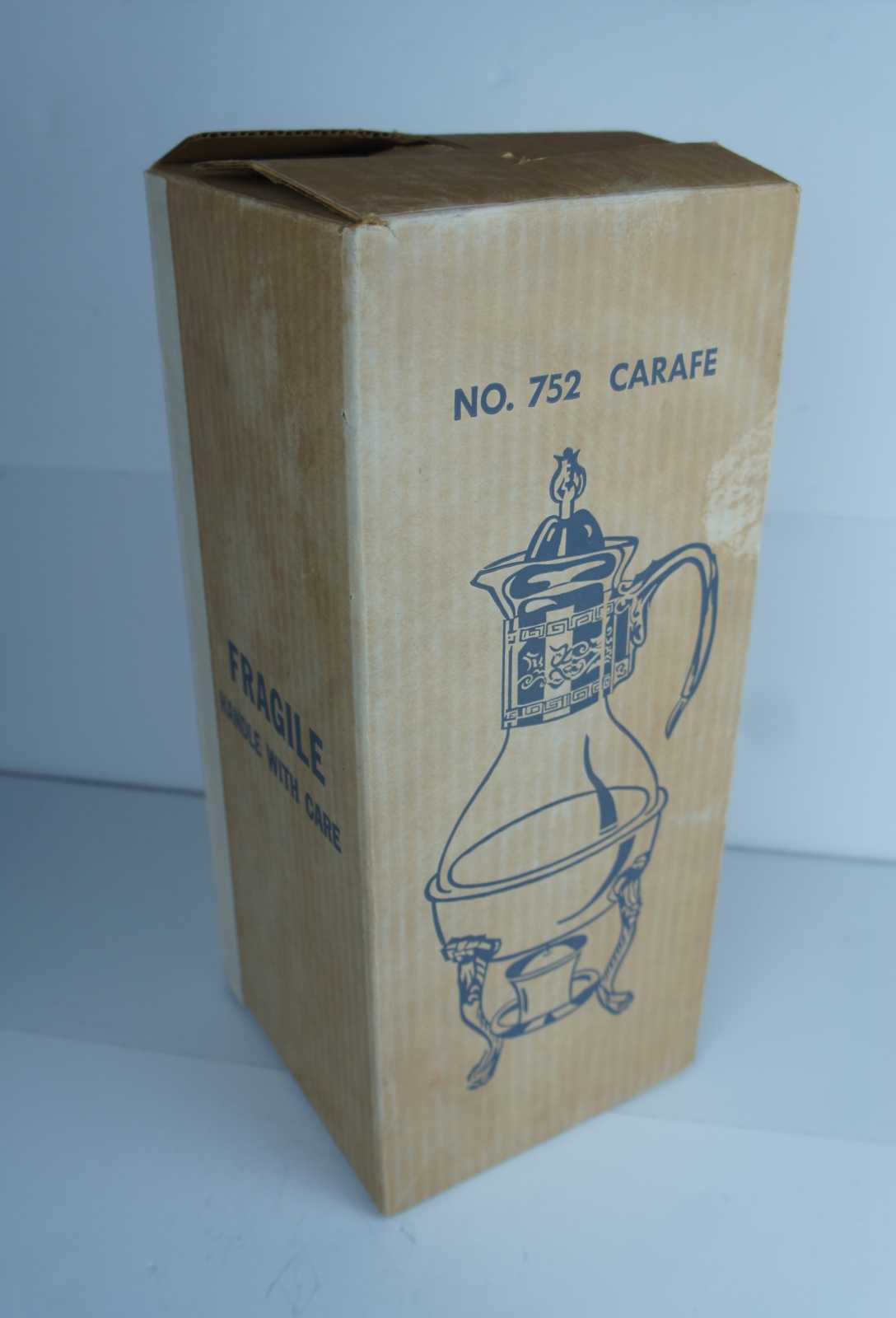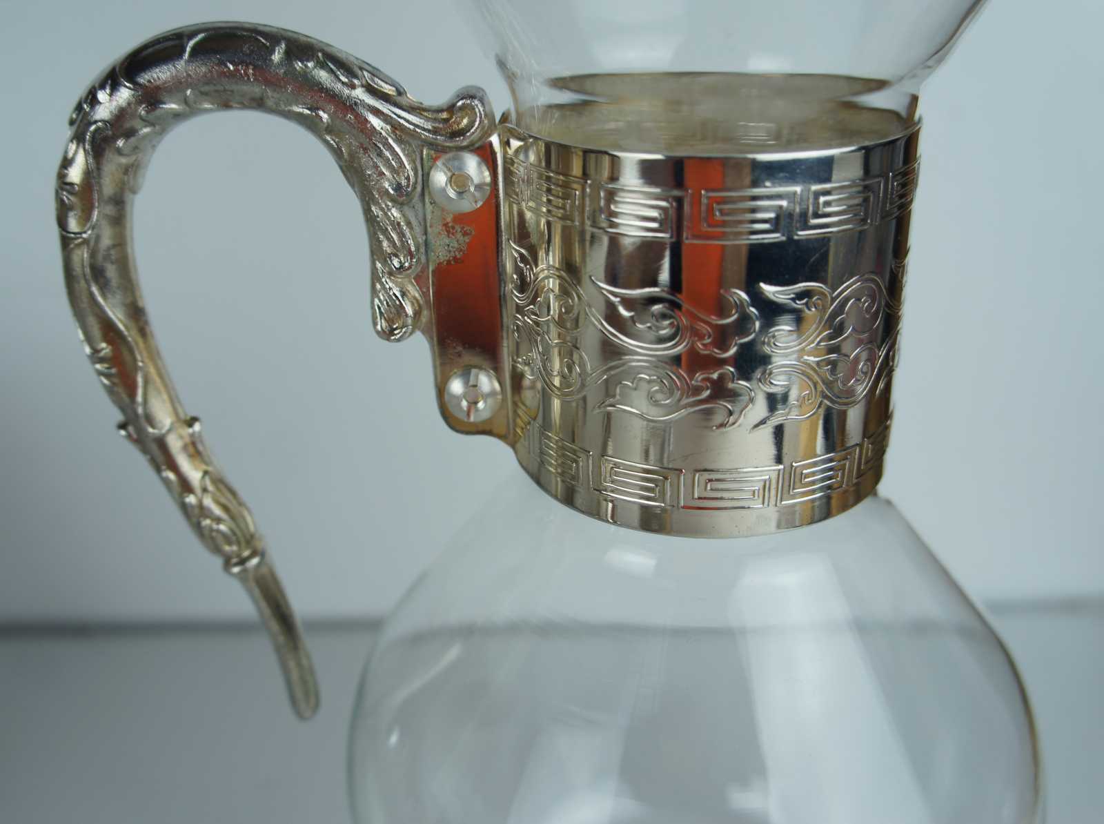 Vintage silver plate and glass coffee or tea carafe featuring a Greek key and floral motif. New old stock, does not appear to have been used.