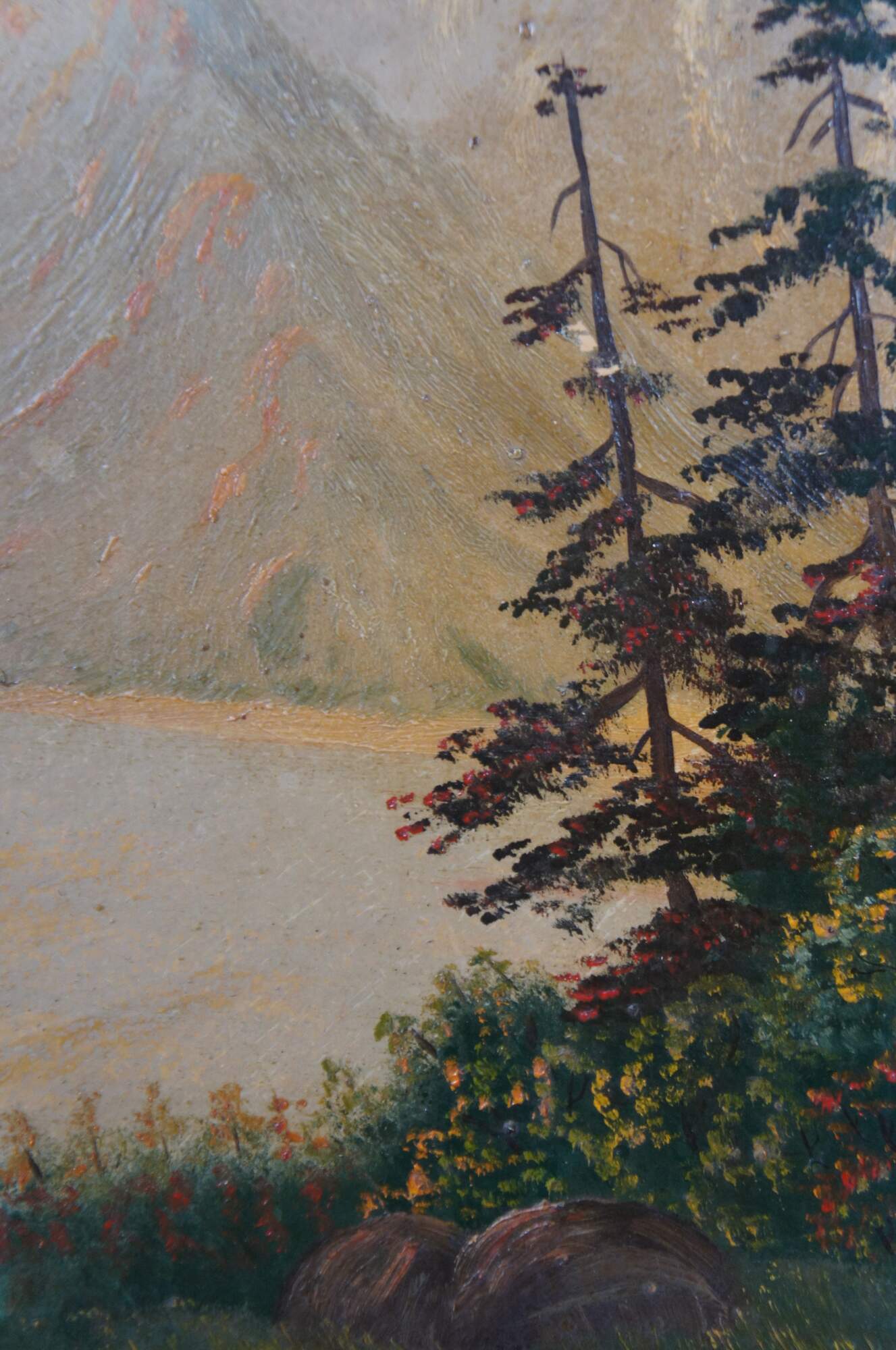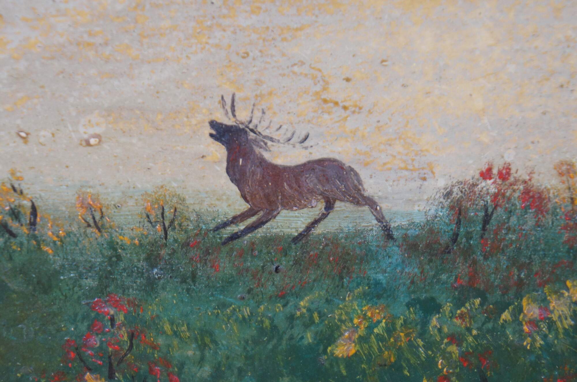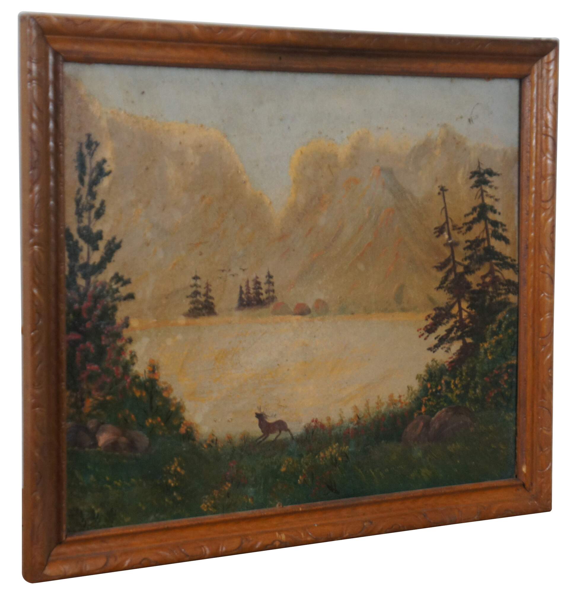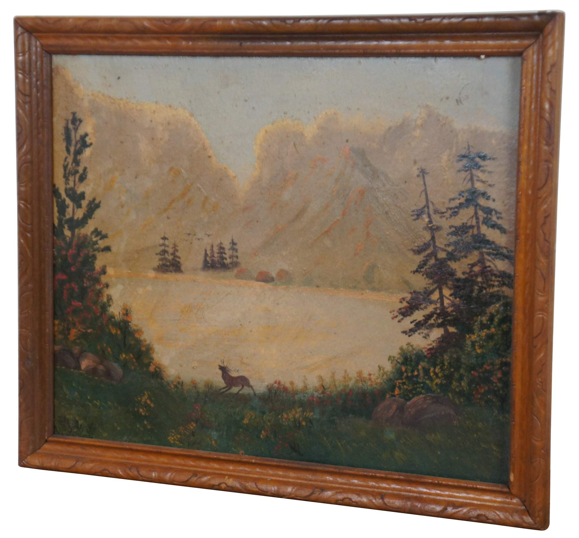 Mid century Nan Rogers oil on board landscape painting of a lake surrounded by mountains and trees with a buck / stag in the center. Signed in the upper right corner. Circa 1949.