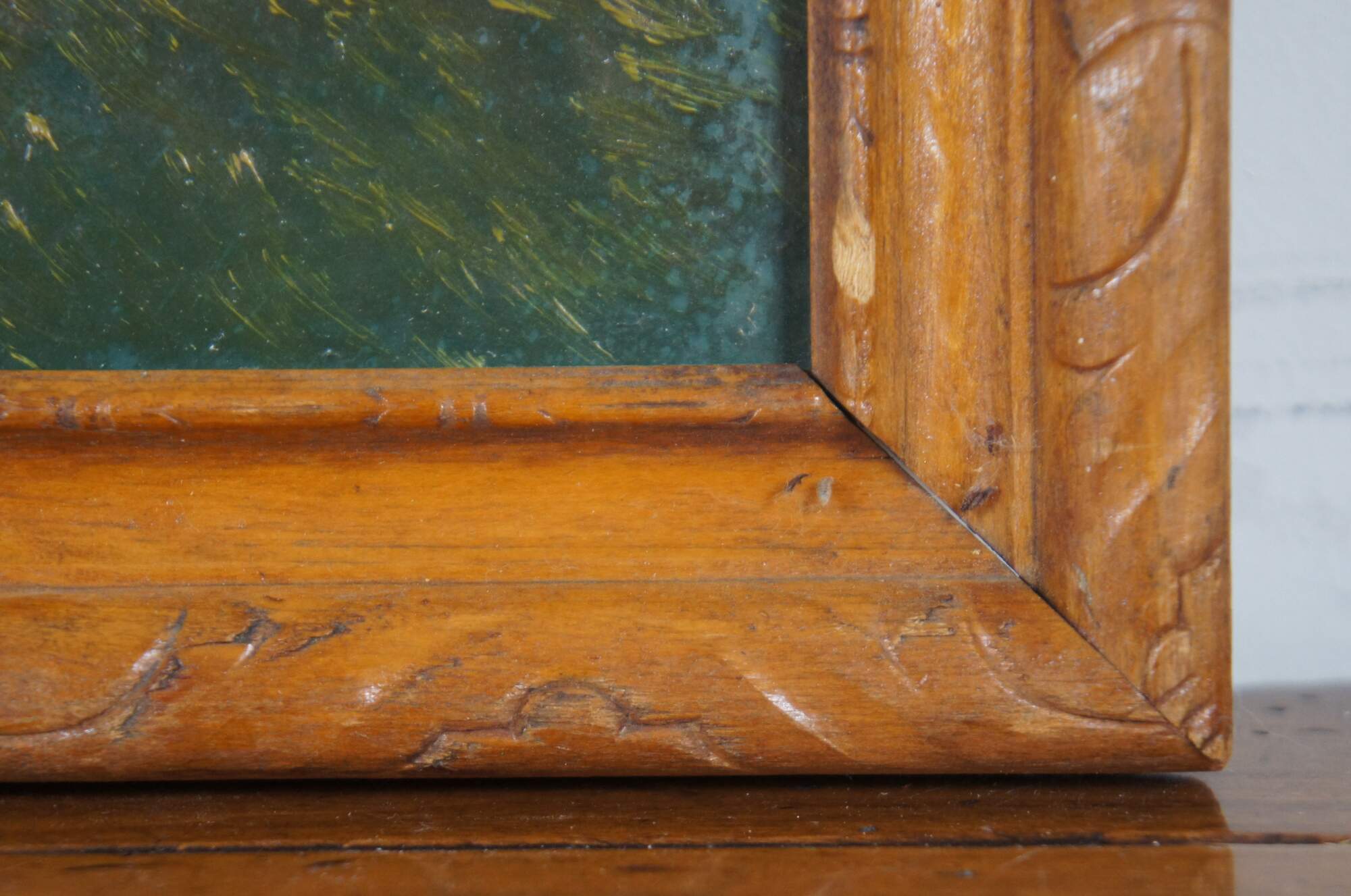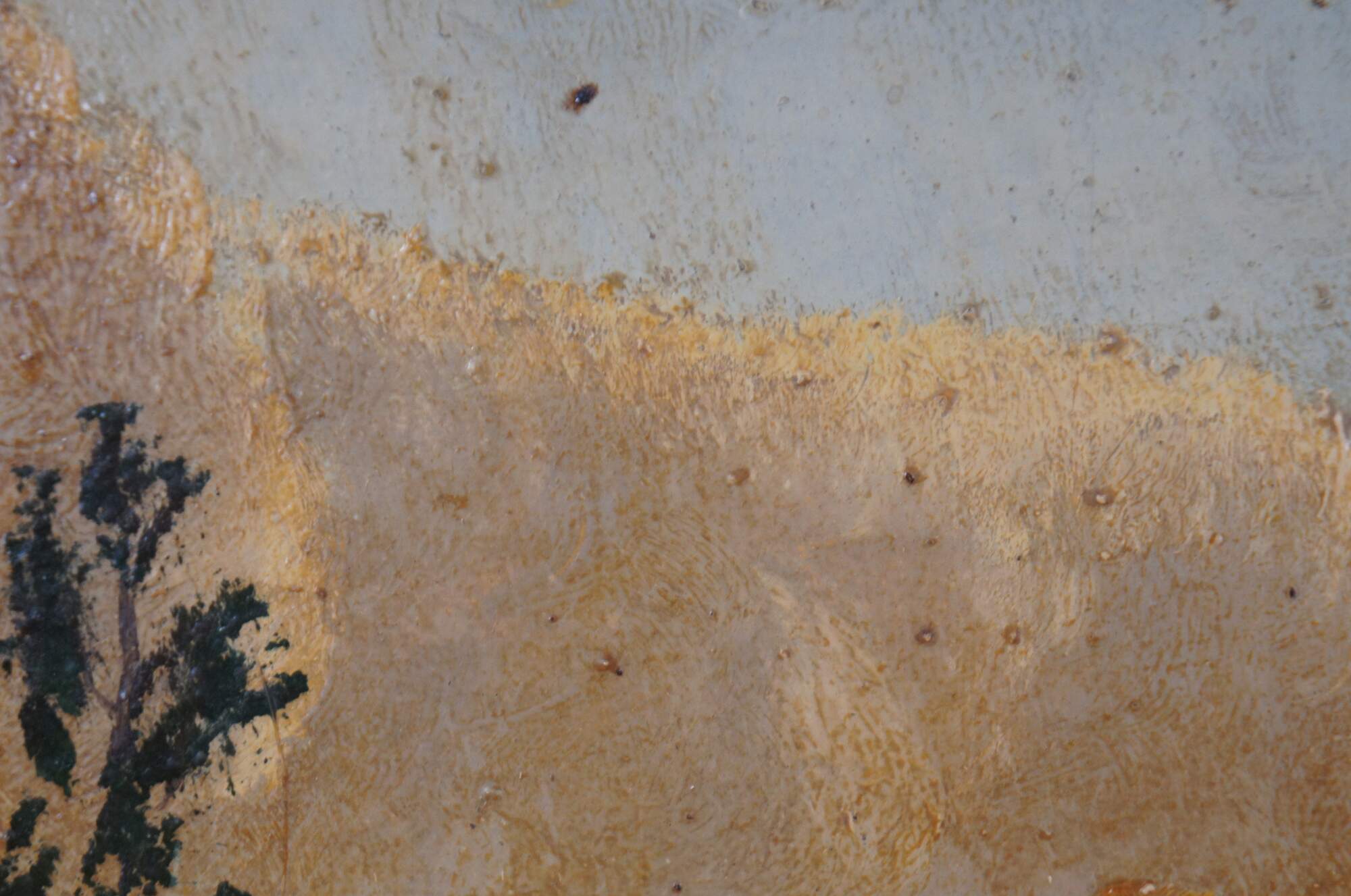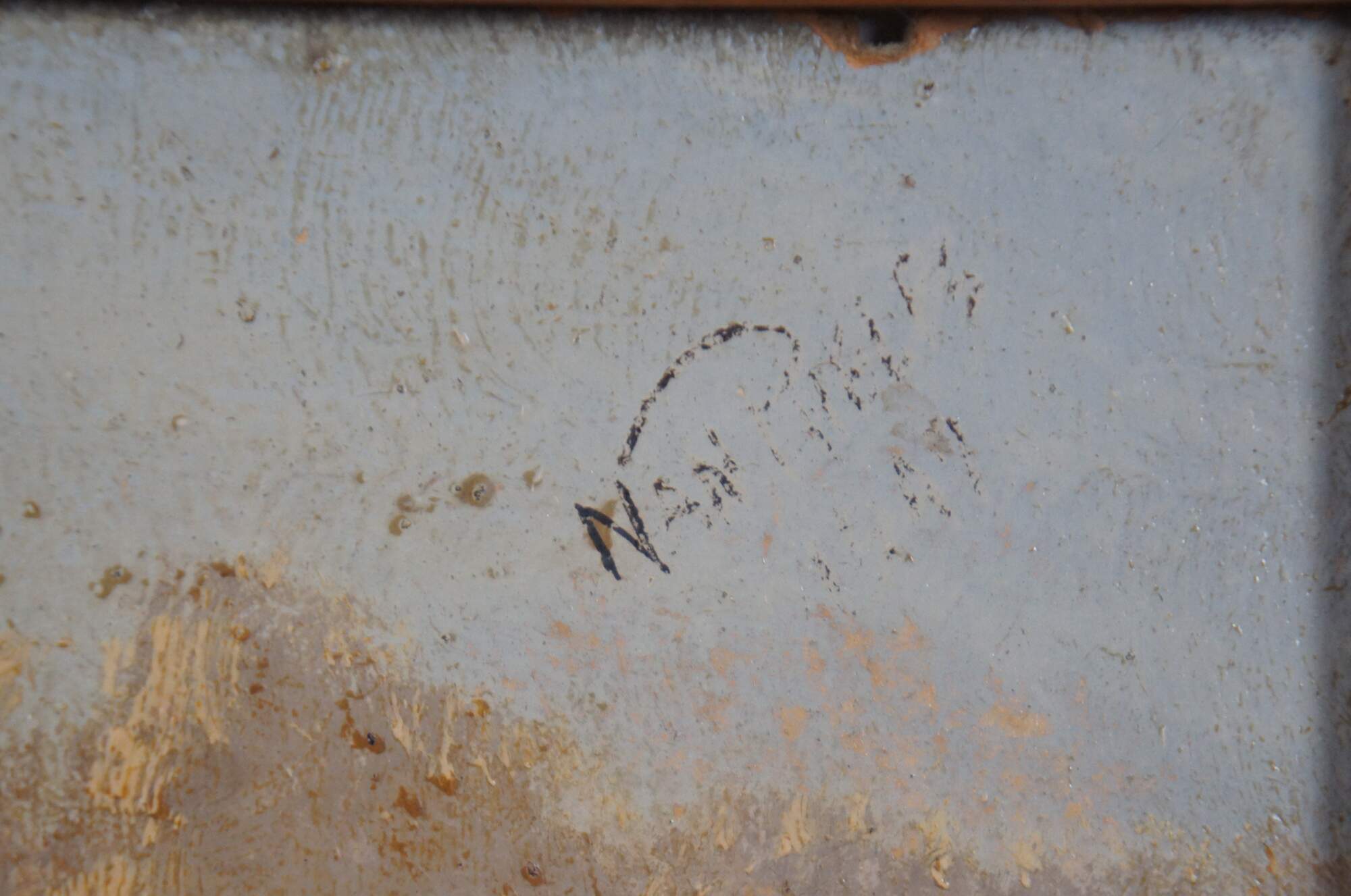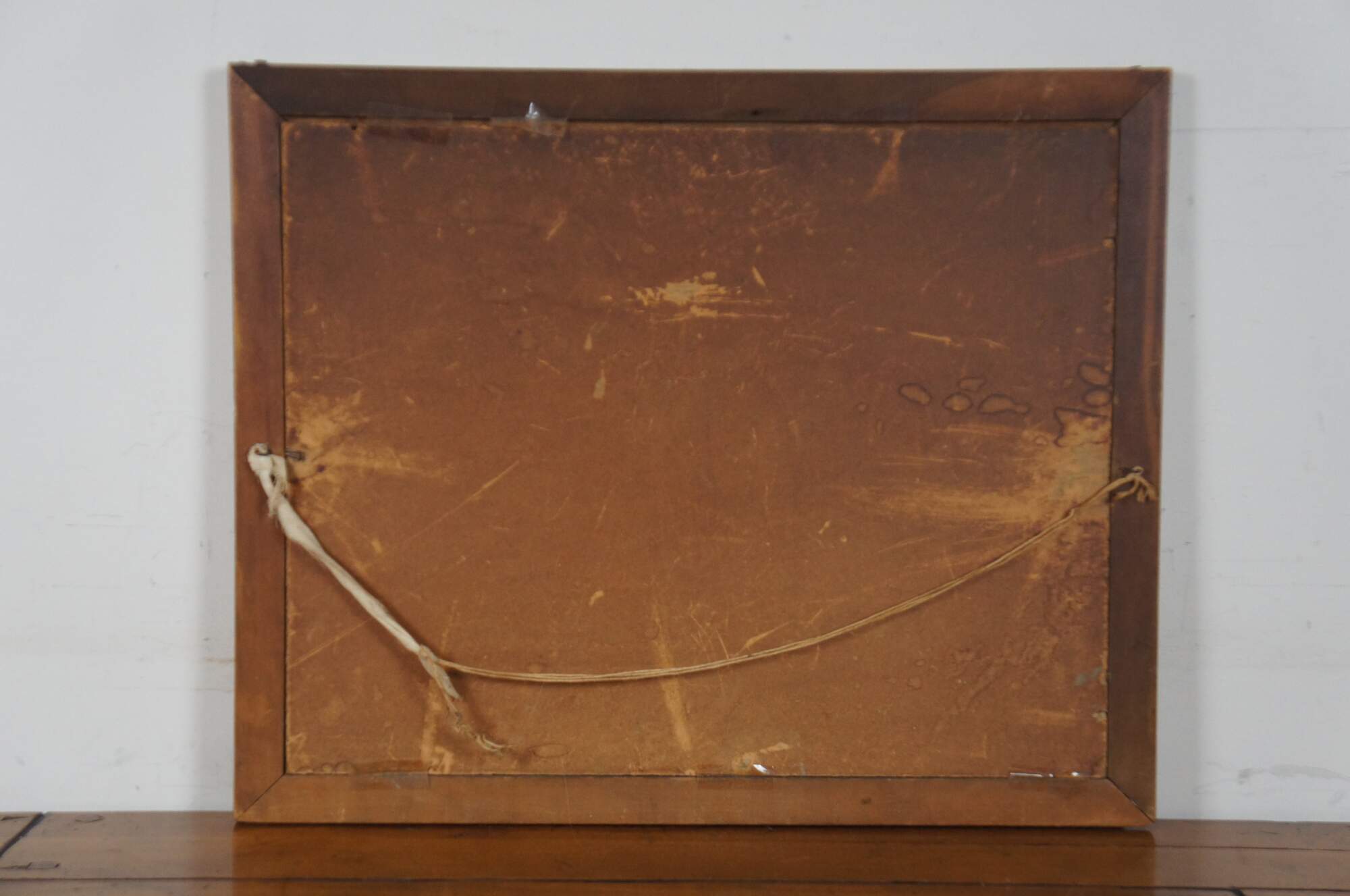 Mid century Nan Rogers oil on board landscape painting of a lake surrounded by mountains and trees with a buck / stag in the center. Signed in the upper right corner. Circa 1949.