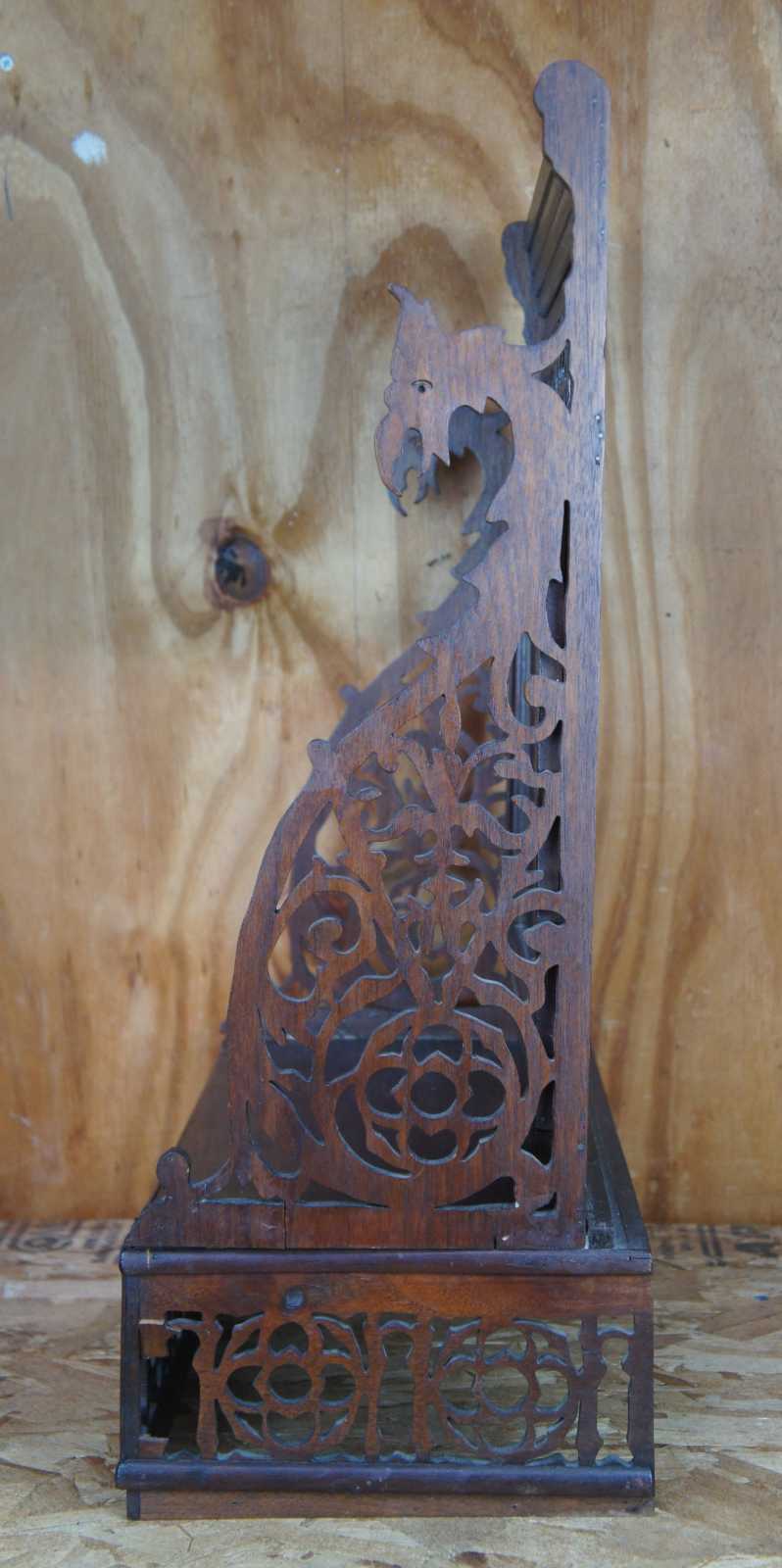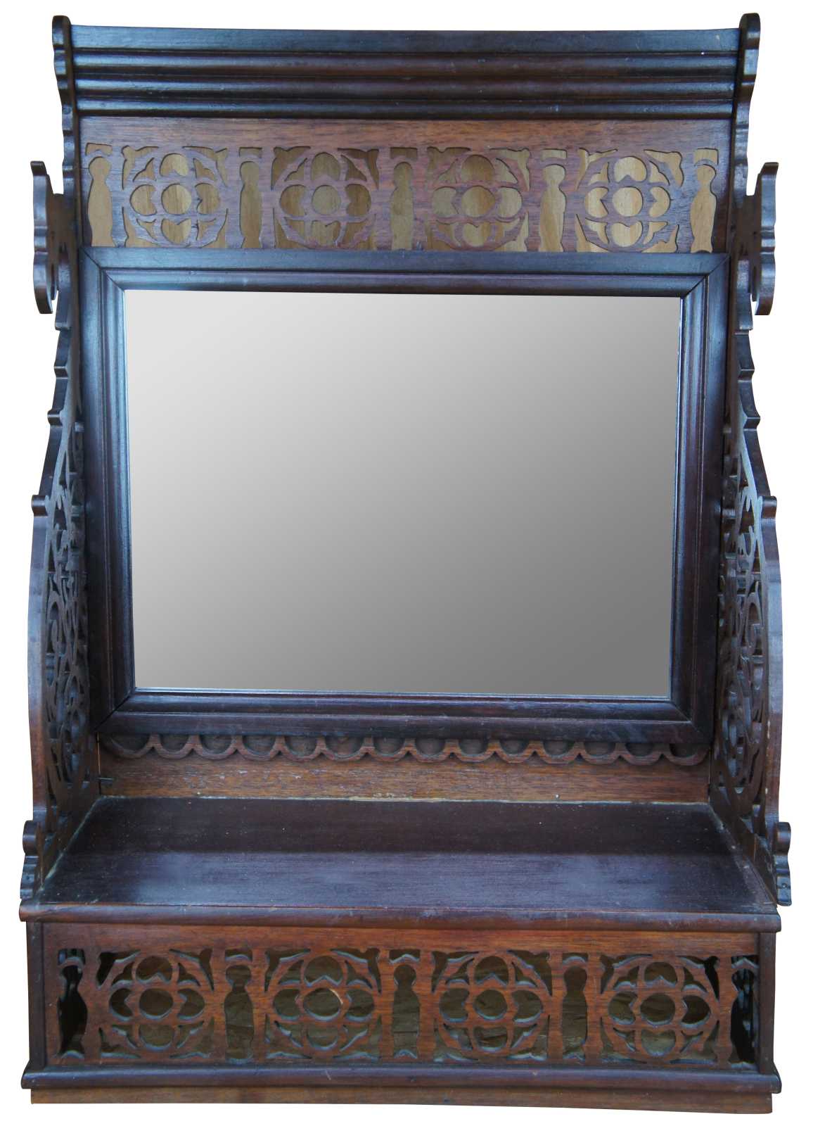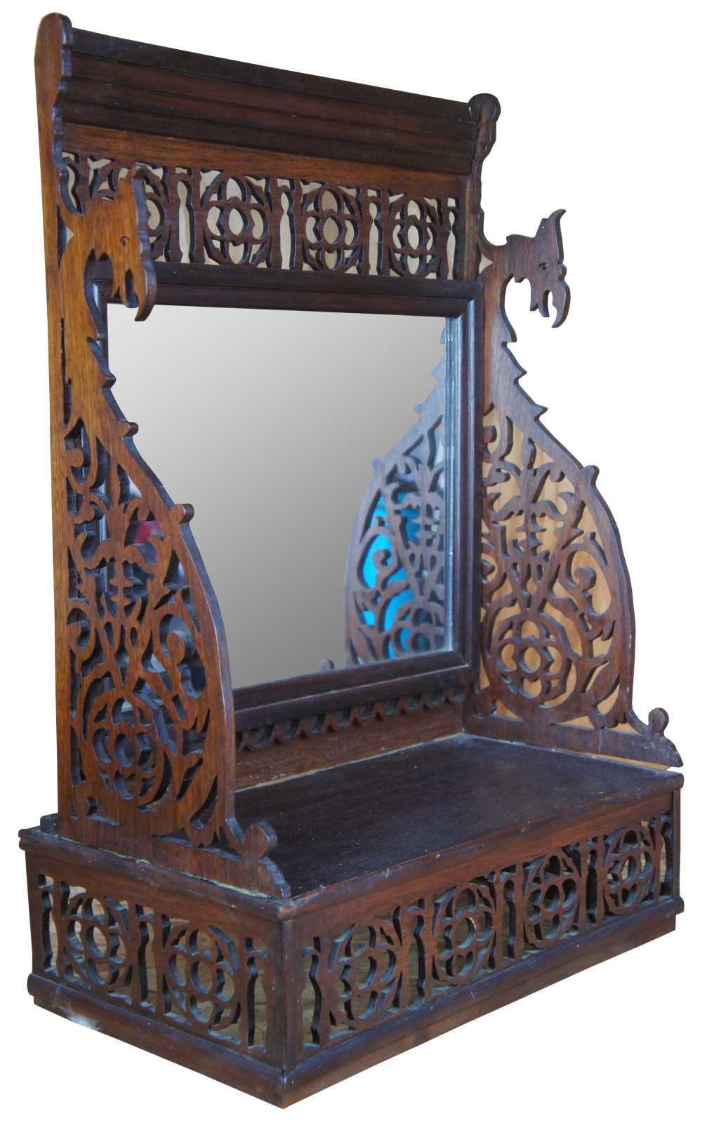 antique reticulated or pierced desktop vanity mirror with shelf. Features ornate carvings with dragon motif.