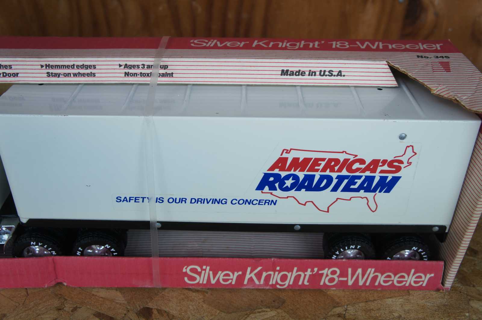Vintage Nylint Silver Knight Americas Roadteam 18 wheeler toy tractor trailer or semi truck. No 345. Unopened, New in Box, NIB.
