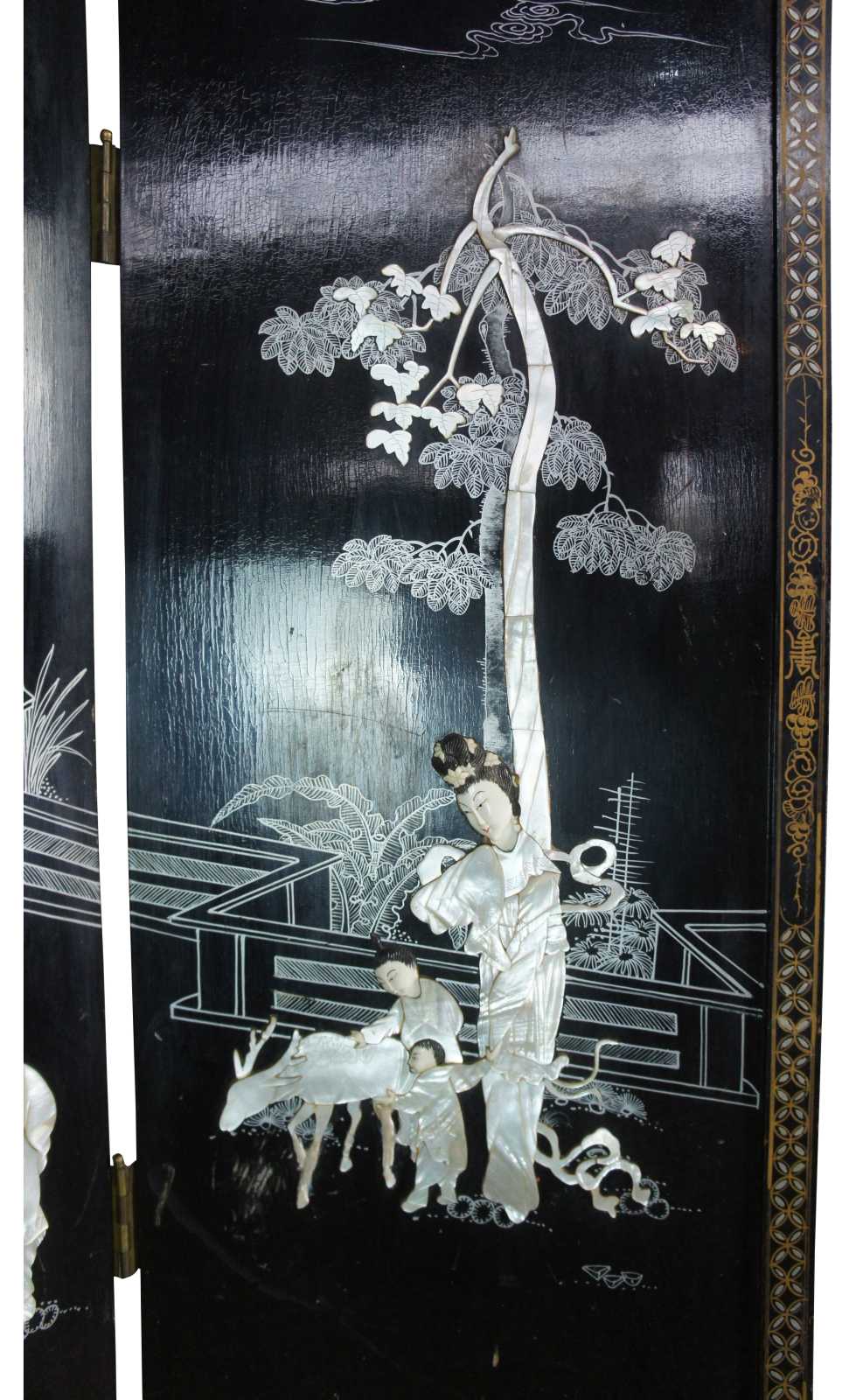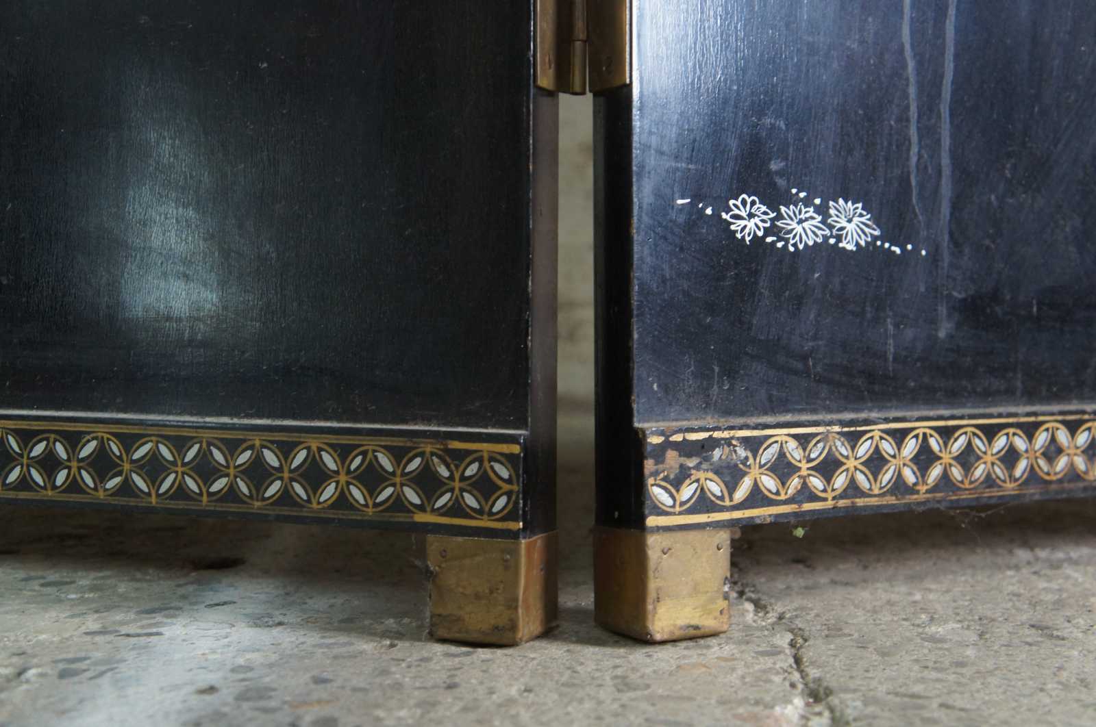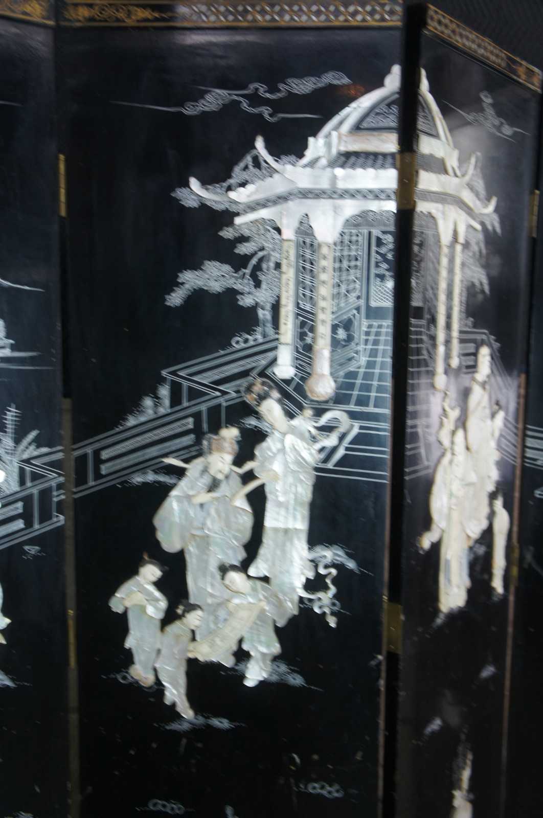 Mid 20th century Chinese four panel wall divider or screen. Made of wood featuring black lacquer with mother of pearl and soapstone landscape sceen of geishas with children and animals outside of a pagoda or temple. Accented with decorative gold border and reverse side depicting floral motif. Screen rest on lacquered brass block feet.