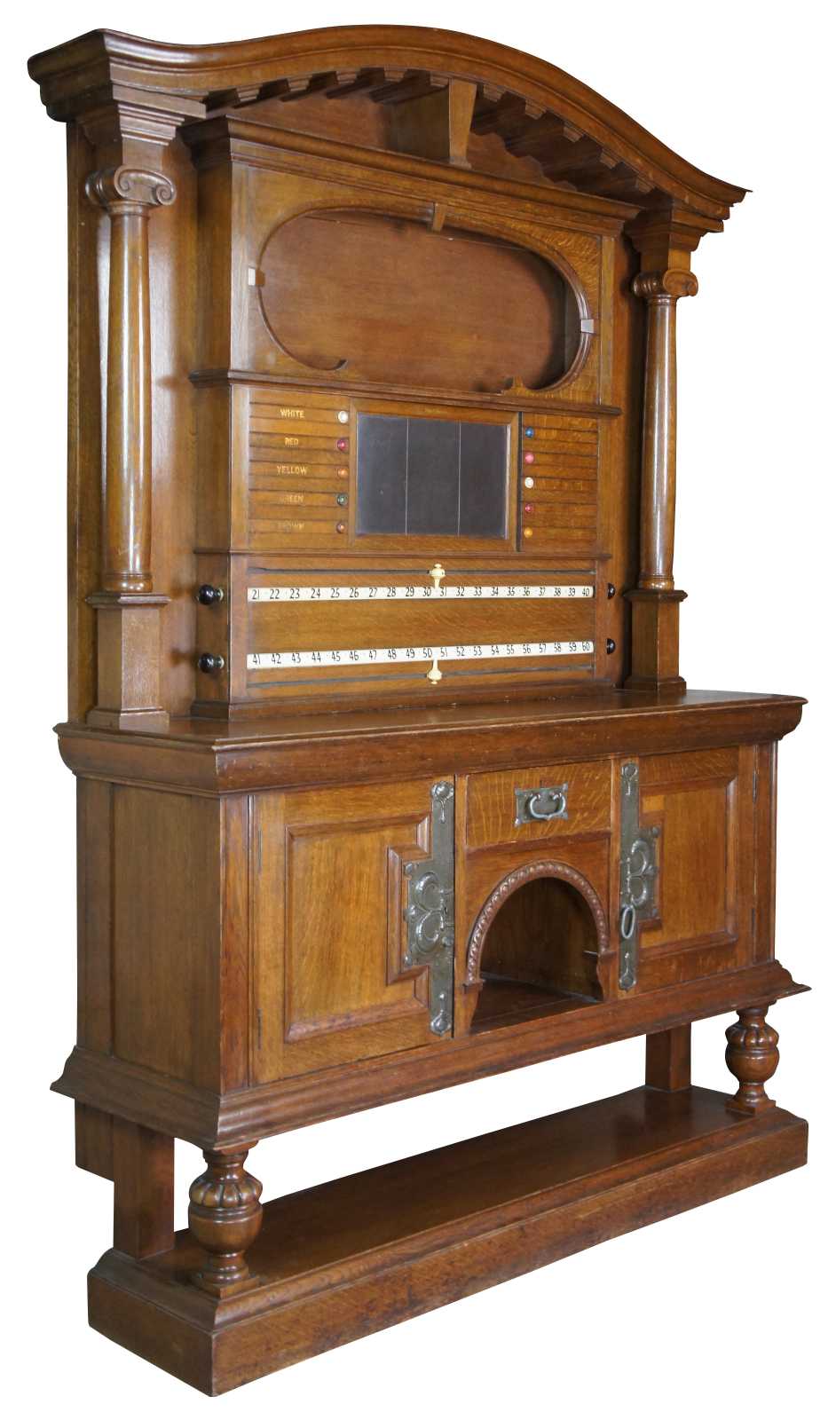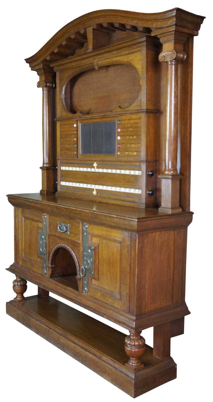 Rare and Impressive antique 19th century Jacobean Revival Orme & Sons billiards / snooker / pool scoreboard. Made of oak featuring domed top with turned posts and locking storage compartments / cabinets / drawers.