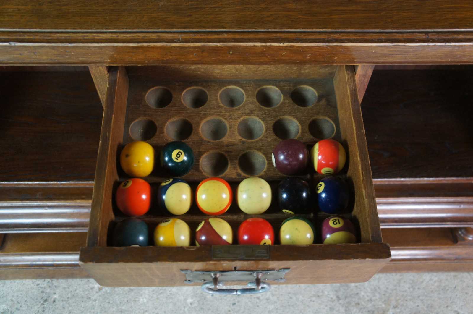Good Antique Condition; Lower left cabinet missing ring pull, 16 balls included.