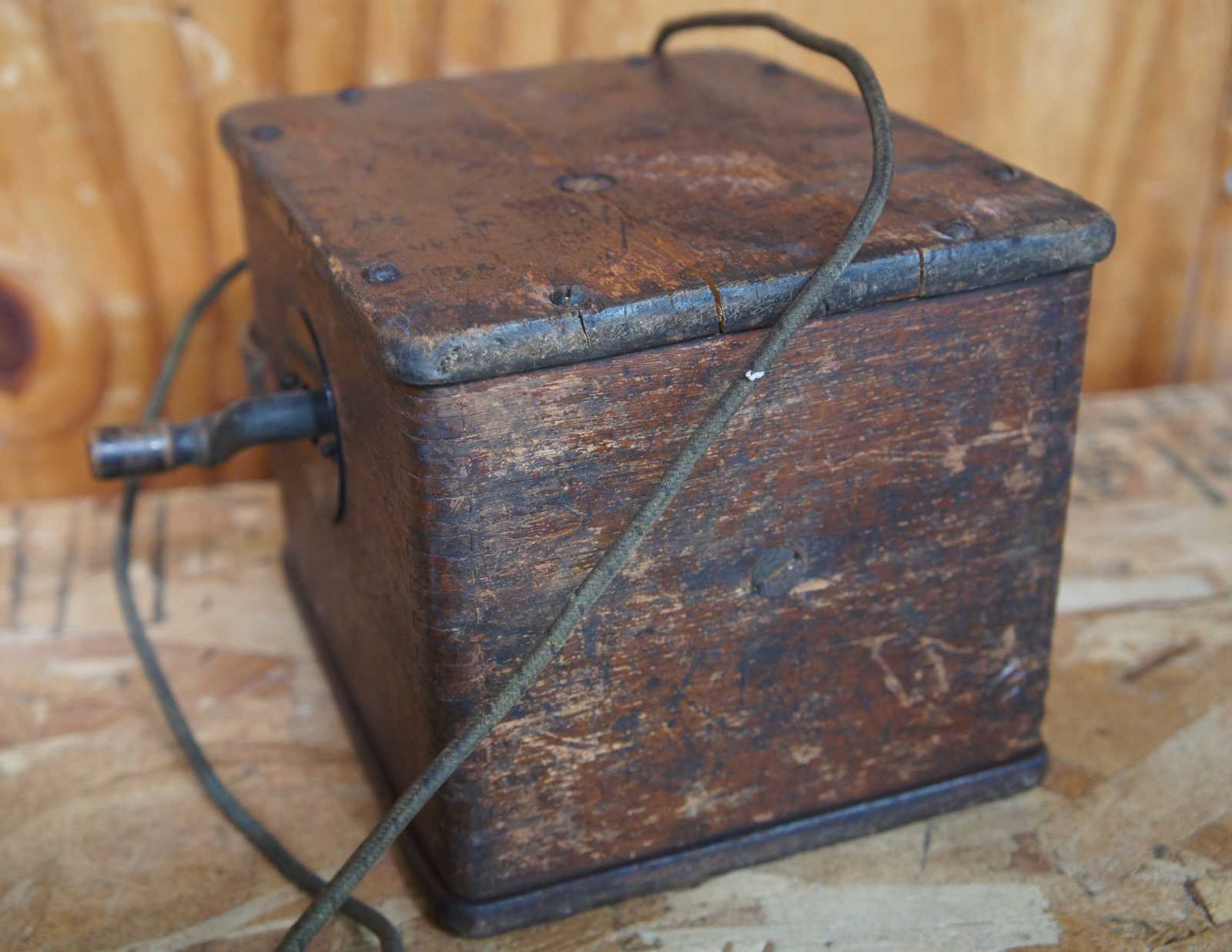 Antique Western Electric Magneto. Features an oak case with fingertailed dovetailing, hand crank and wires.