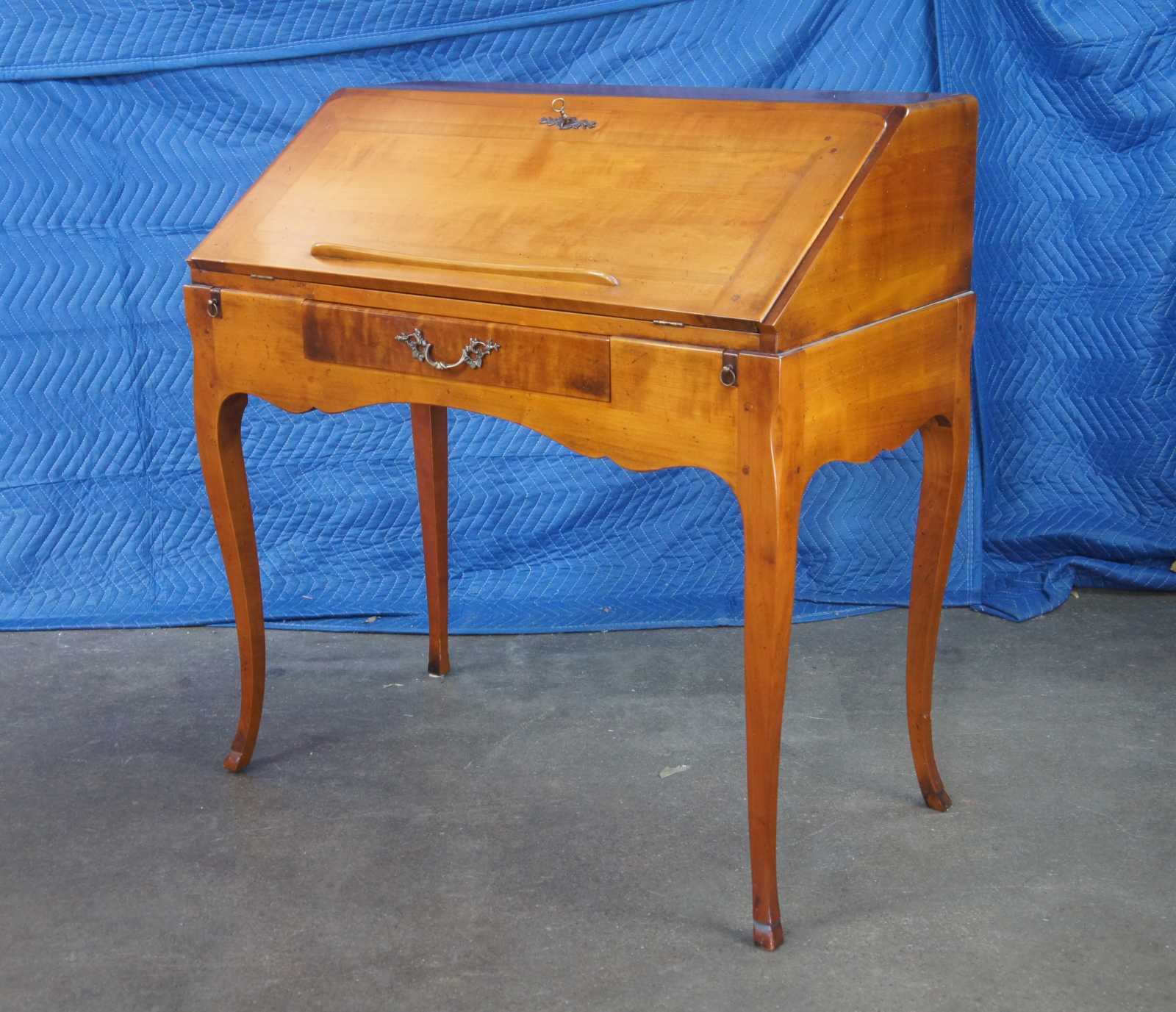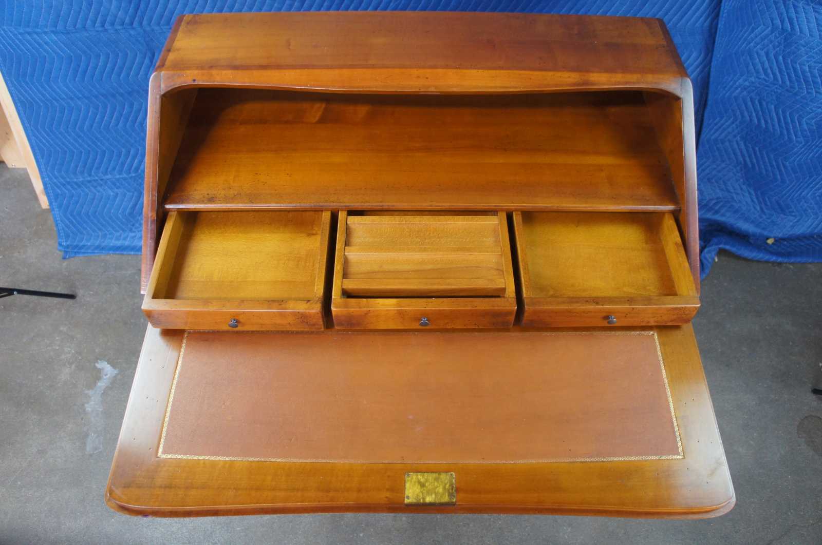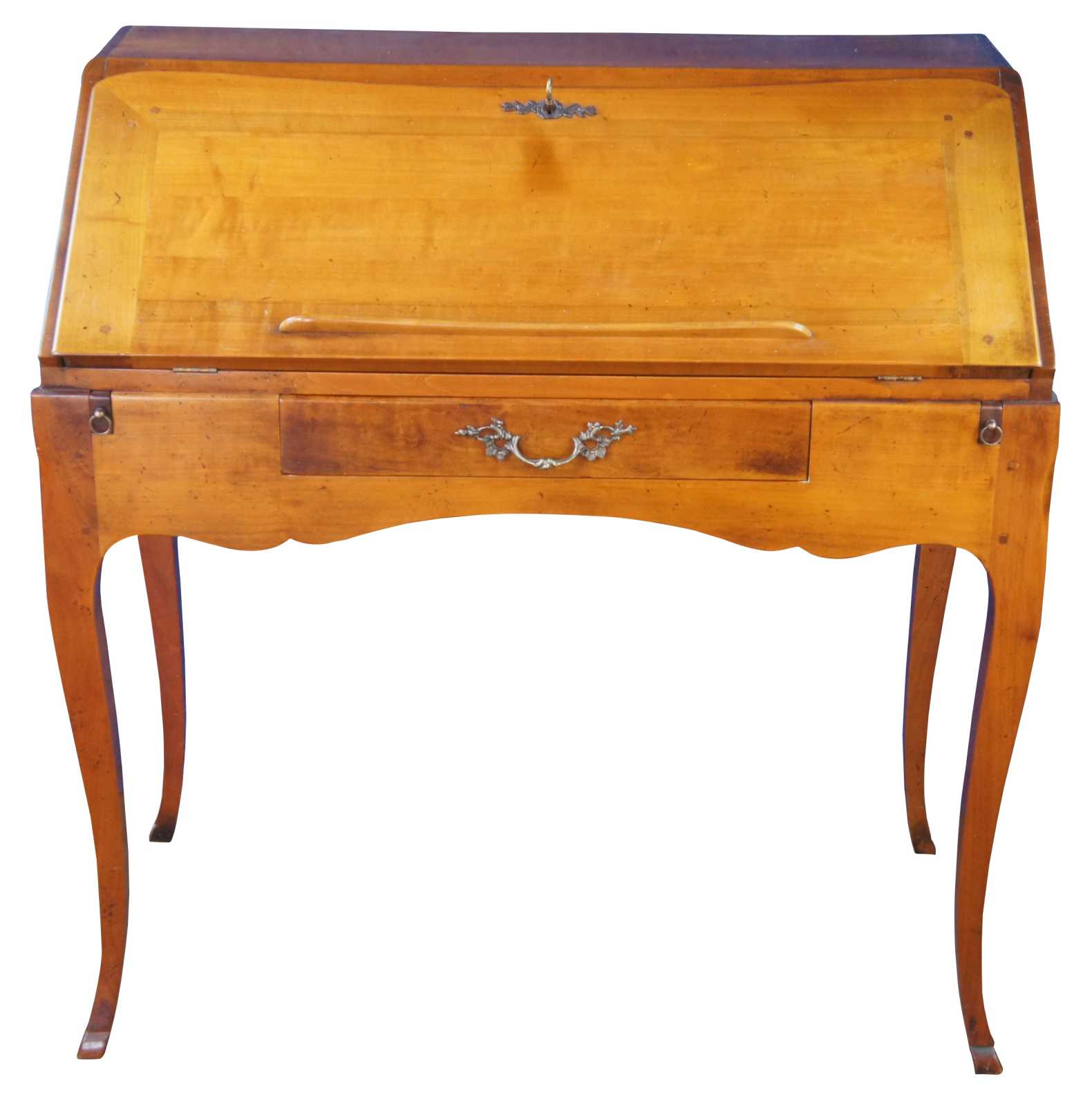 A magnificent 20th Century French Provincial Bureau De Dame. Burea de Dame translates to ladies office. A writing desk that is often petite yet functional. Made of maple with a serpentine form and lockable drop front featuring a book or music rest that opens to a leather top with three drawers. The case is centered by a large dovetailed drawer with ornate brass hardware and supported by long tapered cabriole legs.